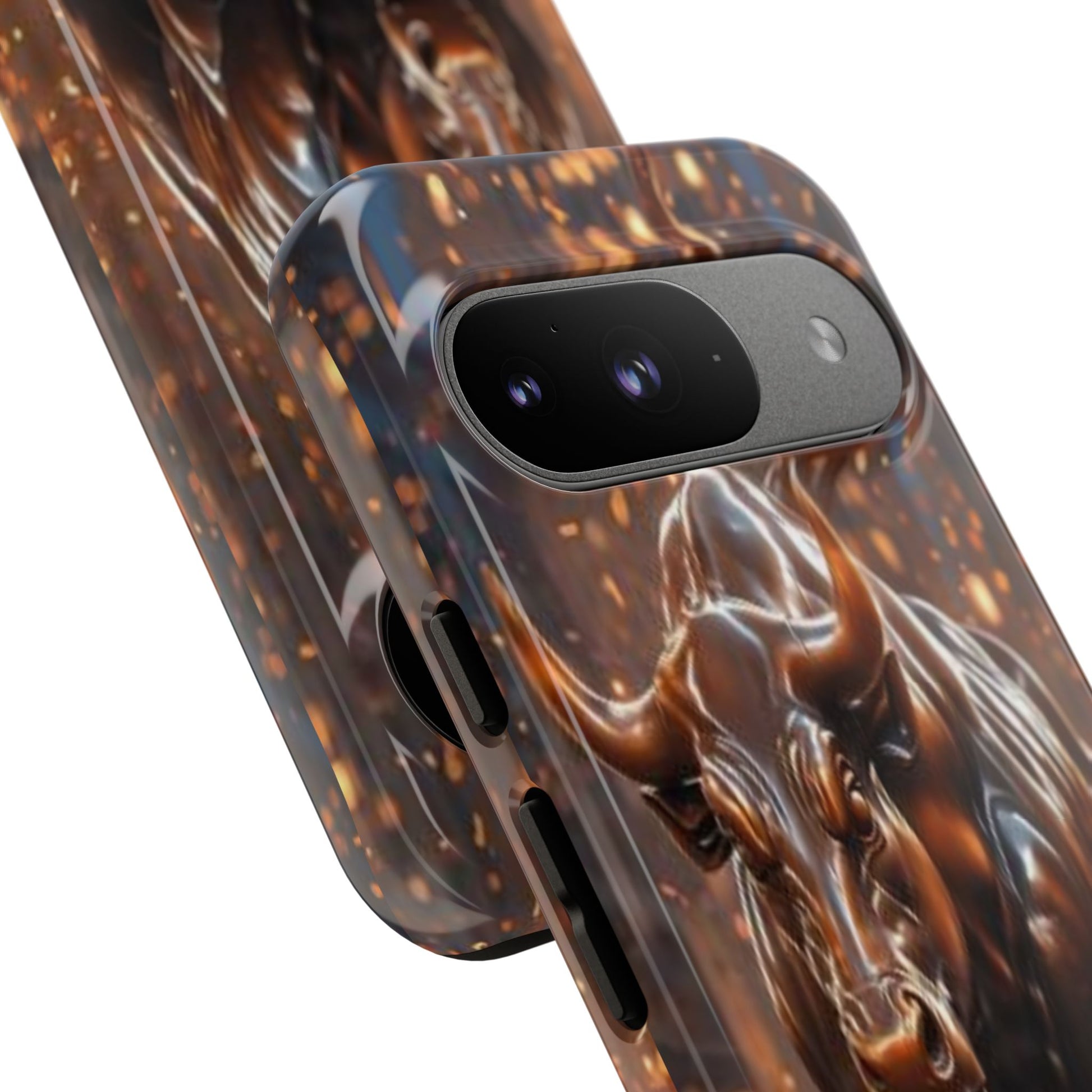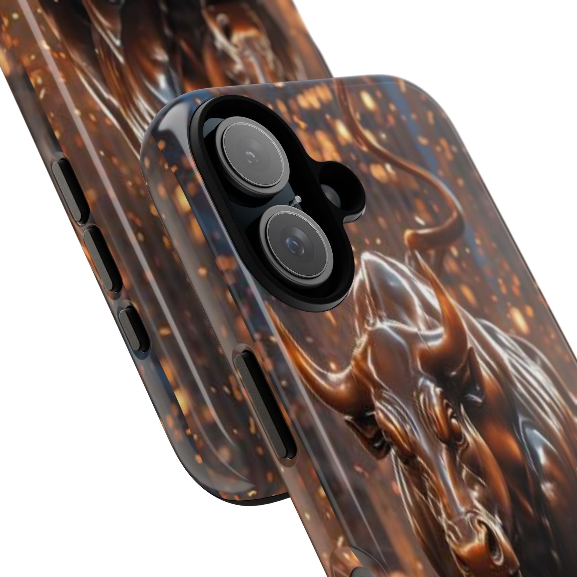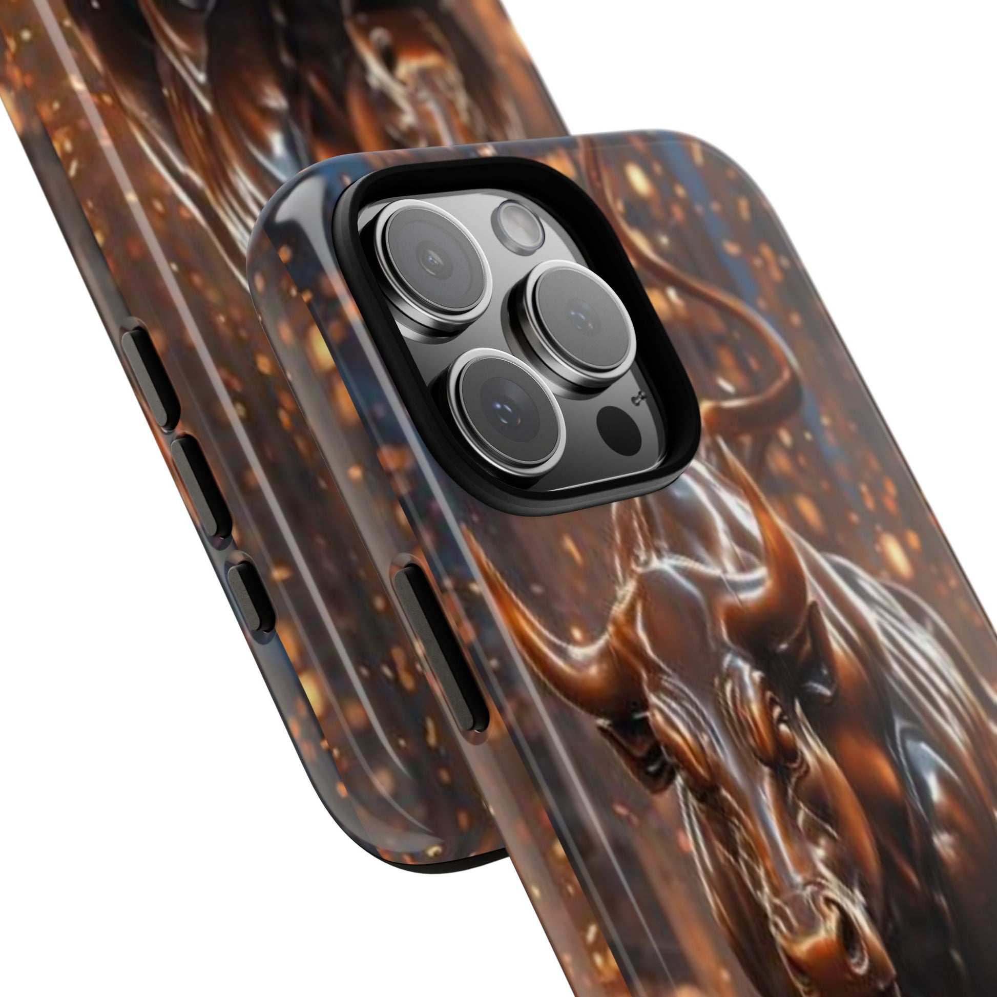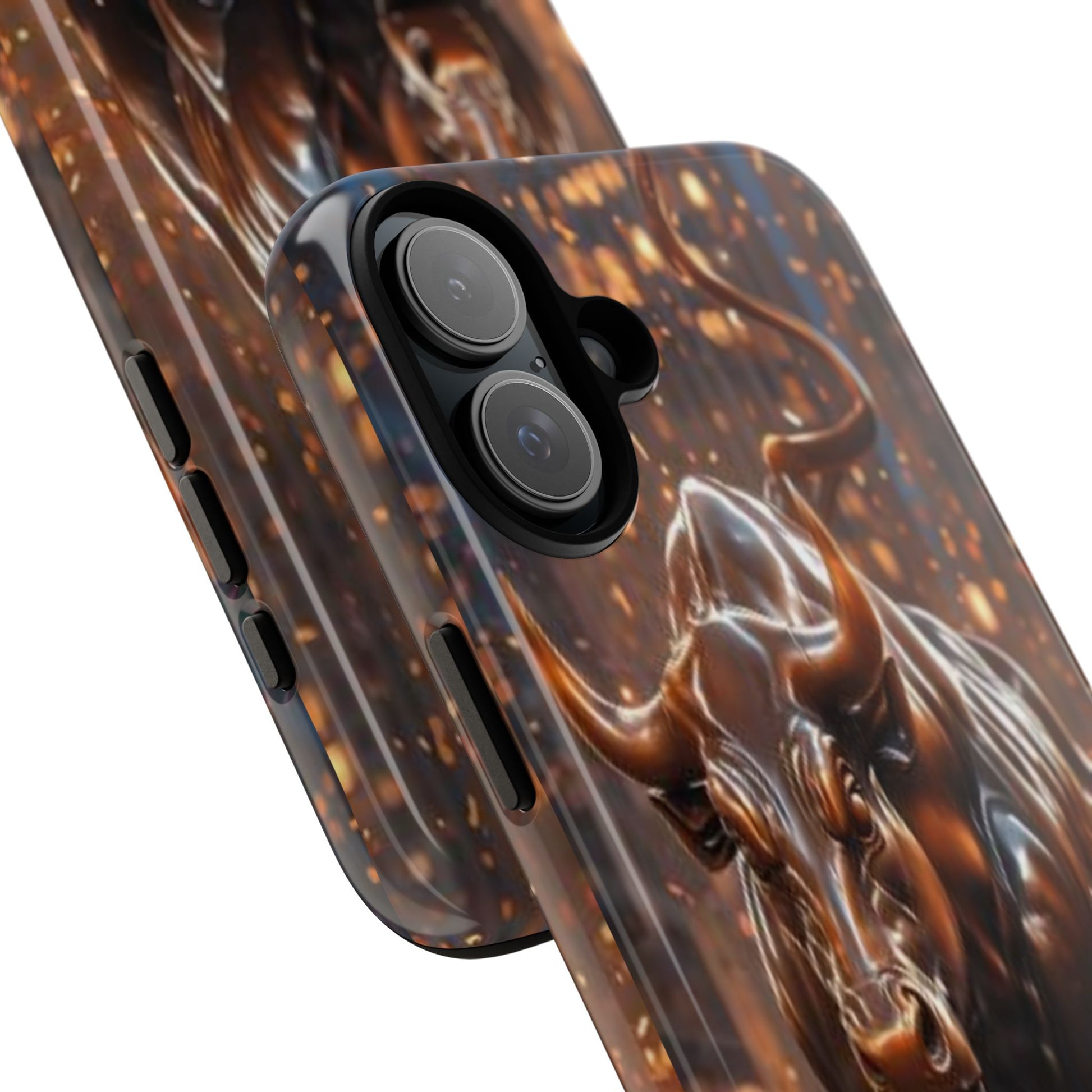 This protective phone case carries an intense, forward-driving energy — a sculpted bull charging through a cascade of glowing sparks. The 3D wrap print gives the image depth and movement, so the design reads like a miniature scene every time you glance at your phone. Built as a dual-layer case with a hard polycarbonate shell and a soft TPU silicone liner, it cushions drops and absorbs shocks while keeping ports clear and wireless charging functional. Its UV-resistant finish preserves the rich bronze tones and highlights, so the artwork keeps its glow even with outdoor use. For those who live boldly — traders, athletes, or anyone who appreciates strong symbolism — this case turns a daily essential into a statement piece that ages with resilience, not wear.