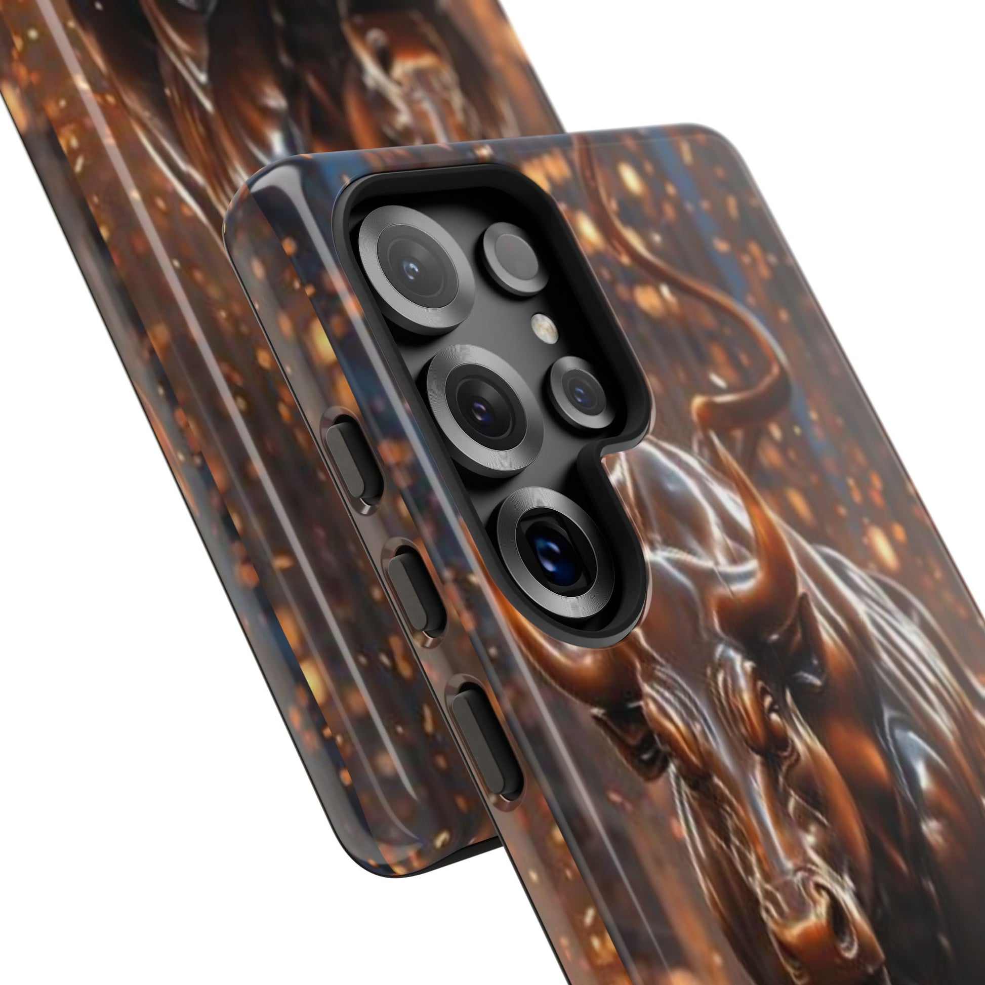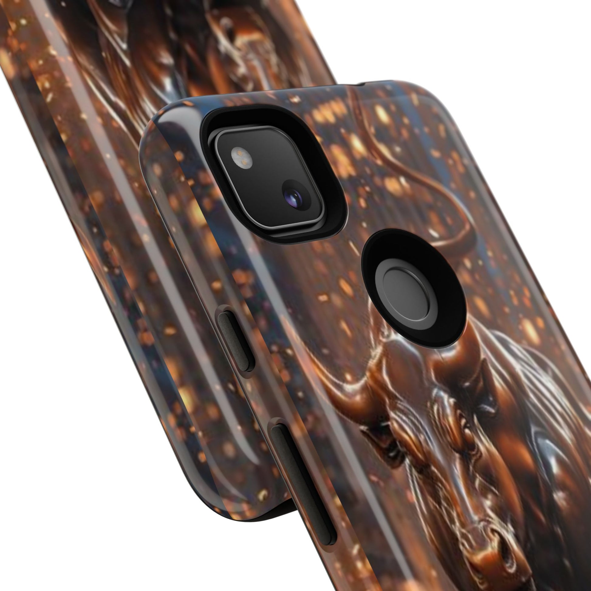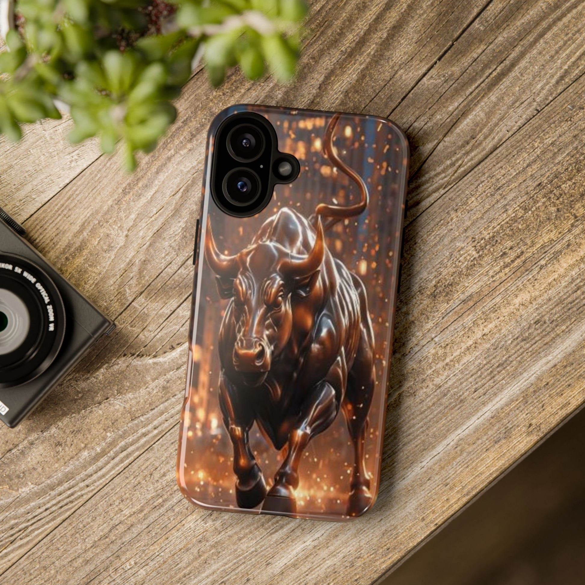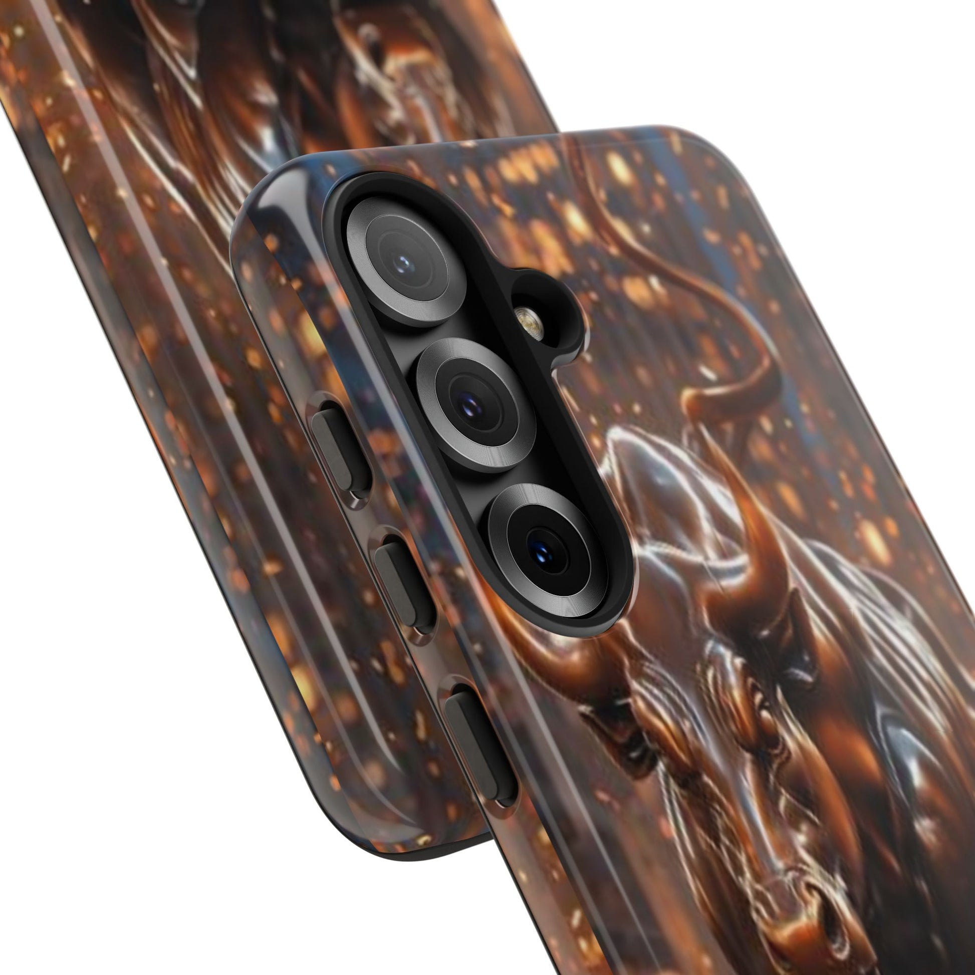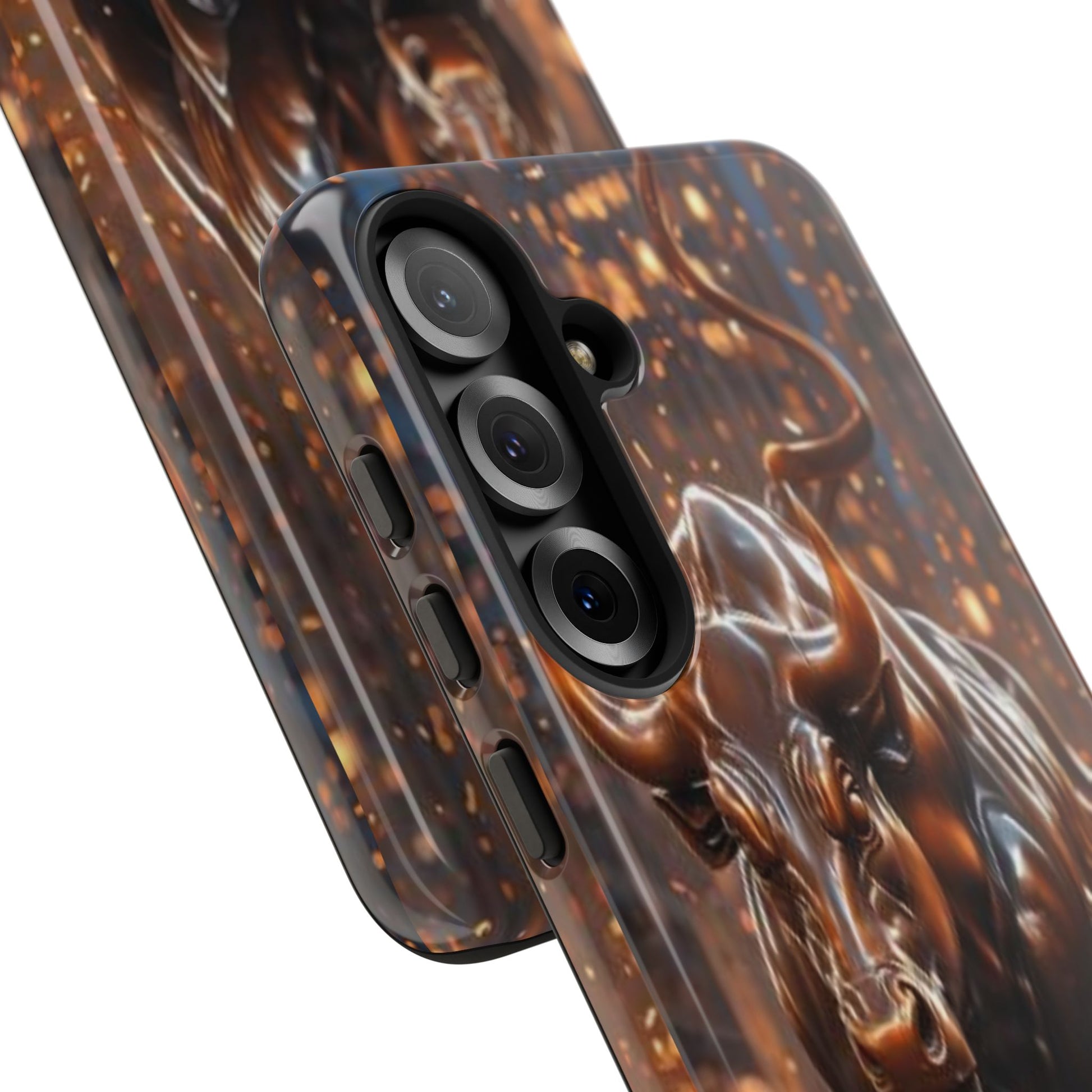 This protective phone case carries an intense, forward-driving energy — a sculpted bull charging through a cascade of glowing sparks. The 3D wrap print gives the image depth and movement, so the design reads like a miniature scene every time you glance at your phone. Built as a dual-layer case with a hard polycarbonate shell and a soft TPU silicone liner, it cushions drops and absorbs shocks while keeping ports clear and wireless charging functional. Its UV-resistant finish preserves the rich bronze tones and highlights, so the artwork keeps its glow even with outdoor use. For those who live boldly — traders, athletes, or anyone who appreciates strong symbolism — this case turns a daily essential into a statement piece that ages with resilience, not wear.