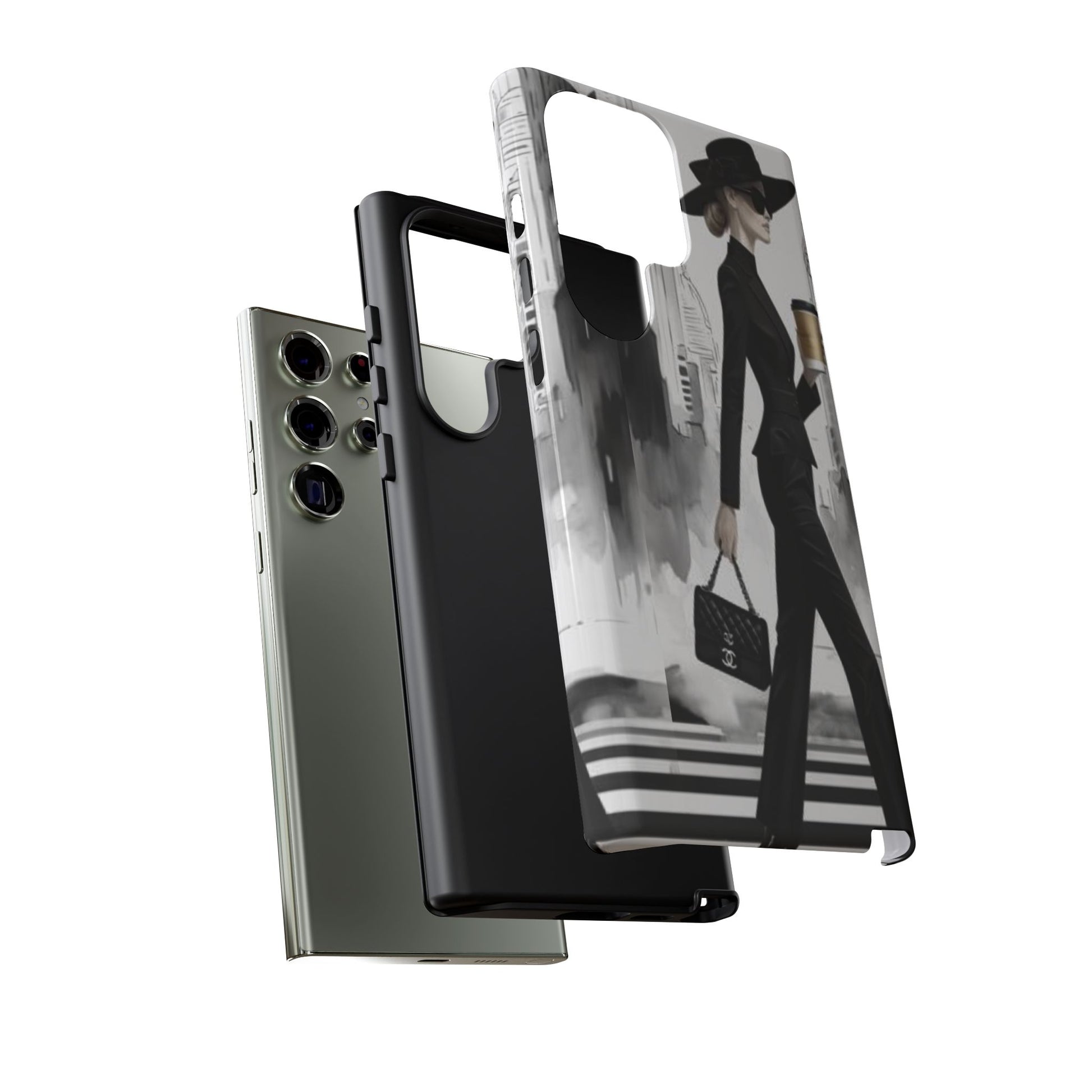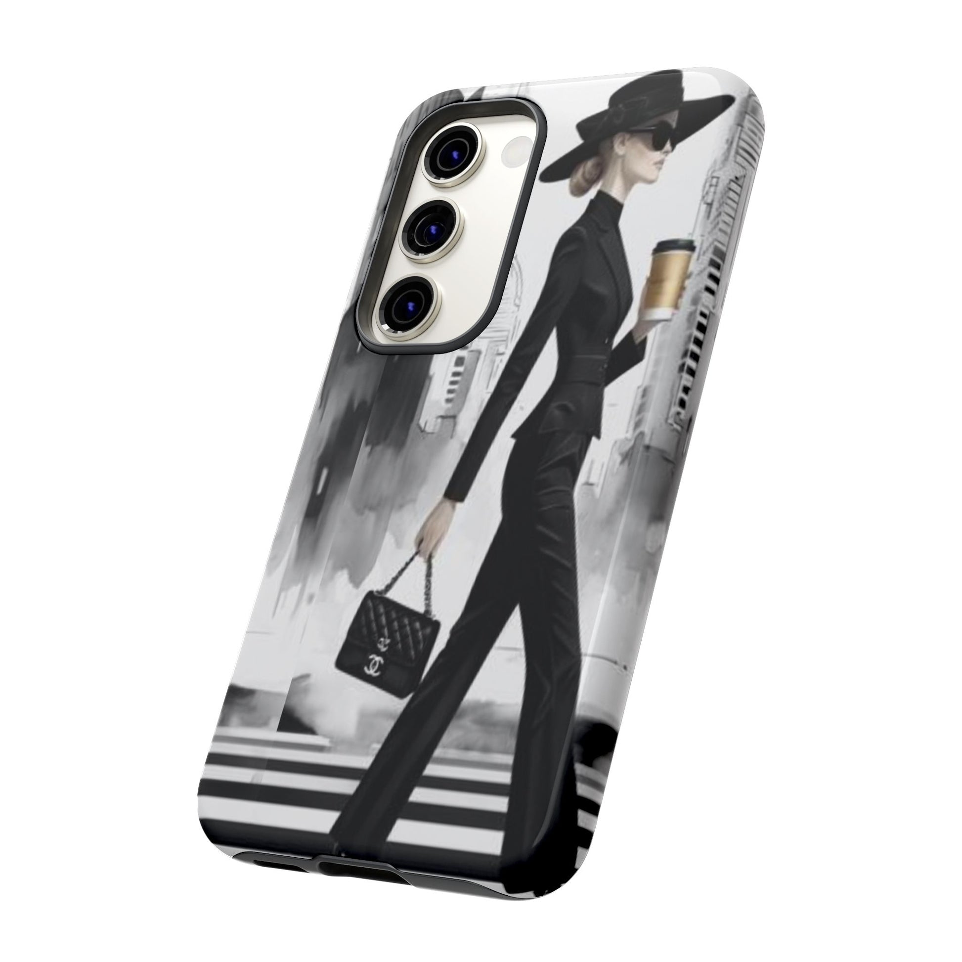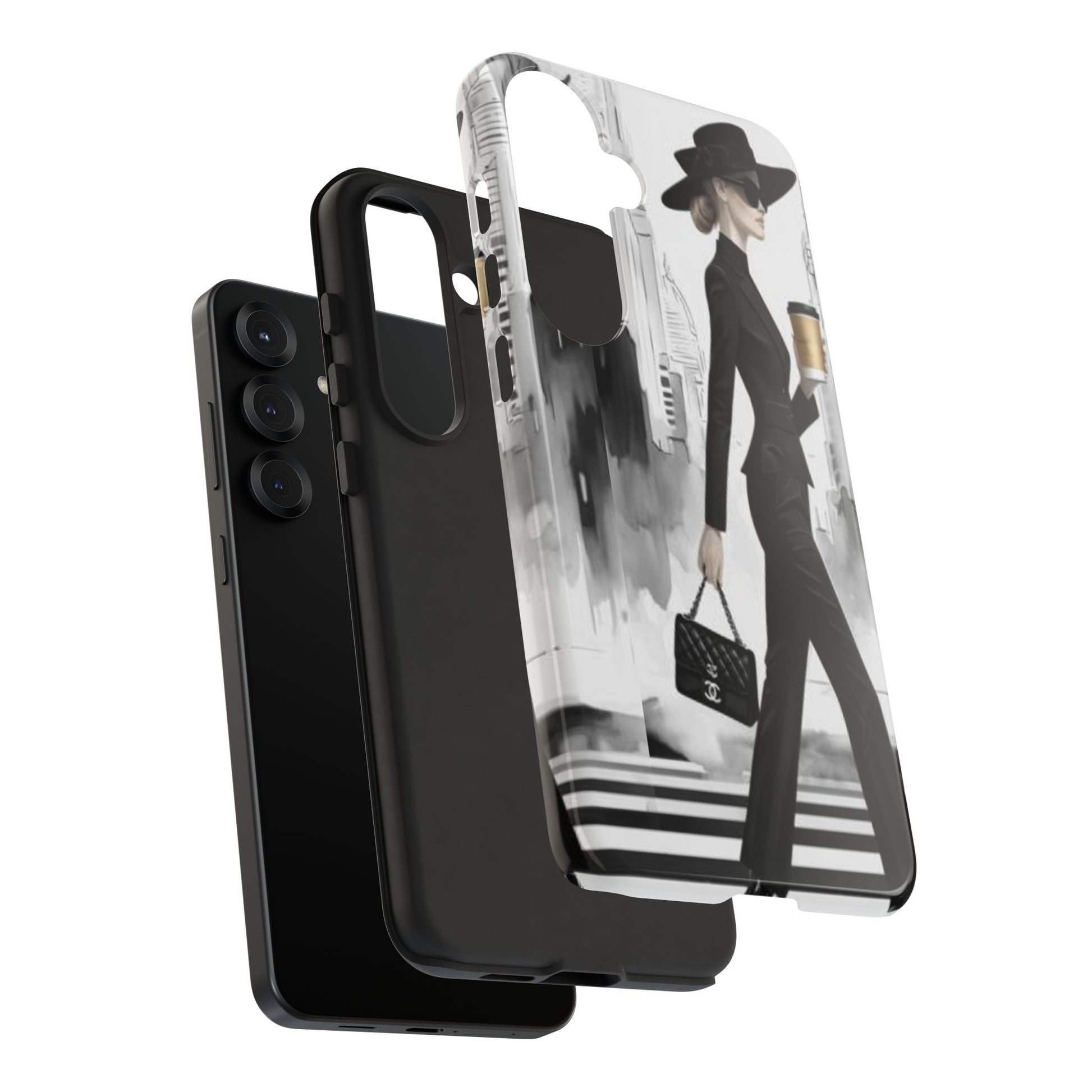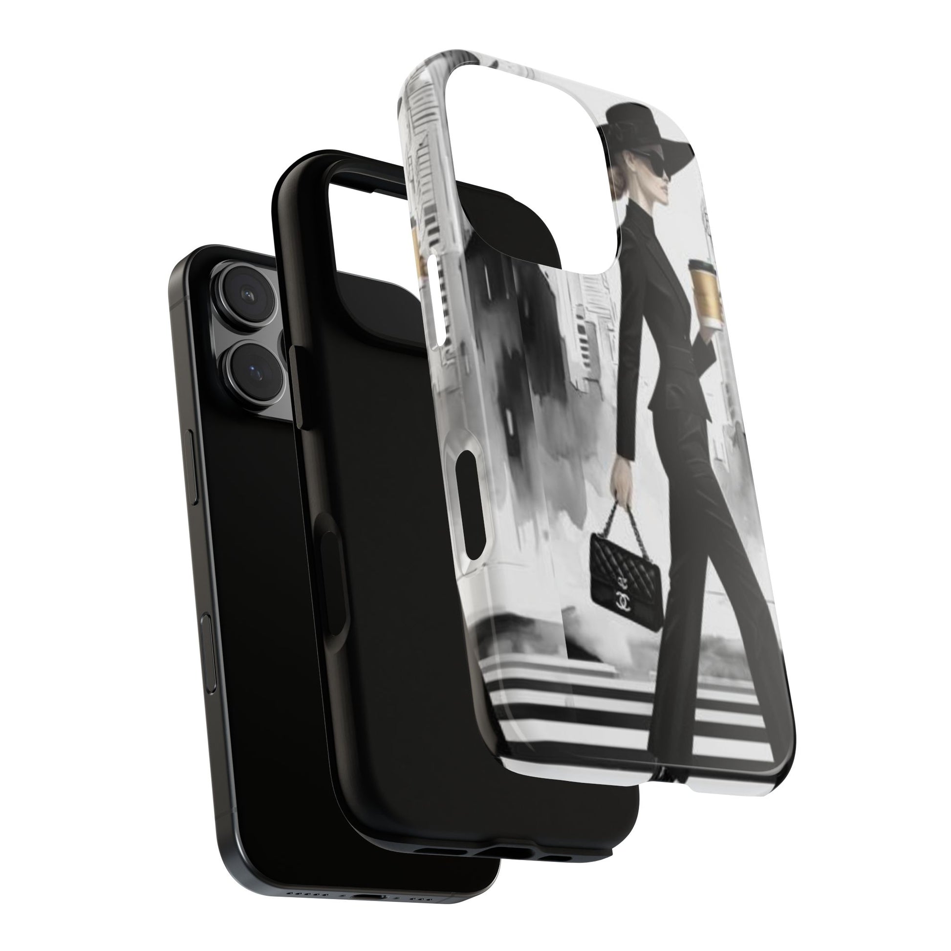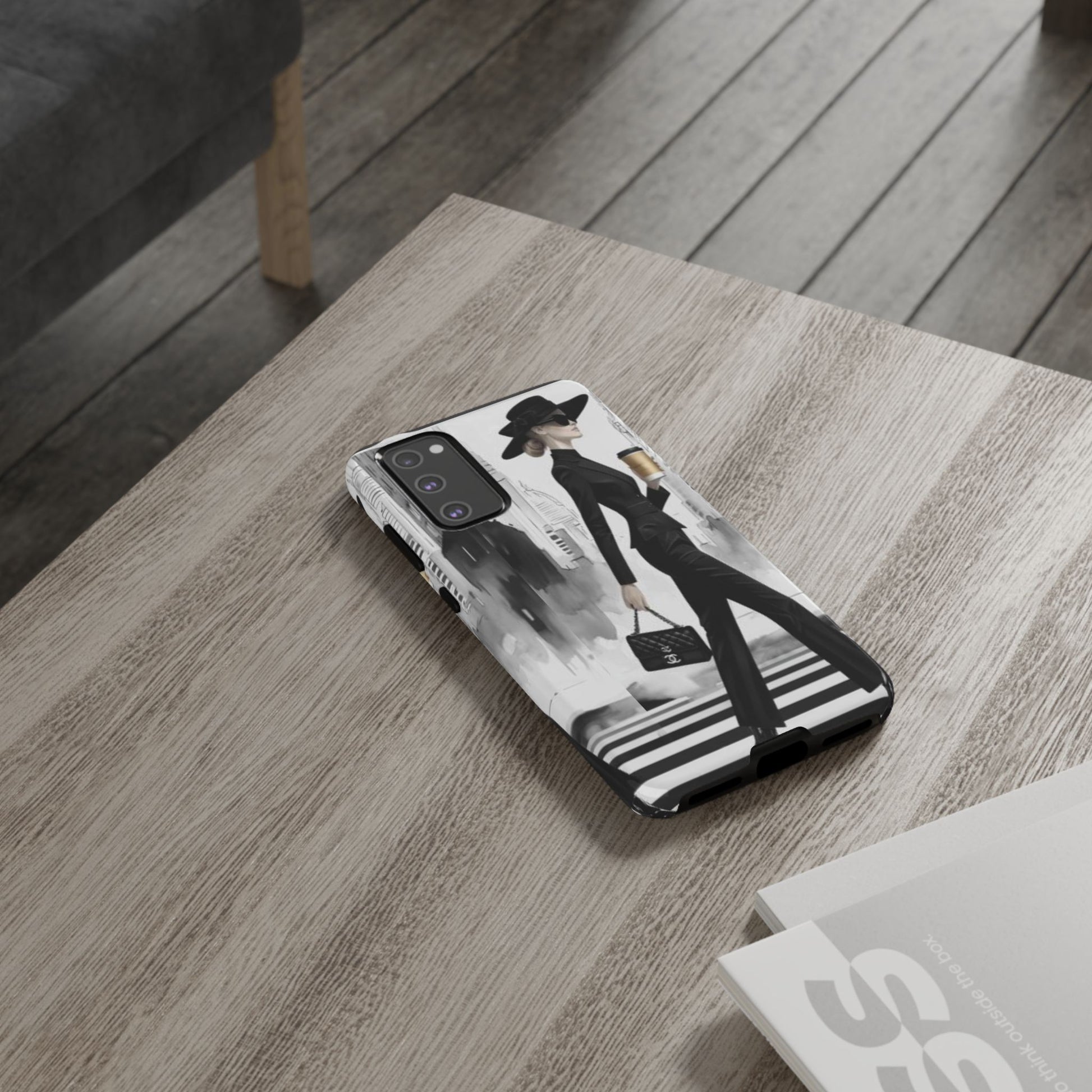 A sleek, protective phone case that marries city-chic style with dependable defense. The monochrome fashion illustration — a poised woman in a wide-brim hat, tailored suit, and designer handbag — wraps the case in a high-contrast, editorial look. Smooth matte or glossy finishes keep the artwork crisp while the dual-layer polycarbonate shell and TPU silicone liner absorb shocks and protect against everyday drops. Lightweight and slim, it slips into a bag or hand with ease, while clear port openings maintain full connectivity and wireless charging compatibility. Thoughtful durability and certified materials mean this case performs outdoors and on the go, keeping that metropolitan, café-to-meeting aesthetic intact.