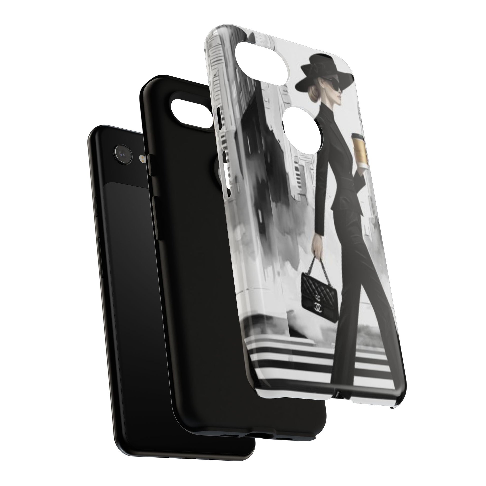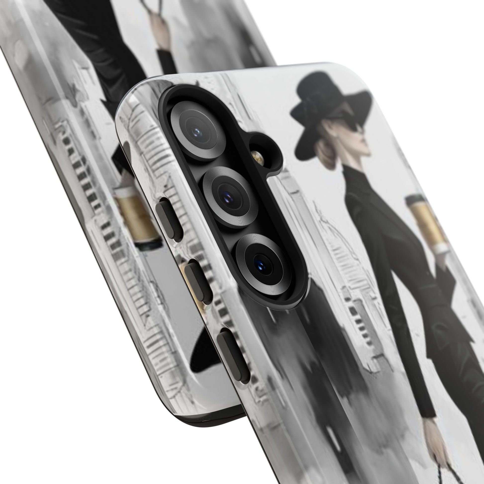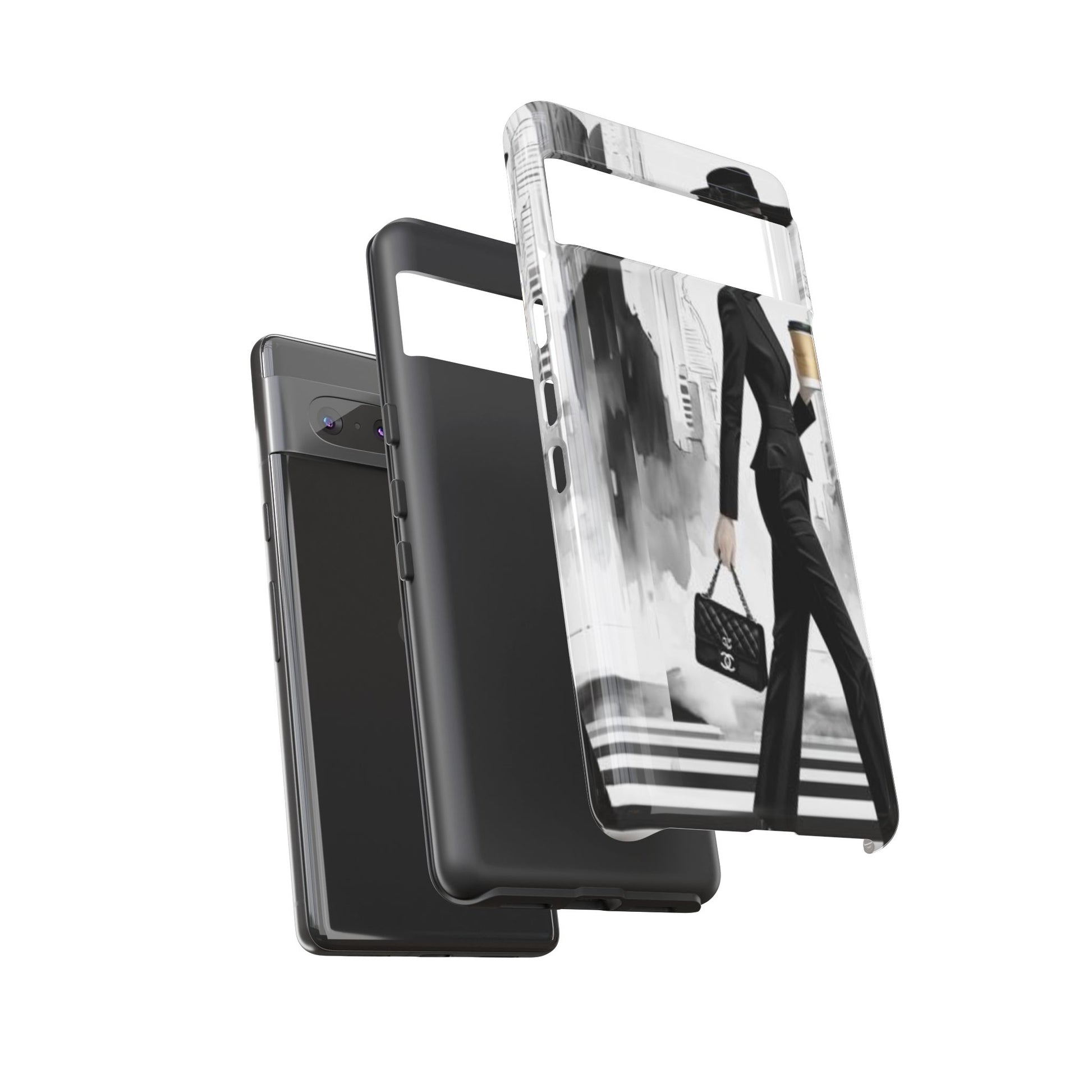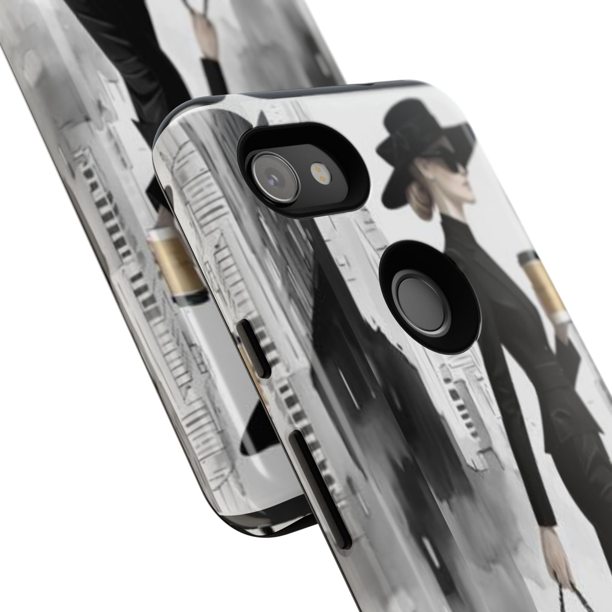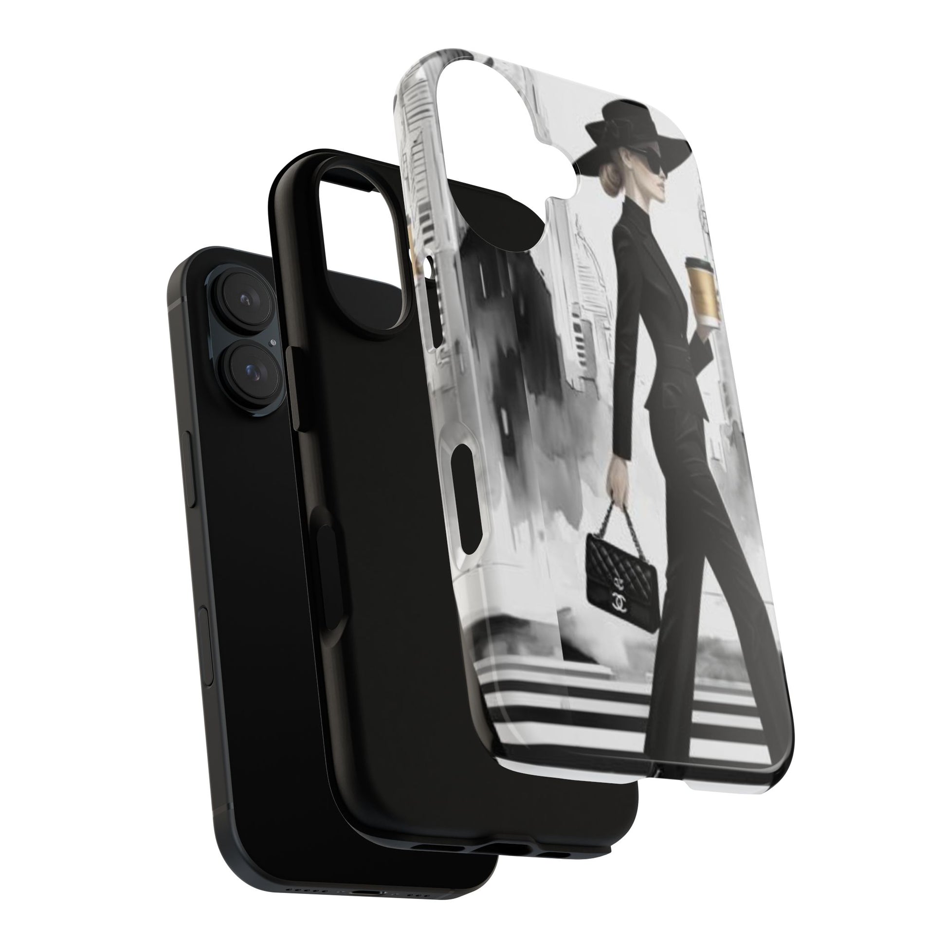 A sleek, protective phone case that marries city-chic style with dependable defense. The monochrome fashion illustration — a poised woman in a wide-brim hat, tailored suit, and designer handbag — wraps the case in a high-contrast, editorial look. Smooth matte or glossy finishes keep the artwork crisp while the dual-layer polycarbonate shell and TPU silicone liner absorb shocks and protect against everyday drops. Lightweight and slim, it slips into a bag or hand with ease, while clear port openings maintain full connectivity and wireless charging compatibility. Thoughtful durability and certified materials mean this case performs outdoors and on the go, keeping that metropolitan, café-to-meeting aesthetic intact.