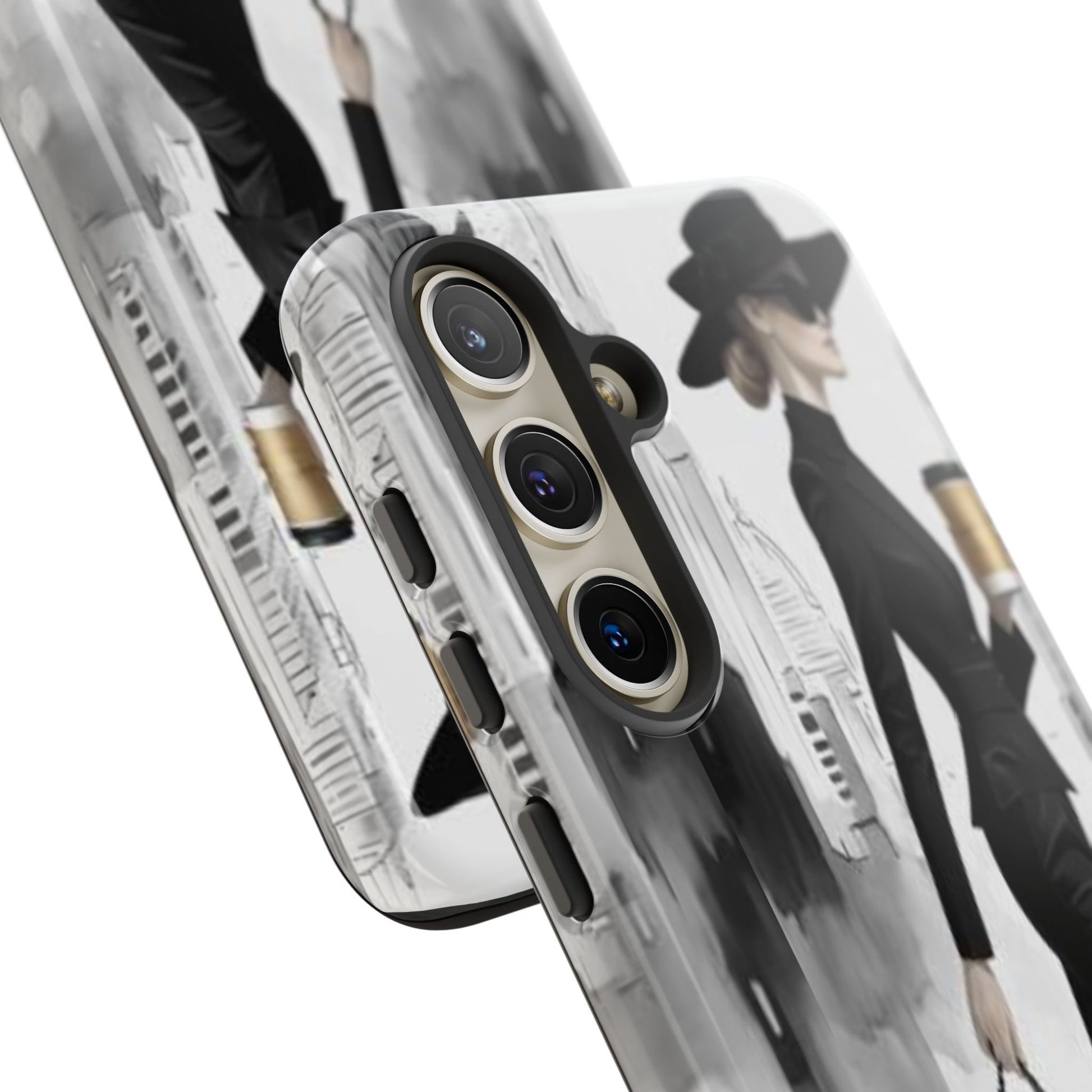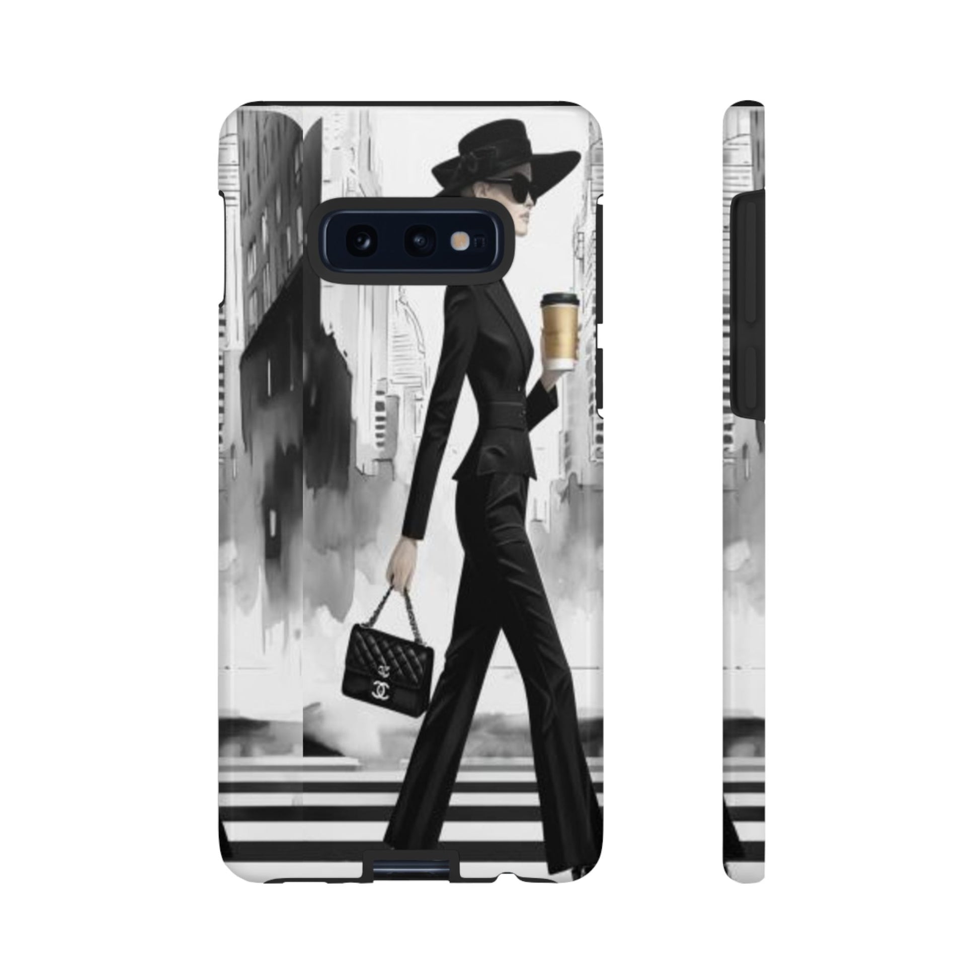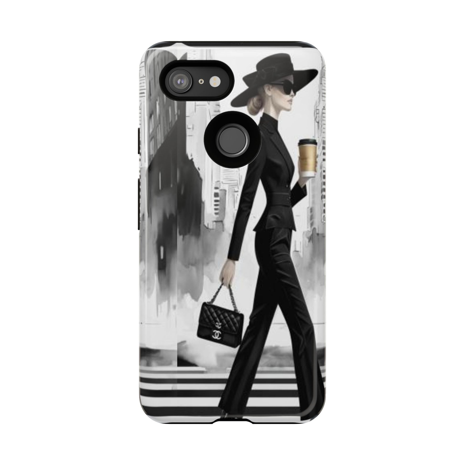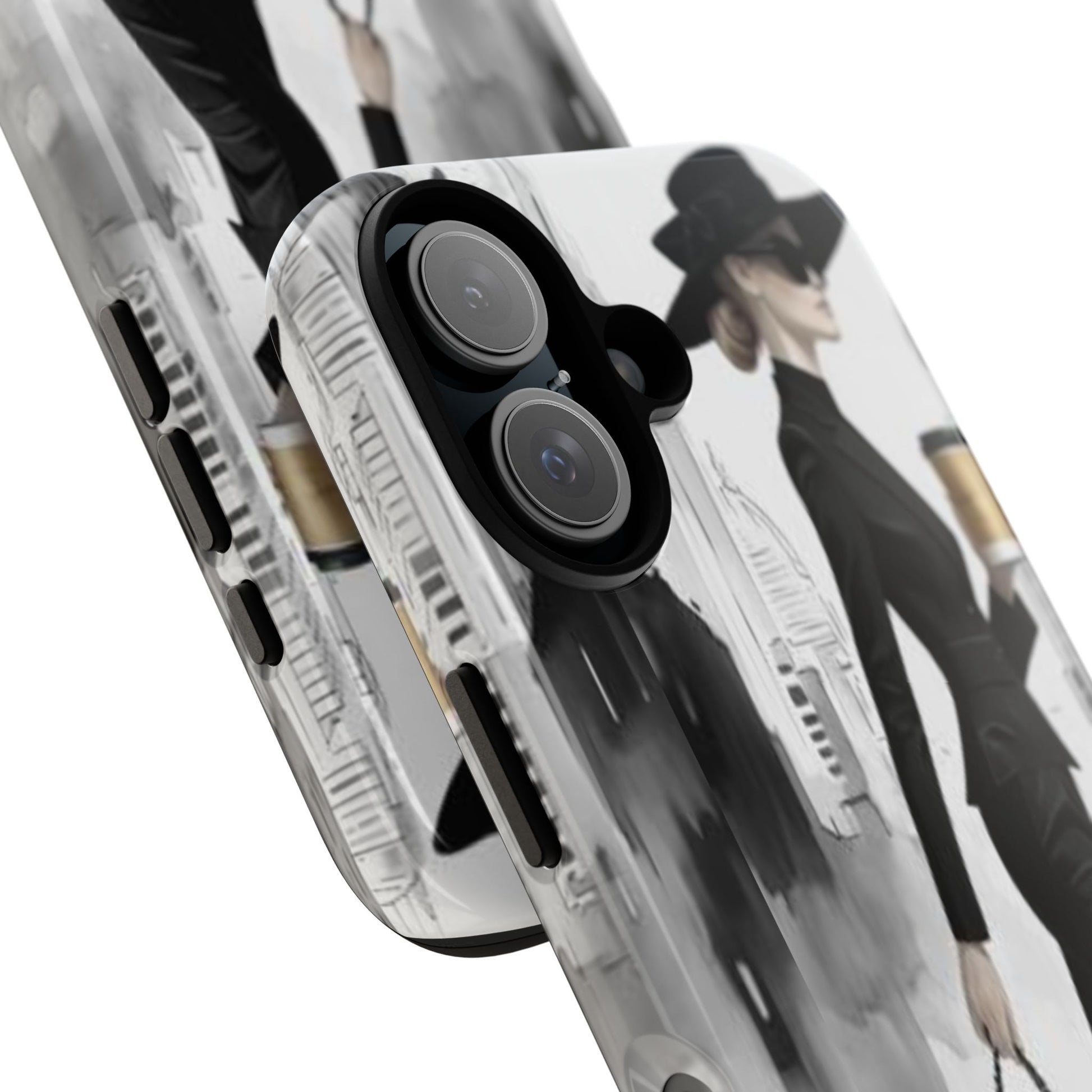 A sleek, protective phone case that marries city-chic style with dependable defense. The monochrome fashion illustration — a poised woman in a wide-brim hat, tailored suit, and designer handbag — wraps the case in a high-contrast, editorial look. Smooth matte or glossy finishes keep the artwork crisp while the dual-layer polycarbonate shell and TPU silicone liner absorb shocks and protect against everyday drops. Lightweight and slim, it slips into a bag or hand with ease, while clear port openings maintain full connectivity and wireless charging compatibility. Thoughtful durability and certified materials mean this case performs outdoors and on the go, keeping that metropolitan, café-to-meeting aesthetic intact.