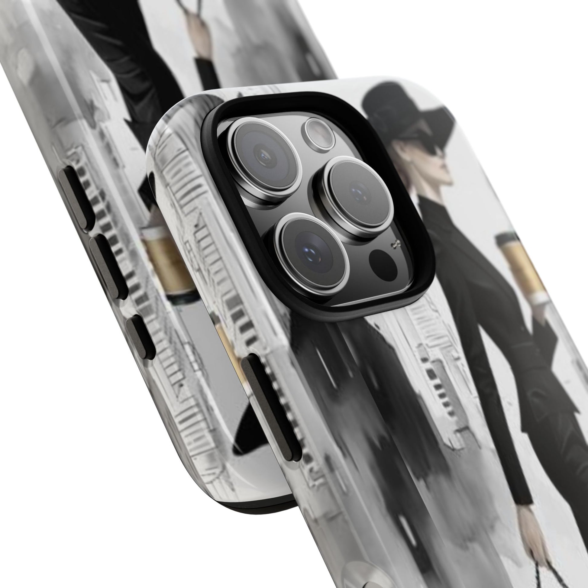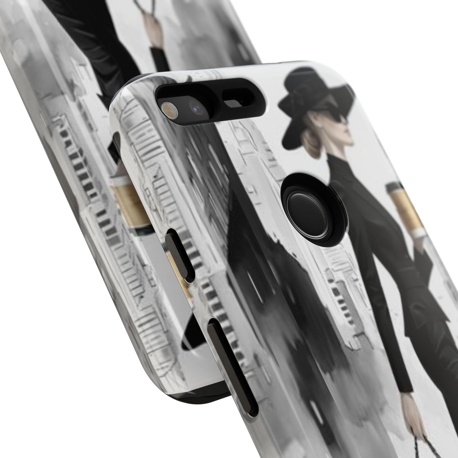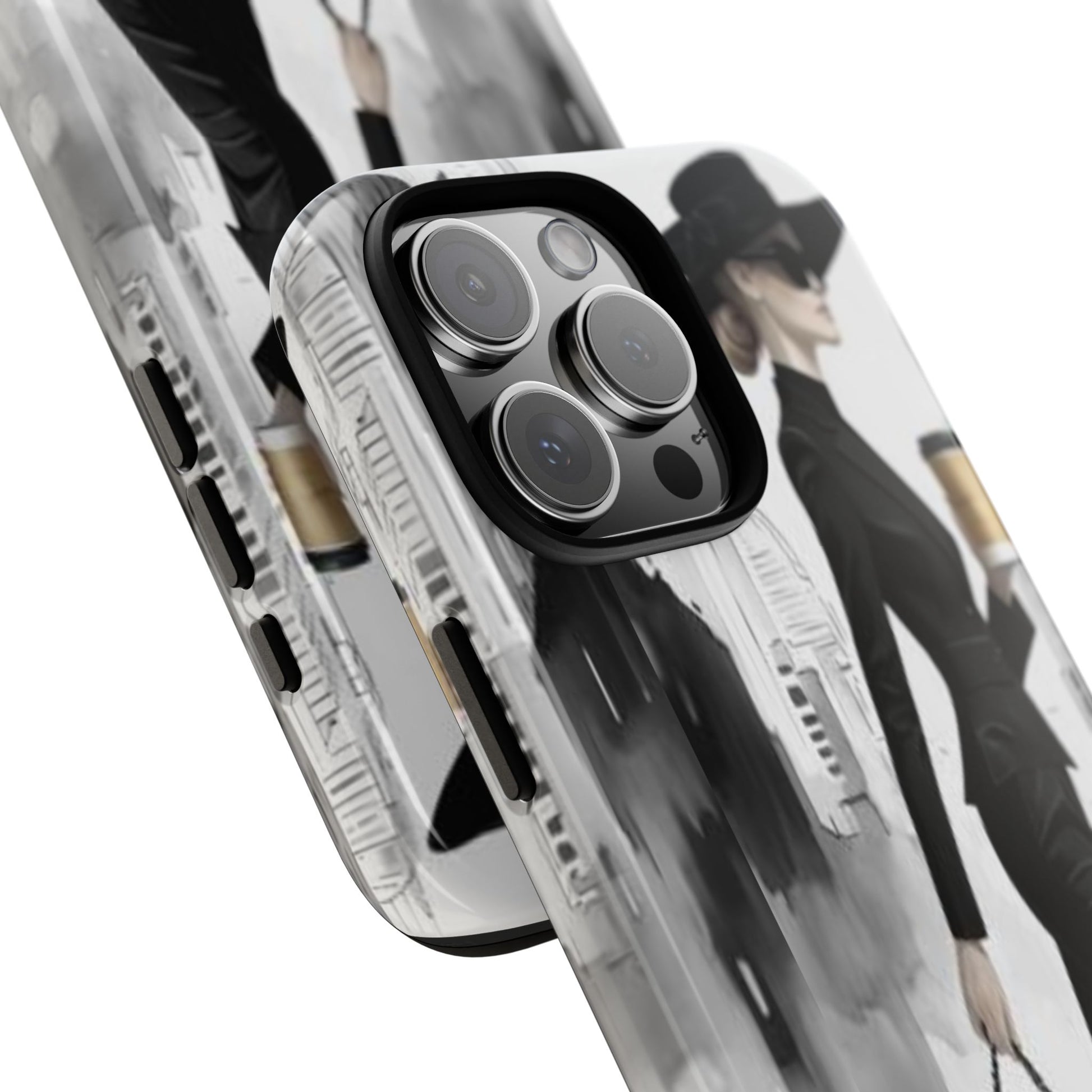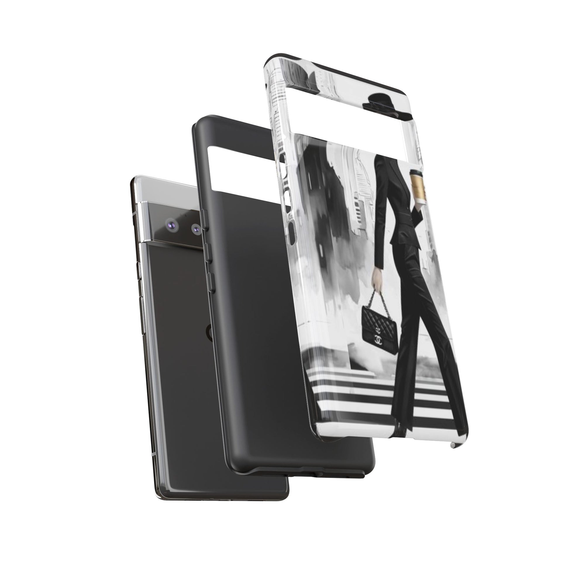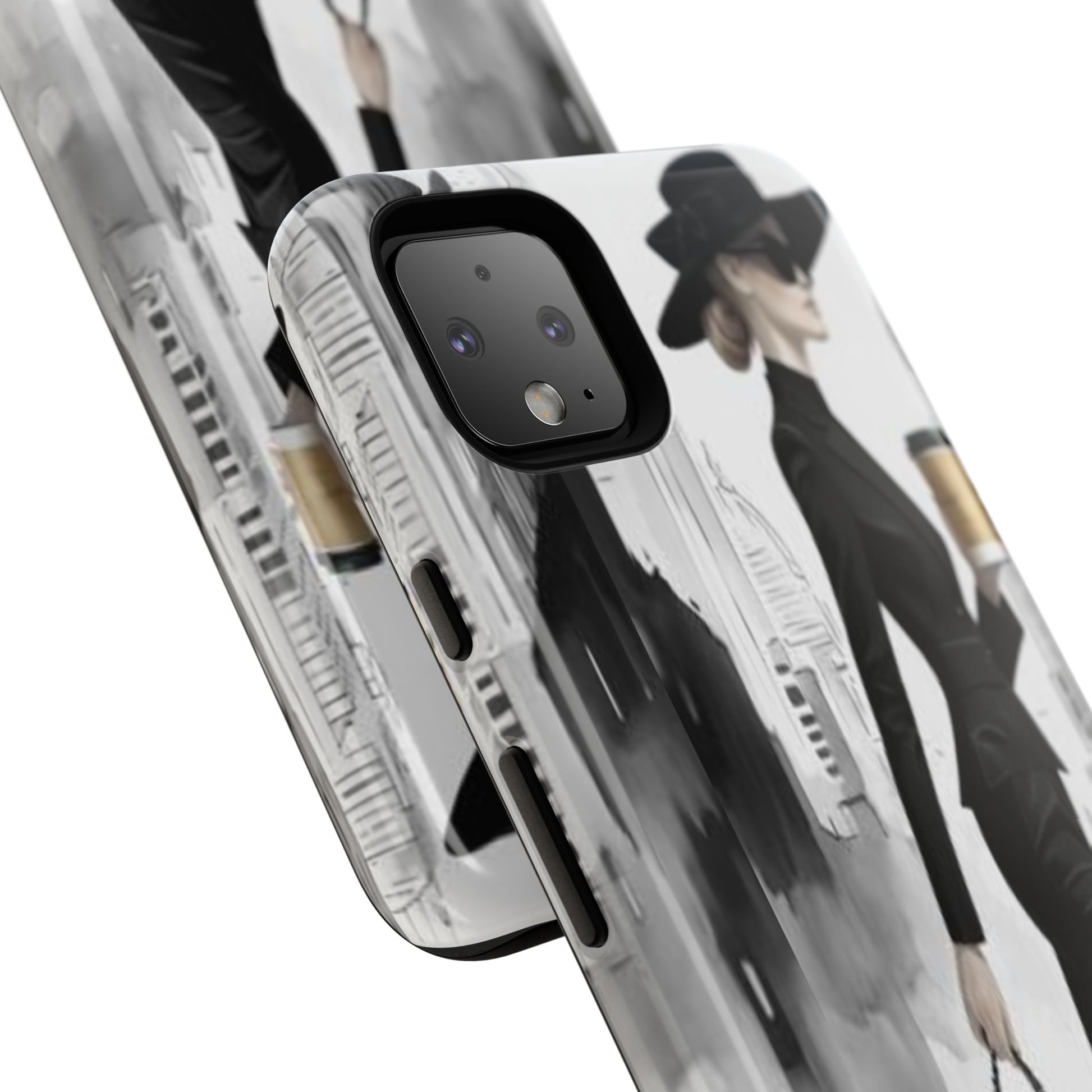 A sleek, protective phone case that marries city-chic style with dependable defense. The monochrome fashion illustration — a poised woman in a wide-brim hat, tailored suit, and designer handbag — wraps the case in a high-contrast, editorial look. Smooth matte or glossy finishes keep the artwork crisp while the dual-layer polycarbonate shell and TPU silicone liner absorb shocks and protect against everyday drops. Lightweight and slim, it slips into a bag or hand with ease, while clear port openings maintain full connectivity and wireless charging compatibility. Thoughtful durability and certified materials mean this case performs outdoors and on the go, keeping that metropolitan, café-to-meeting aesthetic intact.