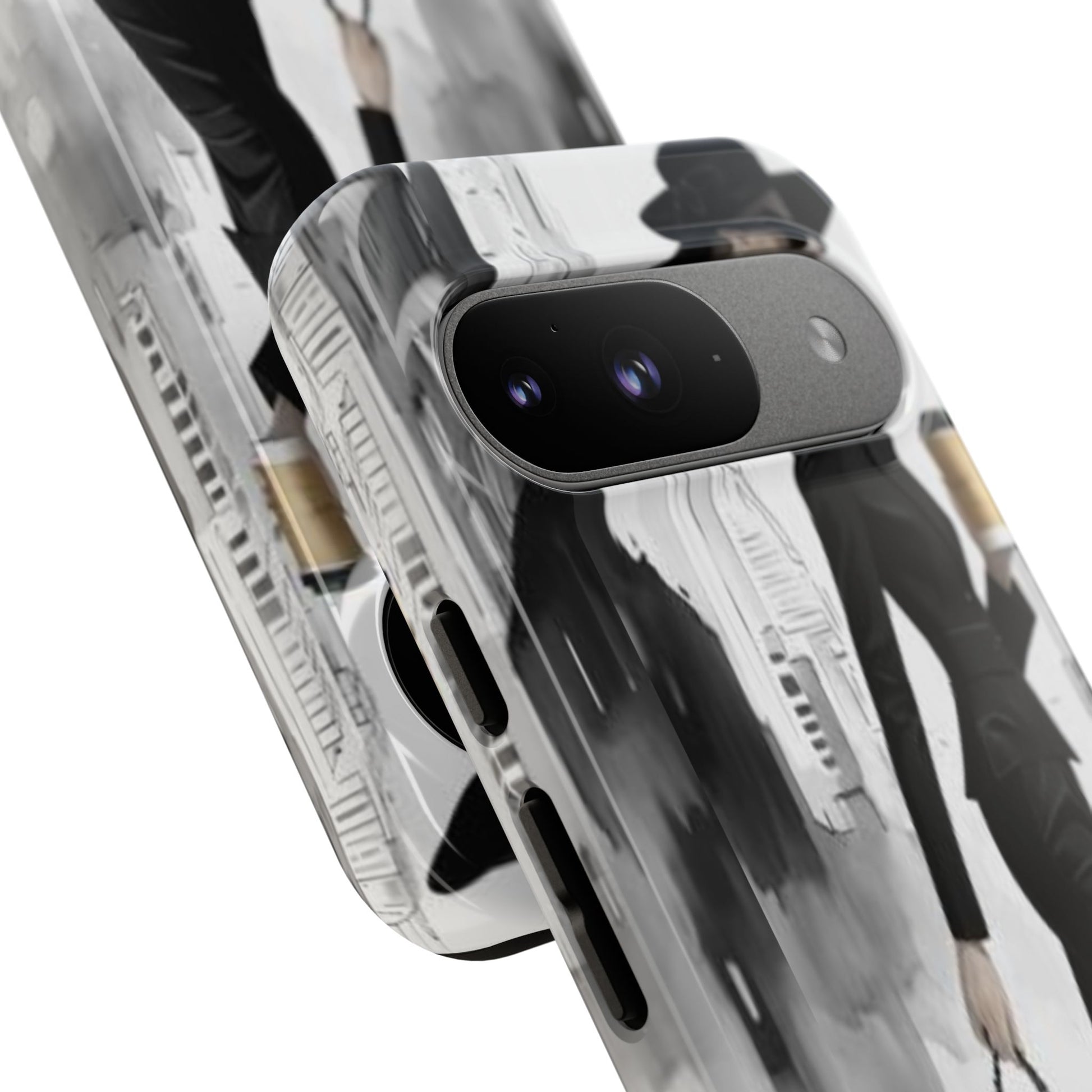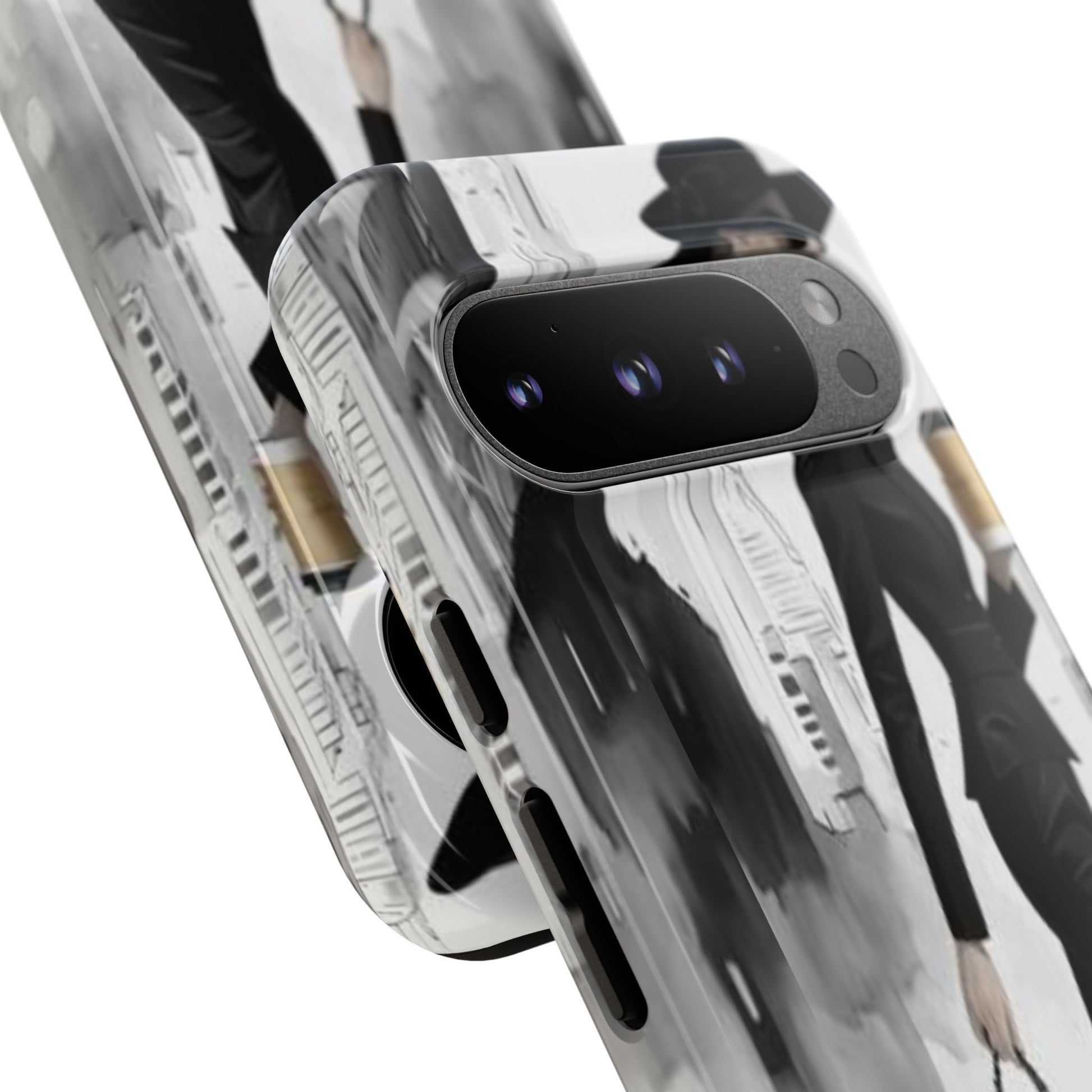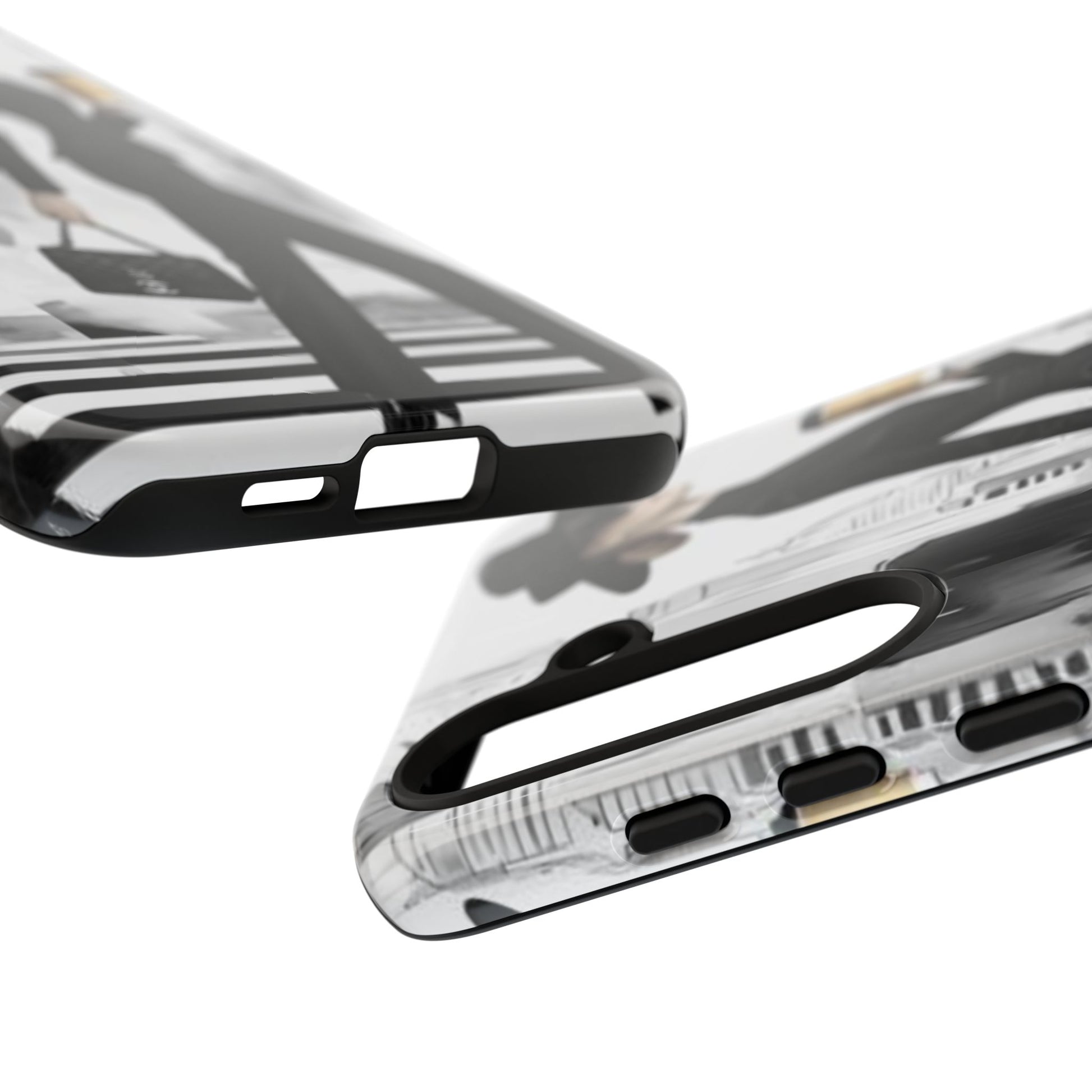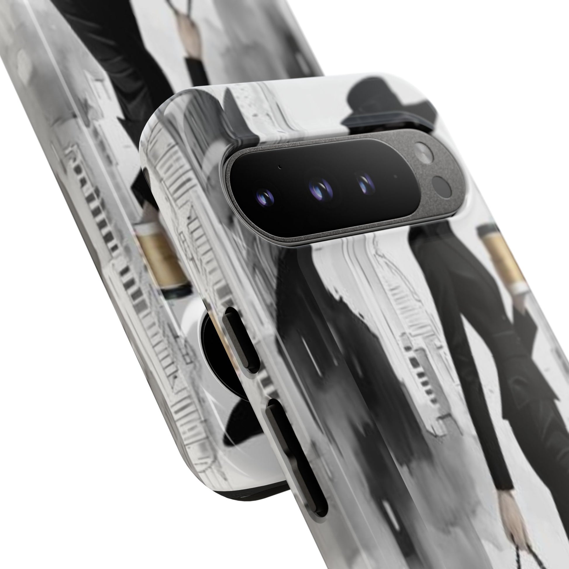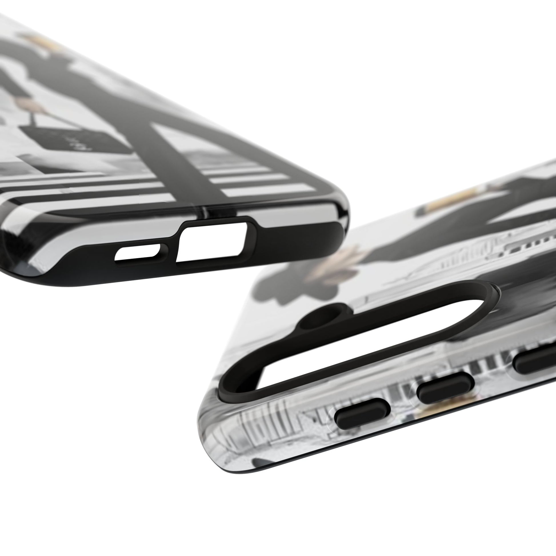A sleek, protective phone case that marries city-chic style with dependable defense. The monochrome fashion illustration — a poised woman in a wide-brim hat, tailored suit, and designer handbag — wraps the case in a high-contrast, editorial look. Smooth matte or glossy finishes keep the artwork crisp while the dual-layer polycarbonate shell and TPU silicone liner absorb shocks and protect against everyday drops. Lightweight and slim, it slips into a bag or hand with ease, while clear port openings maintain full connectivity and wireless charging compatibility. Thoughtful durability and certified materials mean this case performs outdoors and on the go, keeping that metropolitan, café-to-meeting aesthetic intact.