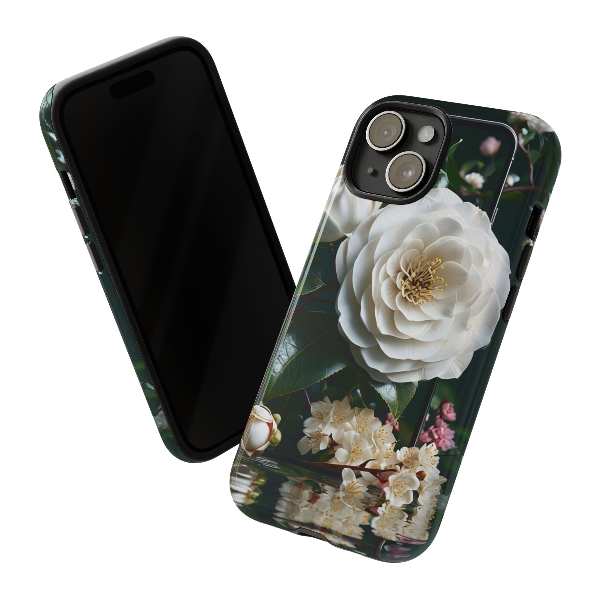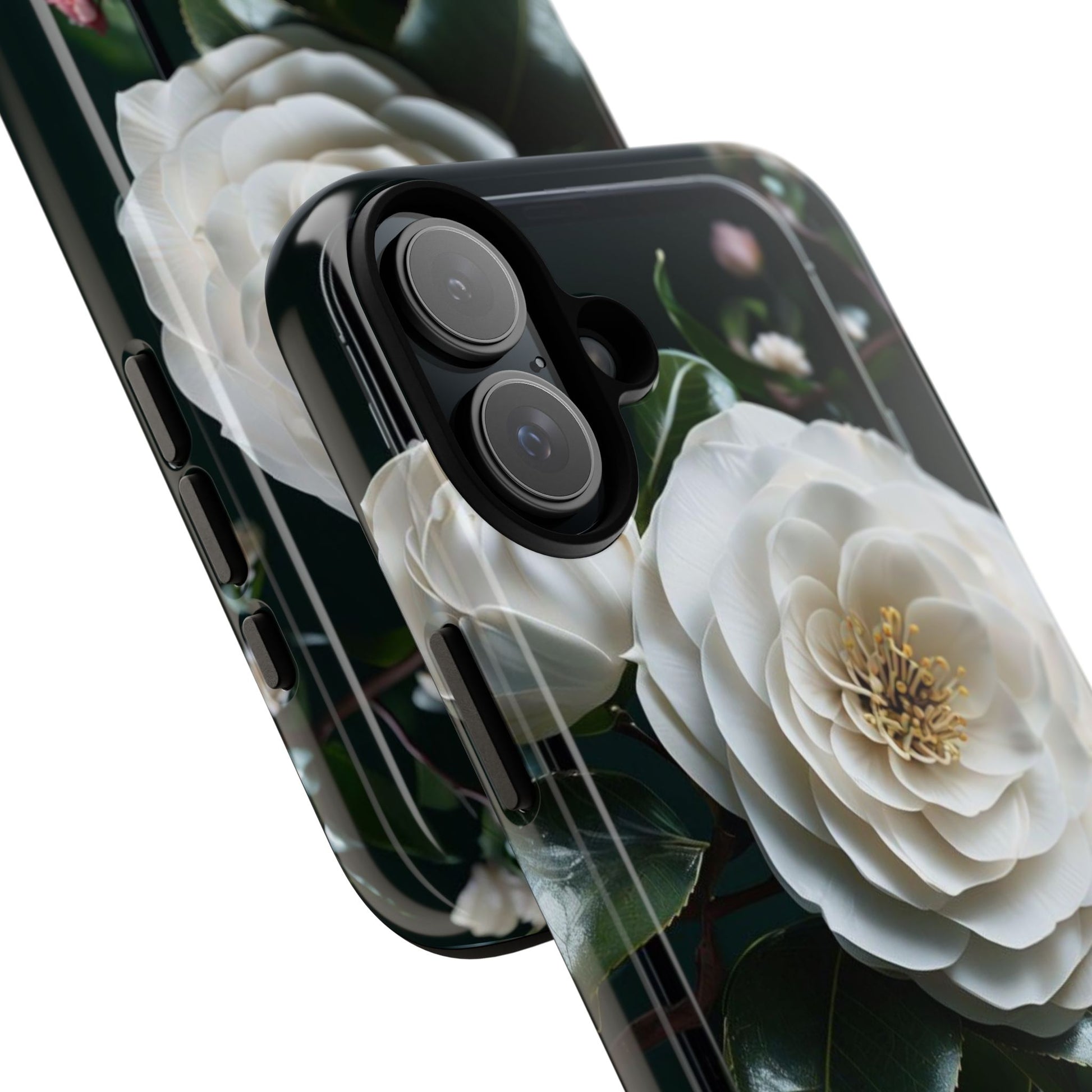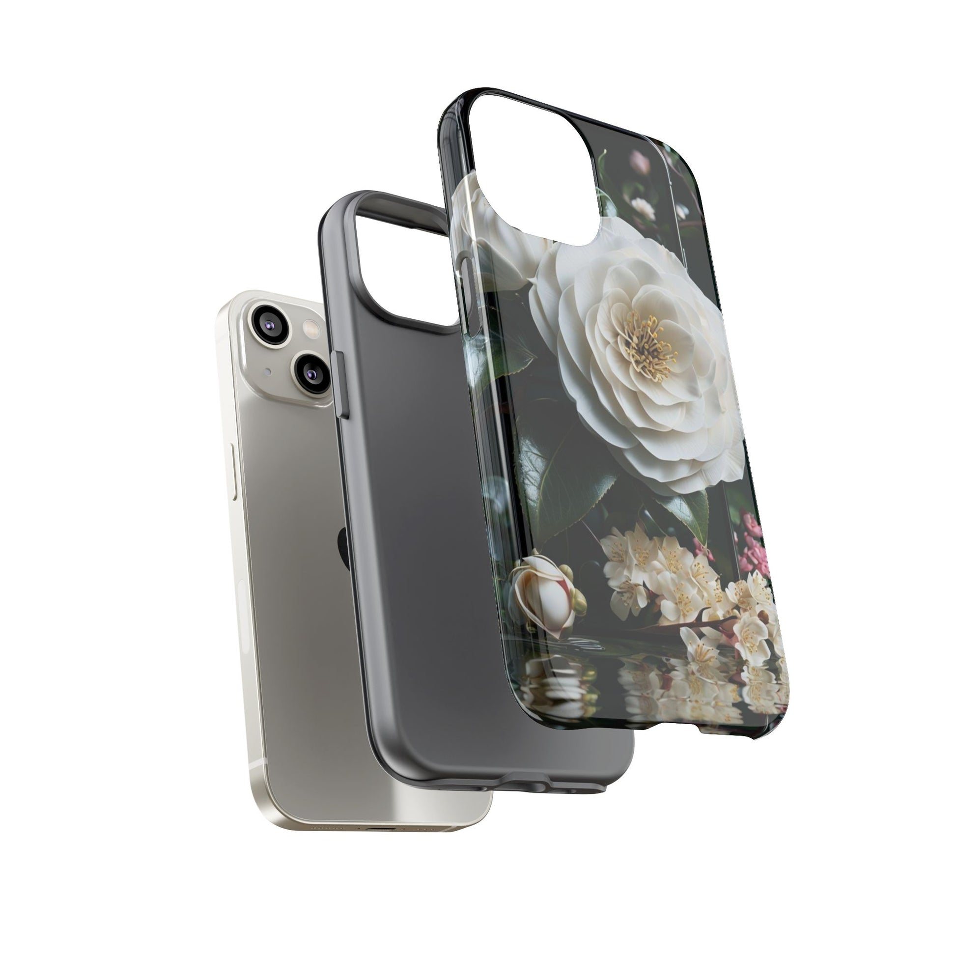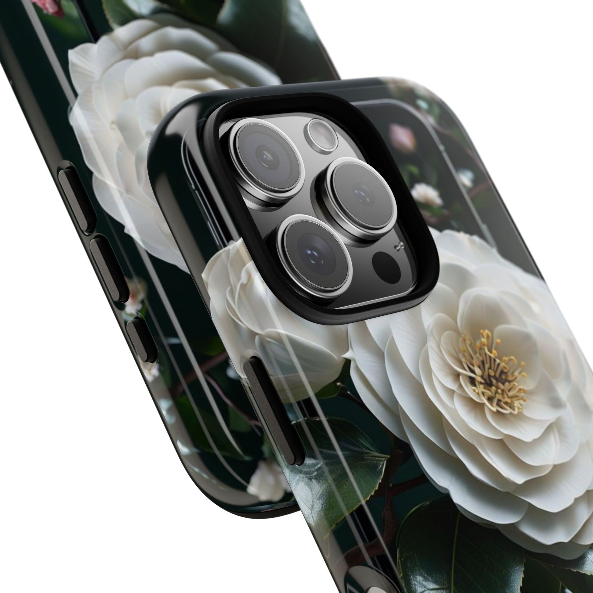 A slim, protective phone case wrapped in a lush floral scene — layered white camellias and tiny blush blossoms hover over a deep, glossy background. The image flows edge-to-edge with a 3D wrap that keeps petals and leaves continuous around the sides. The silicone TPU liner cushions against drops while a hard polycarbonate shell stands up to everyday knocks. Finished in your choice of glossy or matte, this case keeps ports accessible and supports wireless charging, while UV protection helps preserve the rich blacks and soft whites. It feels like carrying a pocket of a greenhouse: calm, tactile, and quietly luxurious.