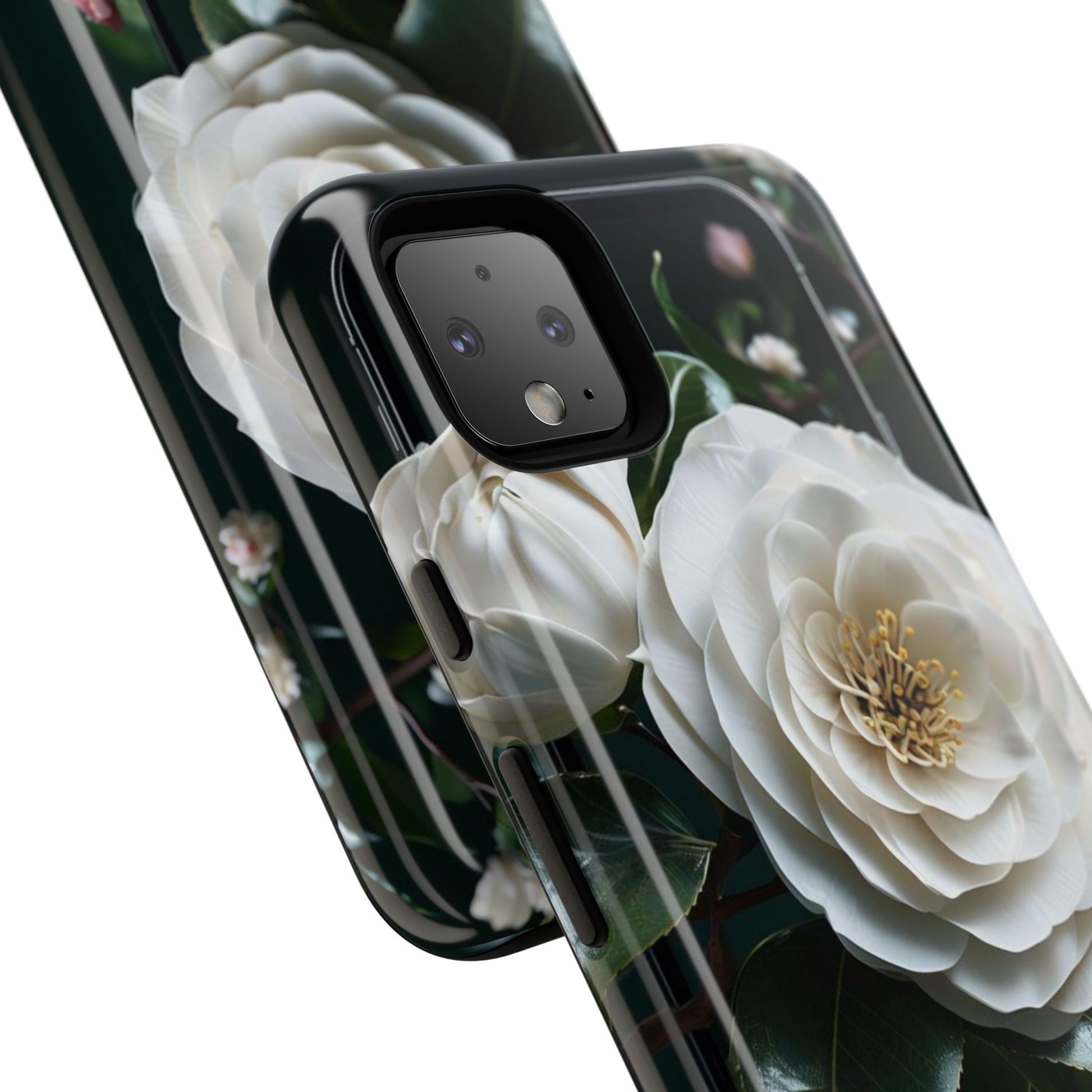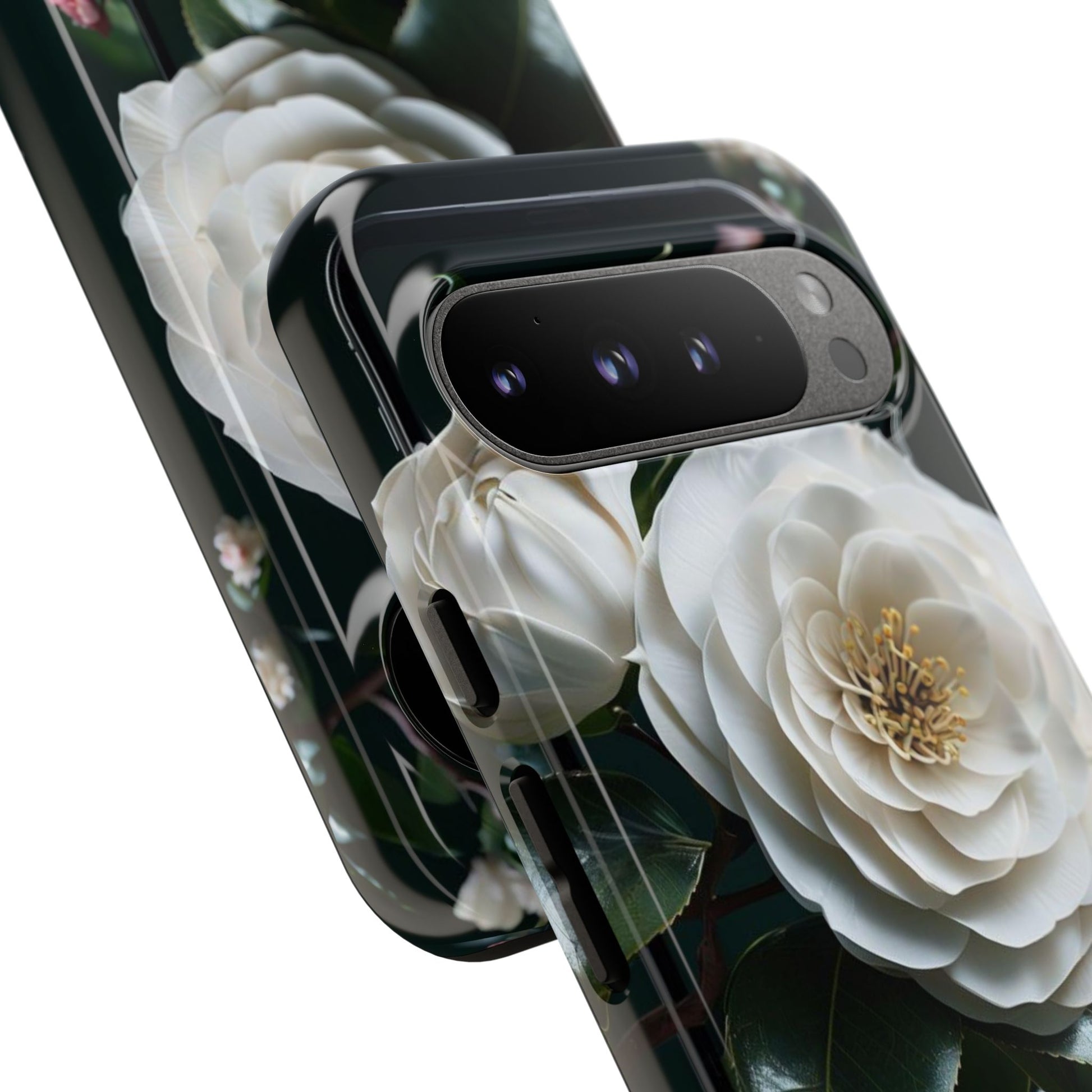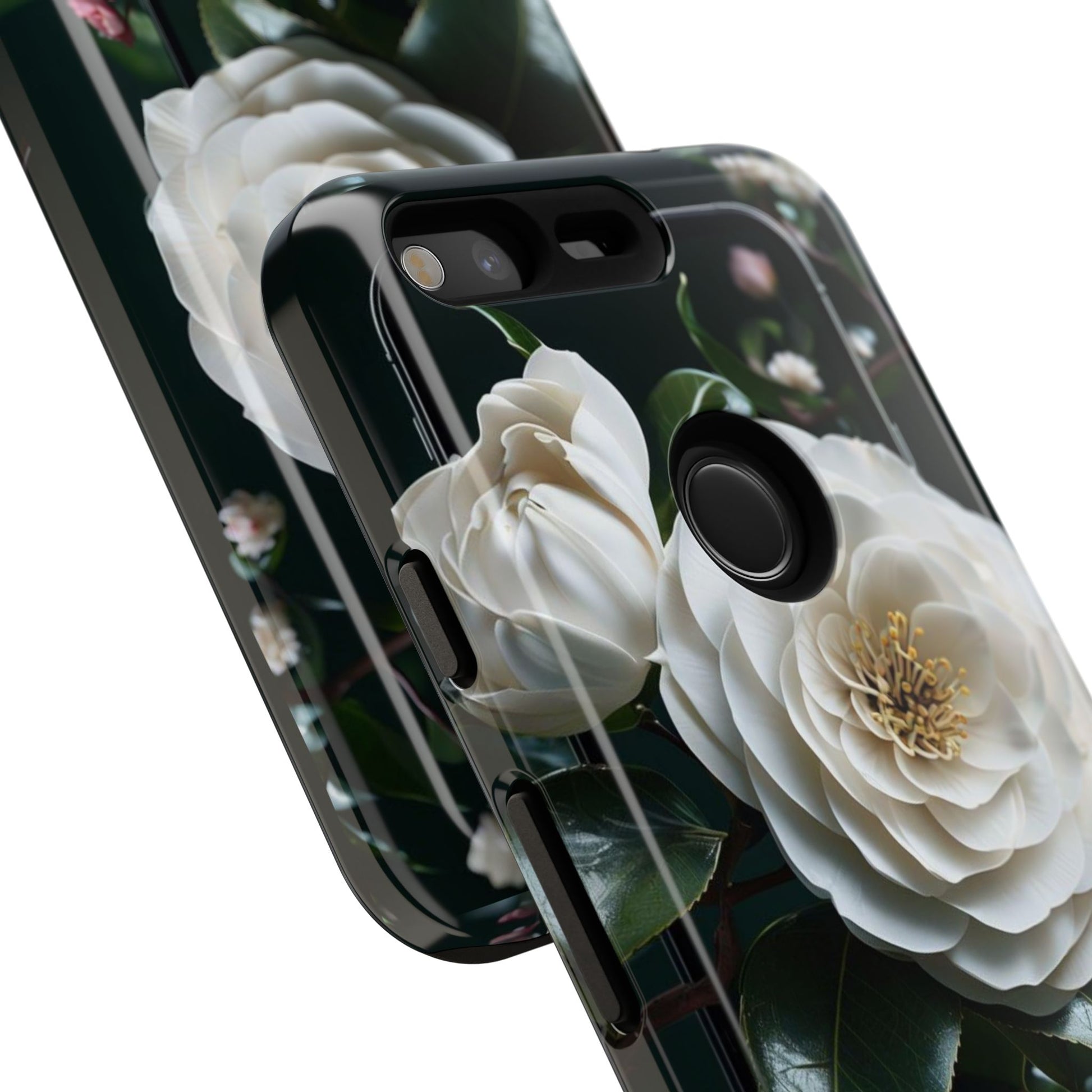 A slim, protective phone case wrapped in a lush floral scene — layered white camellias and tiny blush blossoms hover over a deep, glossy background. The image flows edge-to-edge with a 3D wrap that keeps petals and leaves continuous around the sides. The silicone TPU liner cushions against drops while a hard polycarbonate shell stands up to everyday knocks. Finished in your choice of glossy or matte, this case keeps ports accessible and supports wireless charging, while UV protection helps preserve the rich blacks and soft whites. It feels like carrying a pocket of a greenhouse: calm, tactile, and quietly luxurious.
