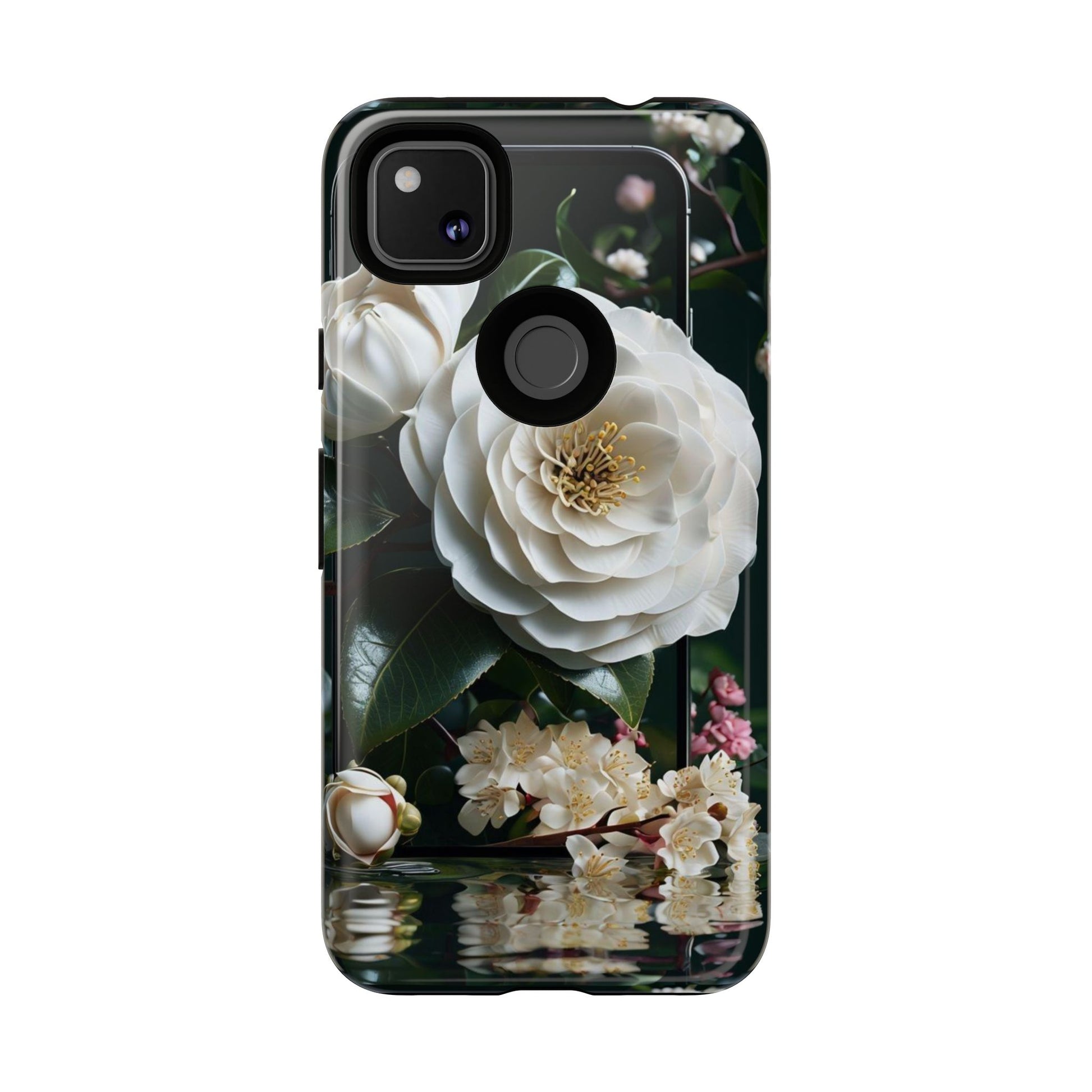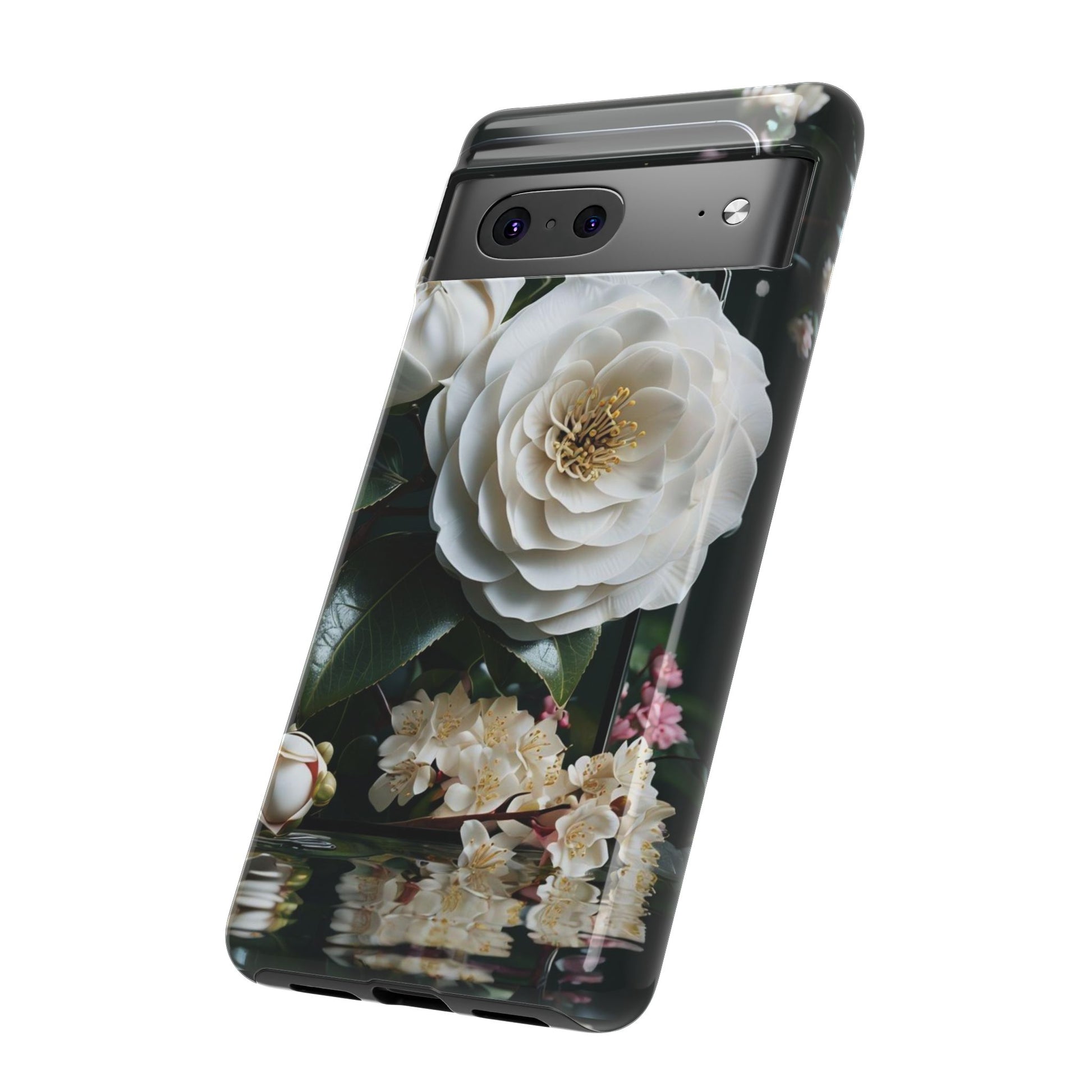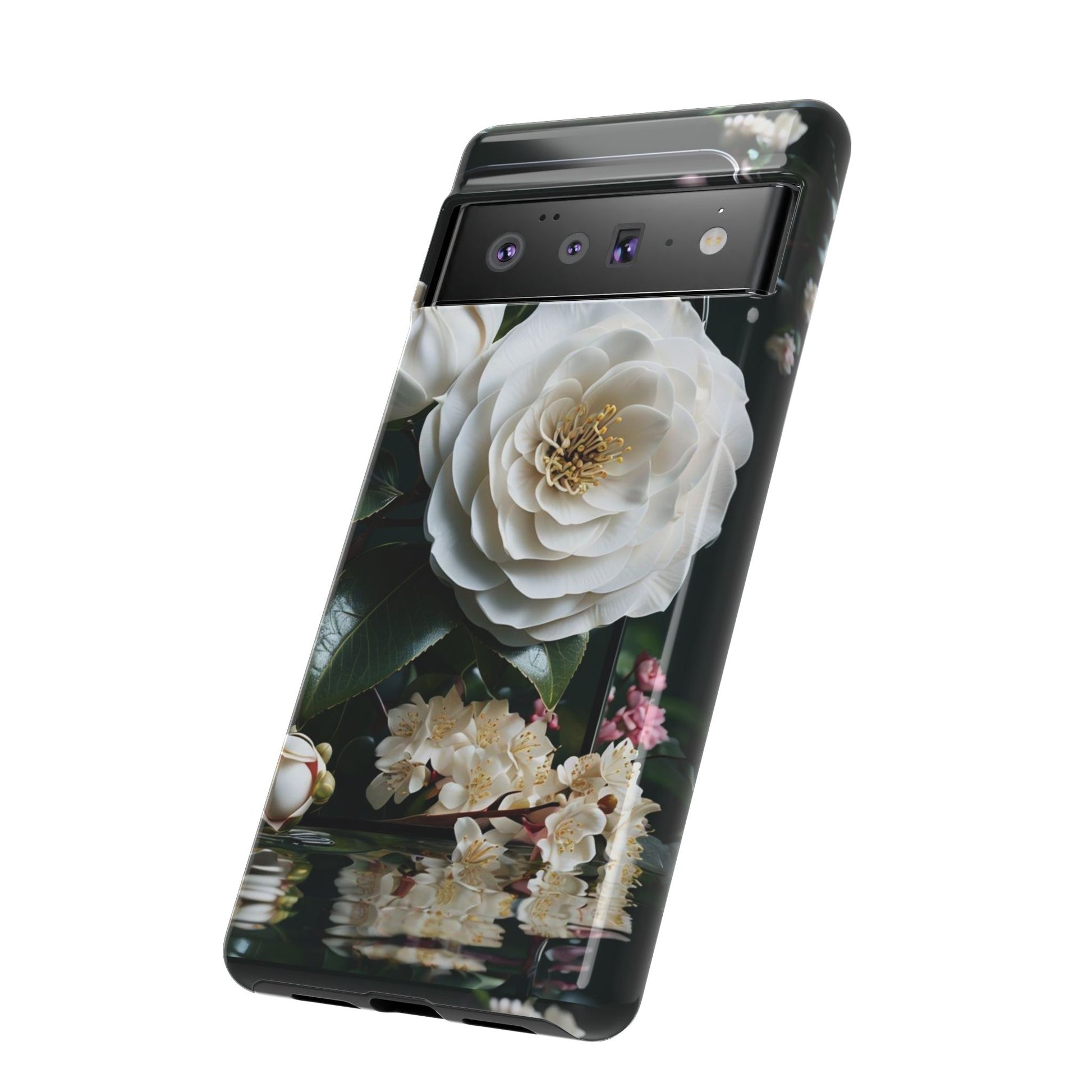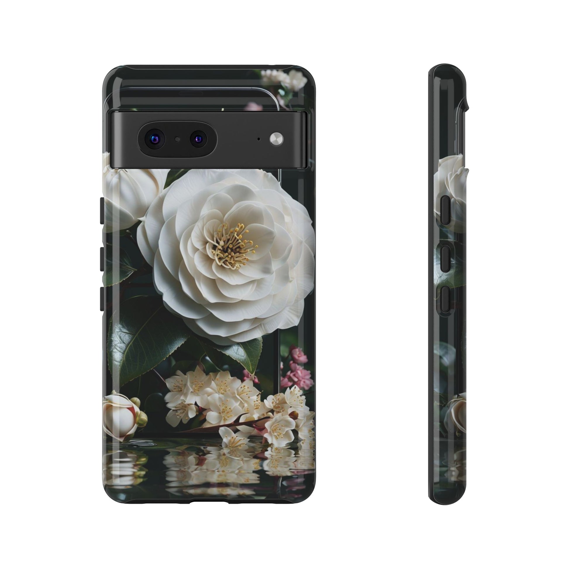 A slim, protective phone case wrapped in a lush floral scene — layered white camellias and tiny blush blossoms hover over a deep, glossy background. The image flows edge-to-edge with a 3D wrap that keeps petals and leaves continuous around the sides. The silicone TPU liner cushions against drops while a hard polycarbonate shell stands up to everyday knocks. Finished in your choice of glossy or matte, this case keeps ports accessible and supports wireless charging, while UV protection helps preserve the rich blacks and soft whites. It feels like carrying a pocket of a greenhouse: calm, tactile, and quietly luxurious.
