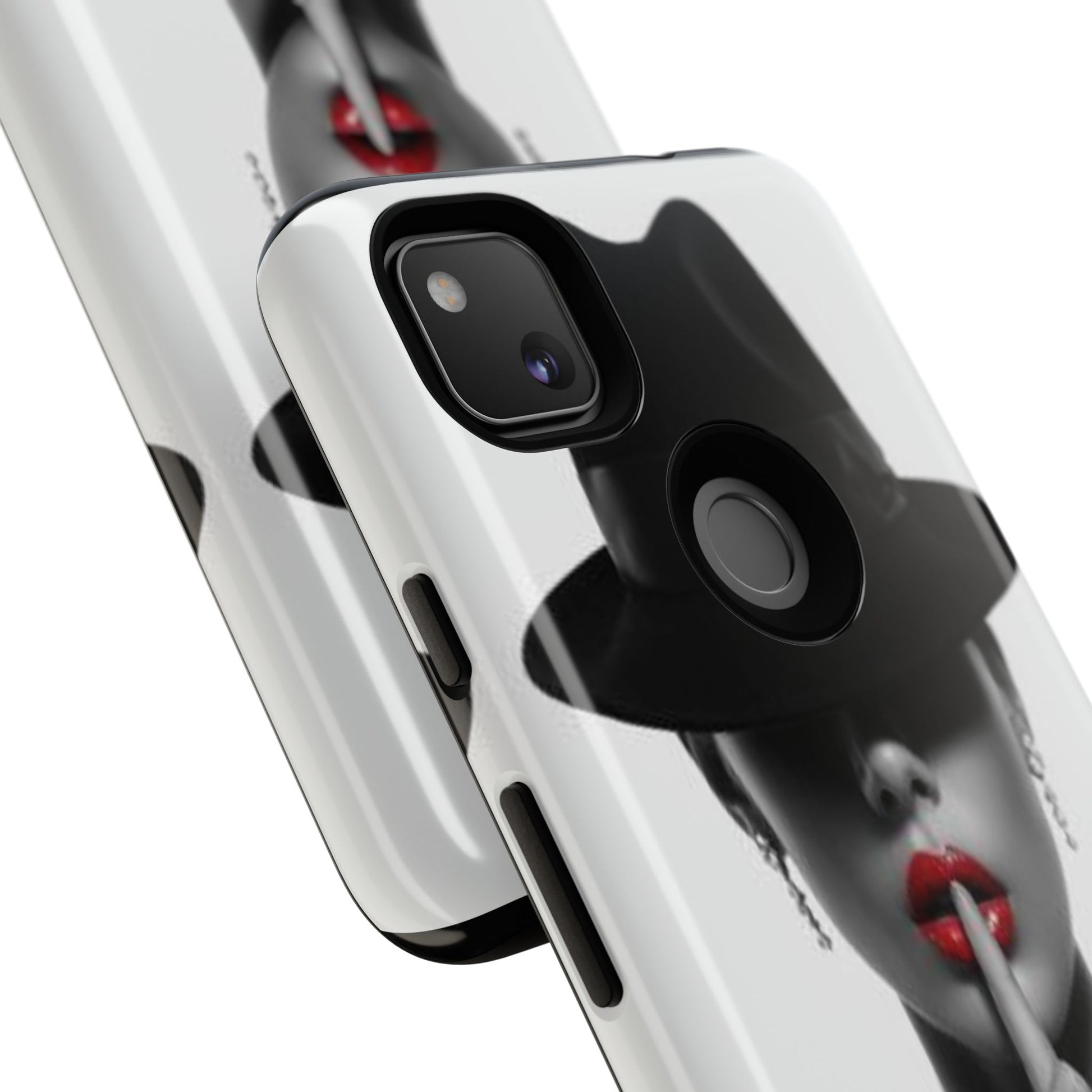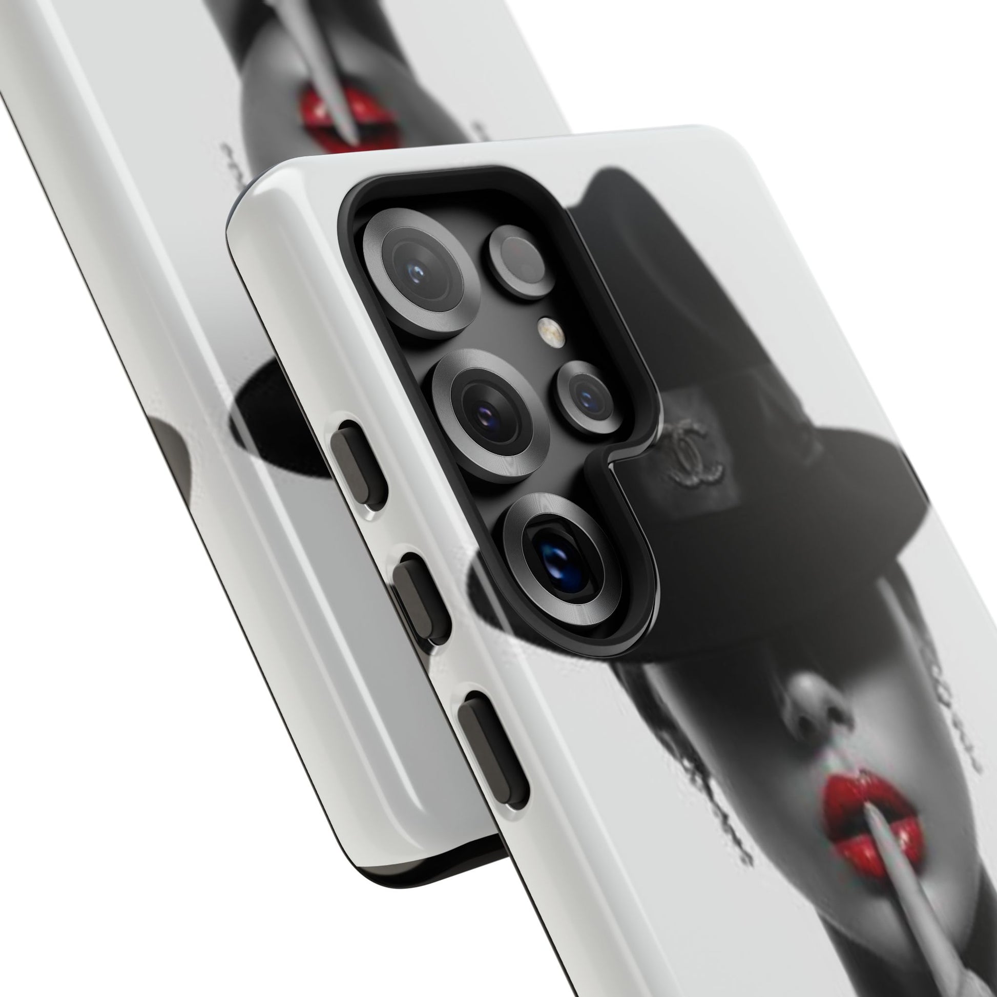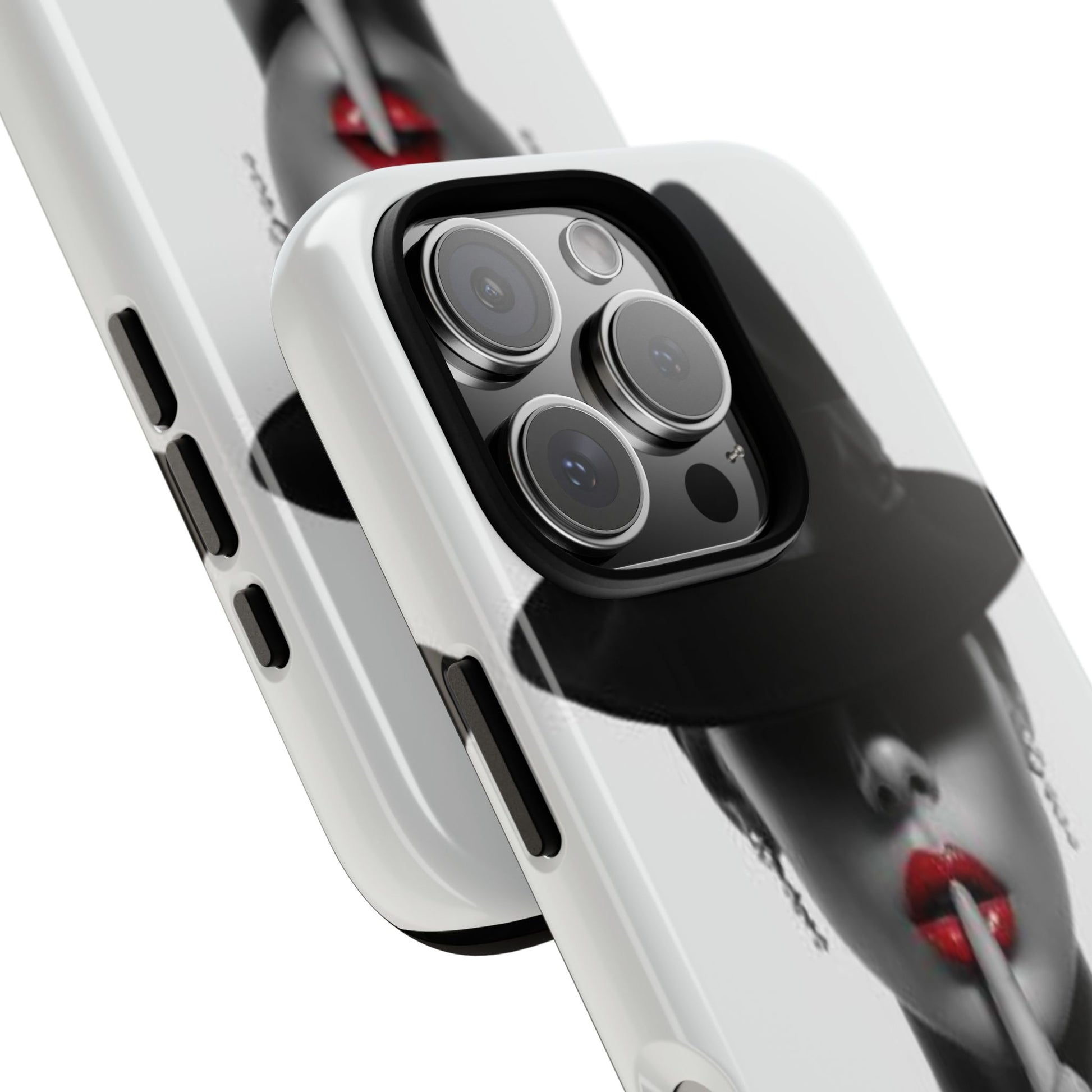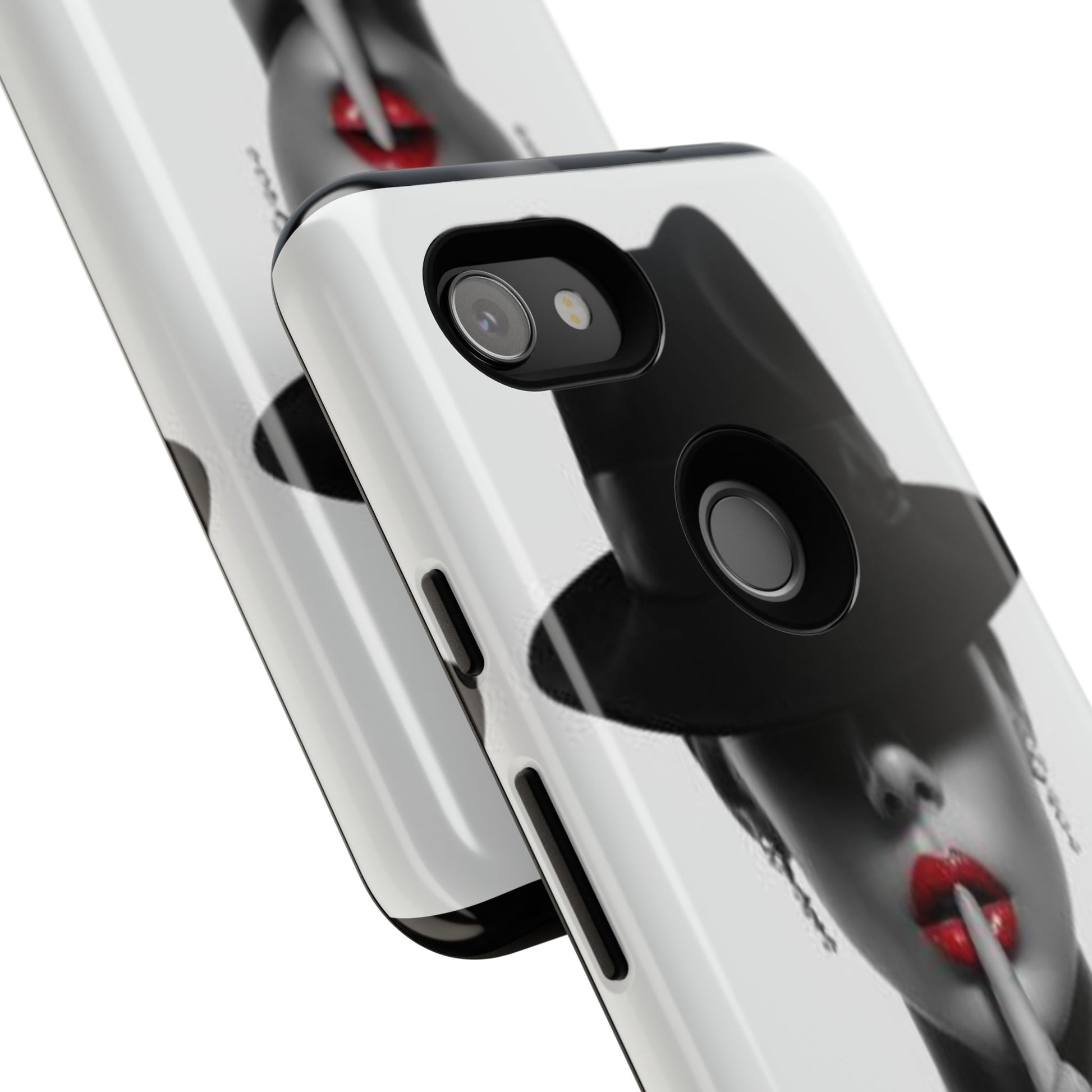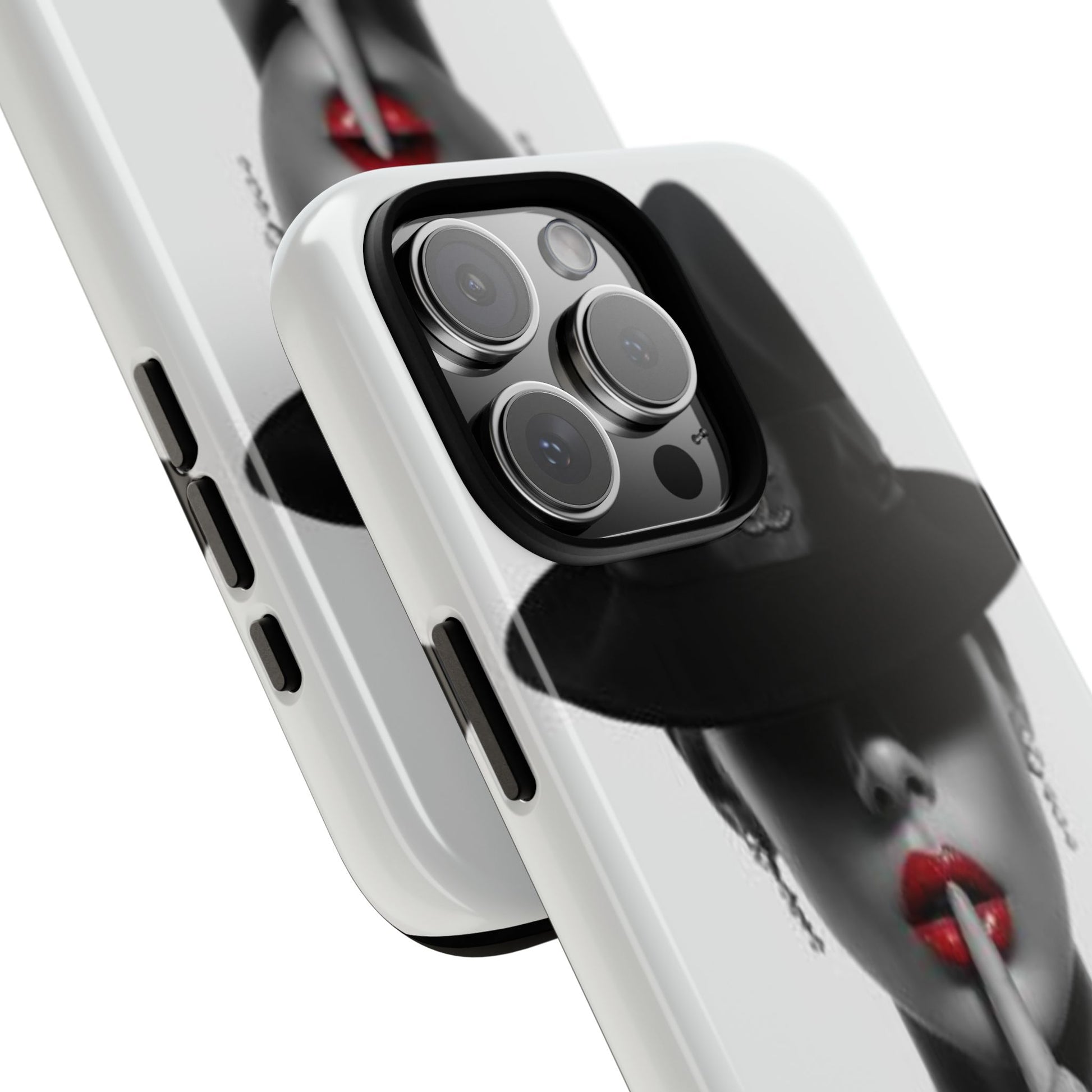 A sleek, dual-layer protective phone case with a striking monochrome portrait and bold red accent. The high-density 3D wrap print captures fine detail across the full shell, while the soft TPU silicone liner cushions against drops and shocks. Weather-resistant inks and certified materials keep the artwork looking sharp outdoors, and the slim profile keeps ports open and wireless charging available. This case brings subtle glamour and everyday protection to your device — a confident, stylish shield for daily routines and coffee-shop moments.
