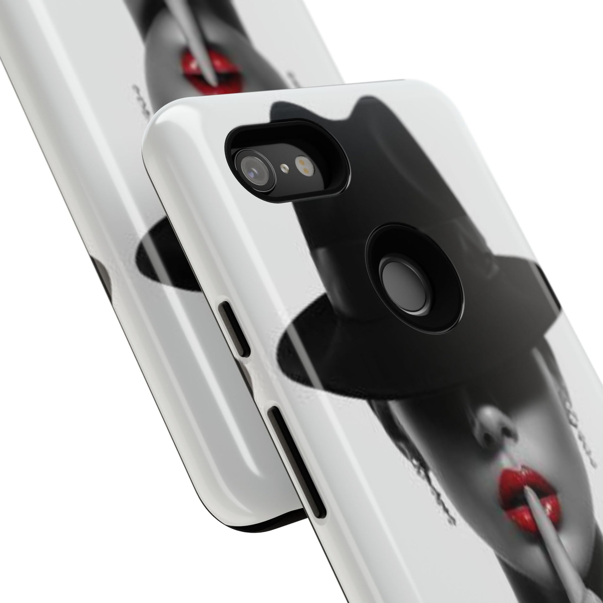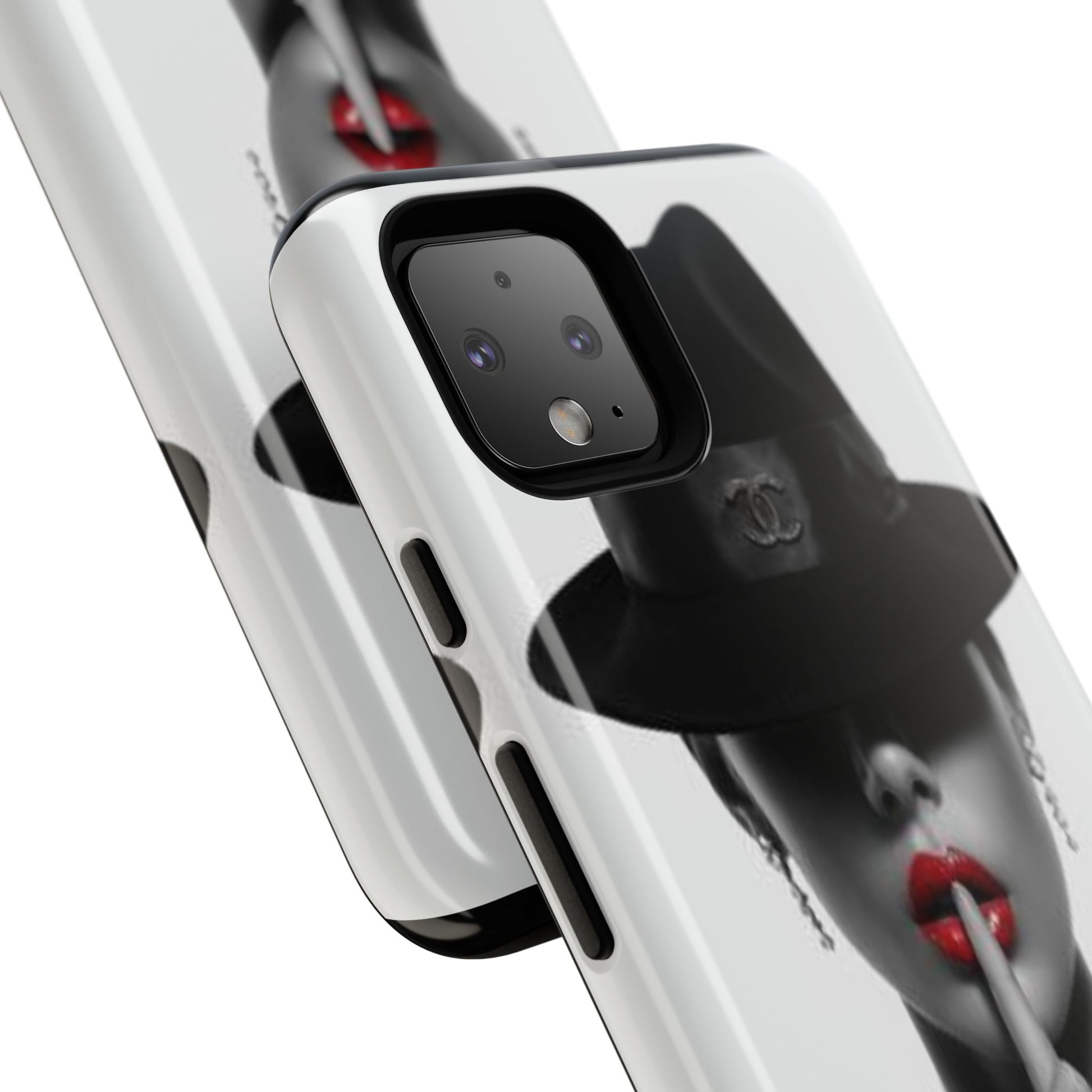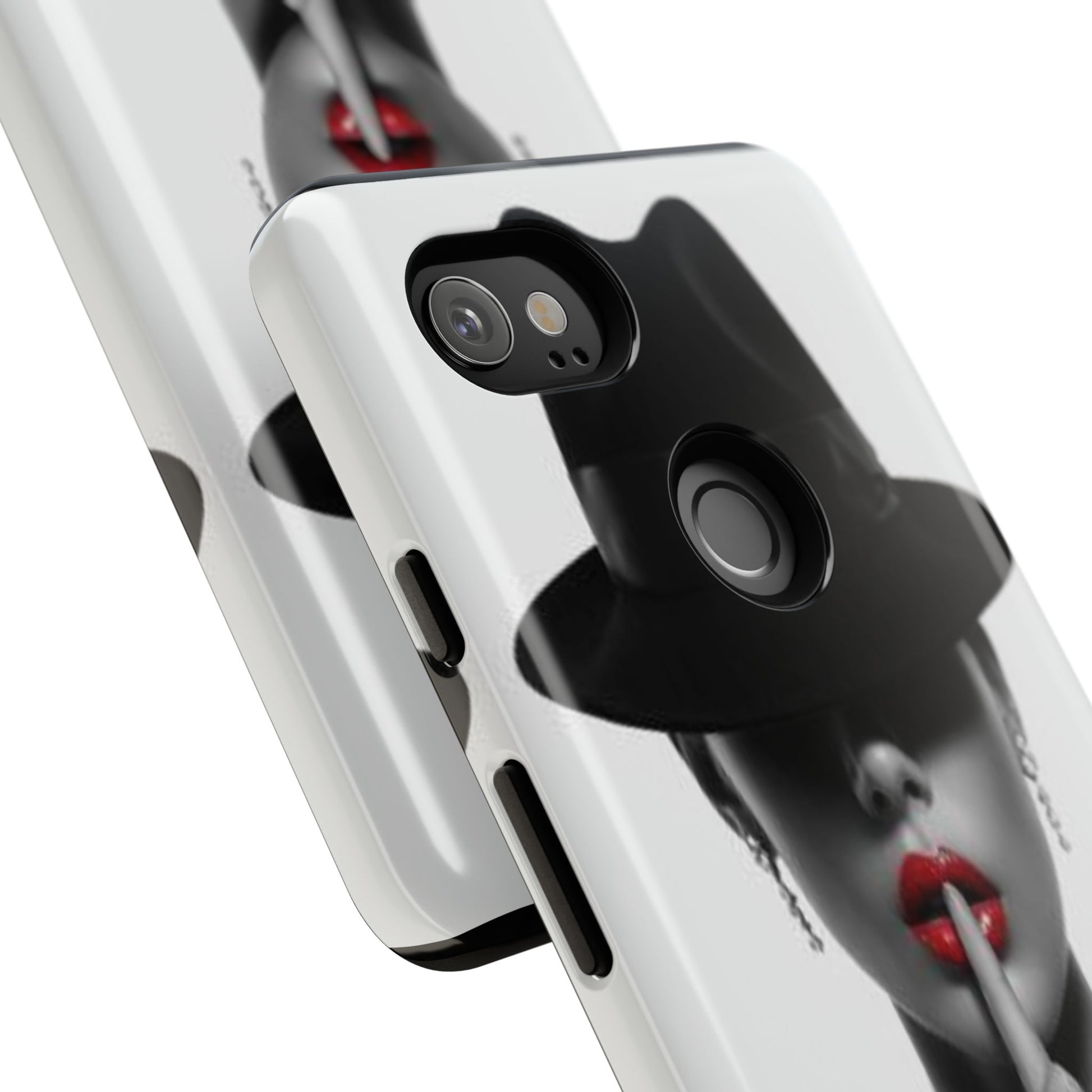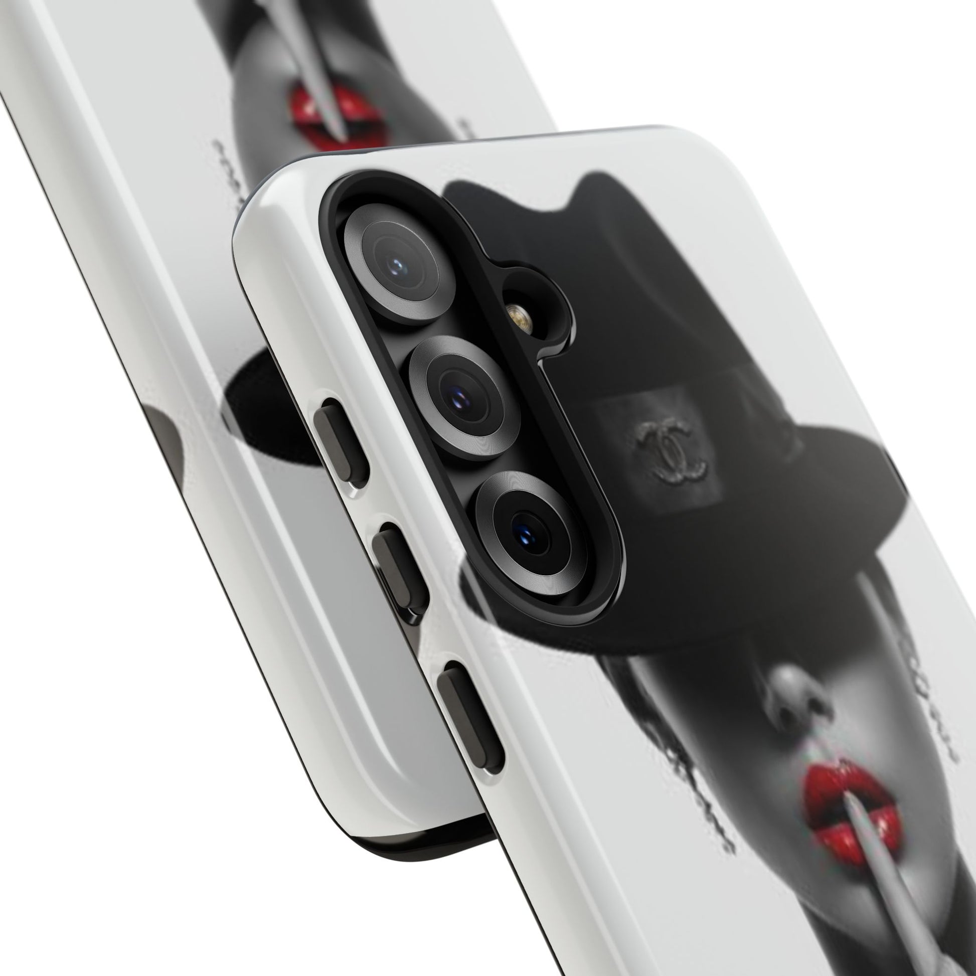 A sleek, dual-layer protective phone case with a striking monochrome portrait and bold red accent. The high-density 3D wrap print captures fine detail across the full shell, while the soft TPU silicone liner cushions against drops and shocks. Weather-resistant inks and certified materials keep the artwork looking sharp outdoors, and the slim profile keeps ports open and wireless charging available. This case brings subtle glamour and everyday protection to your device — a confident, stylish shield for daily routines and coffee-shop moments.