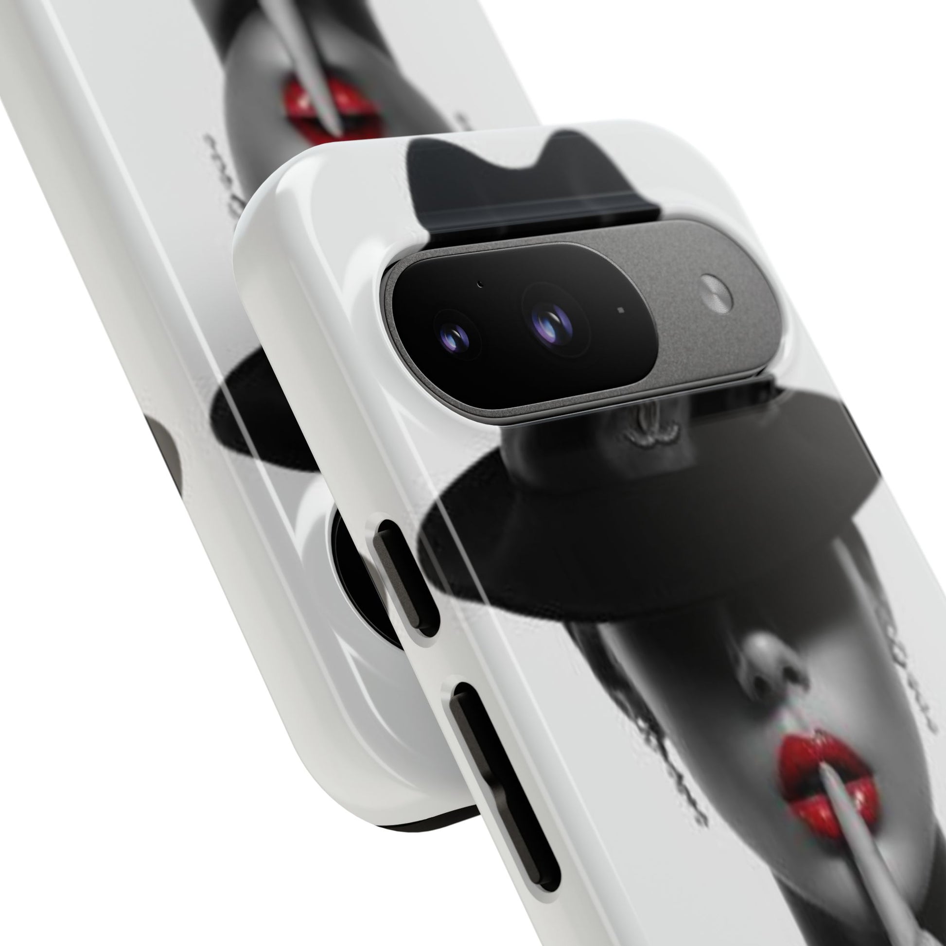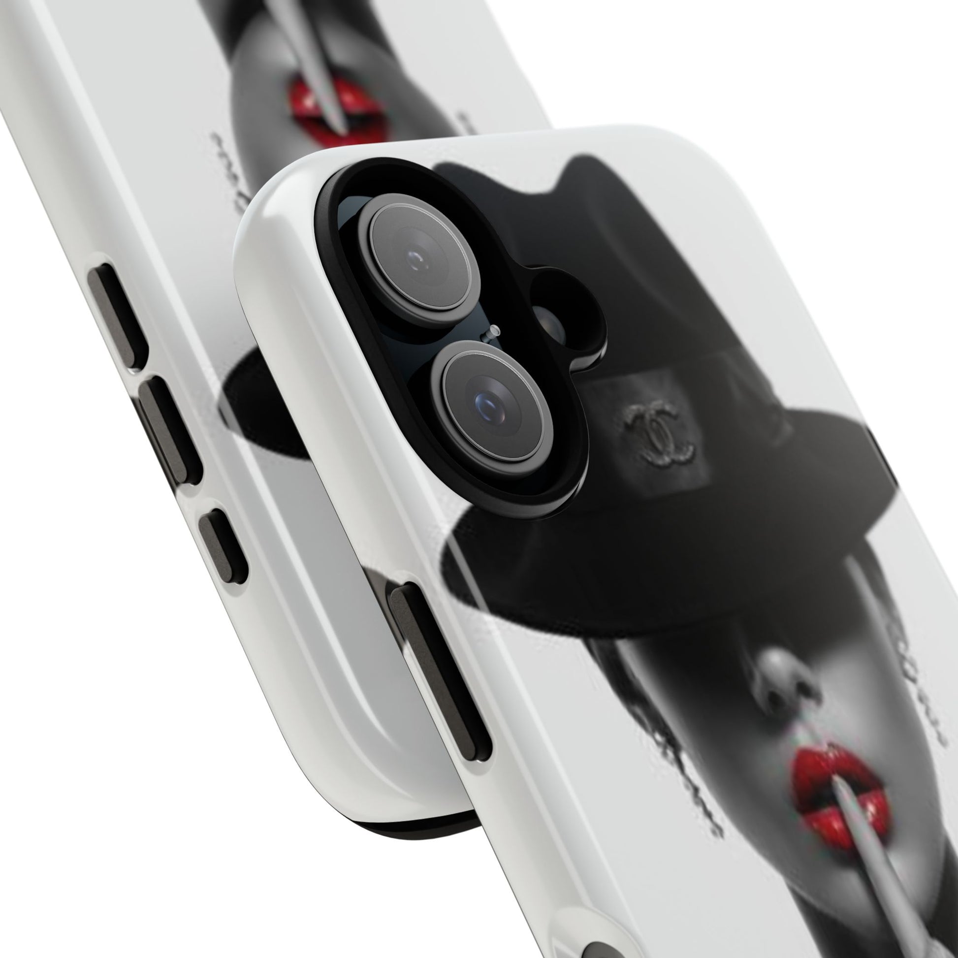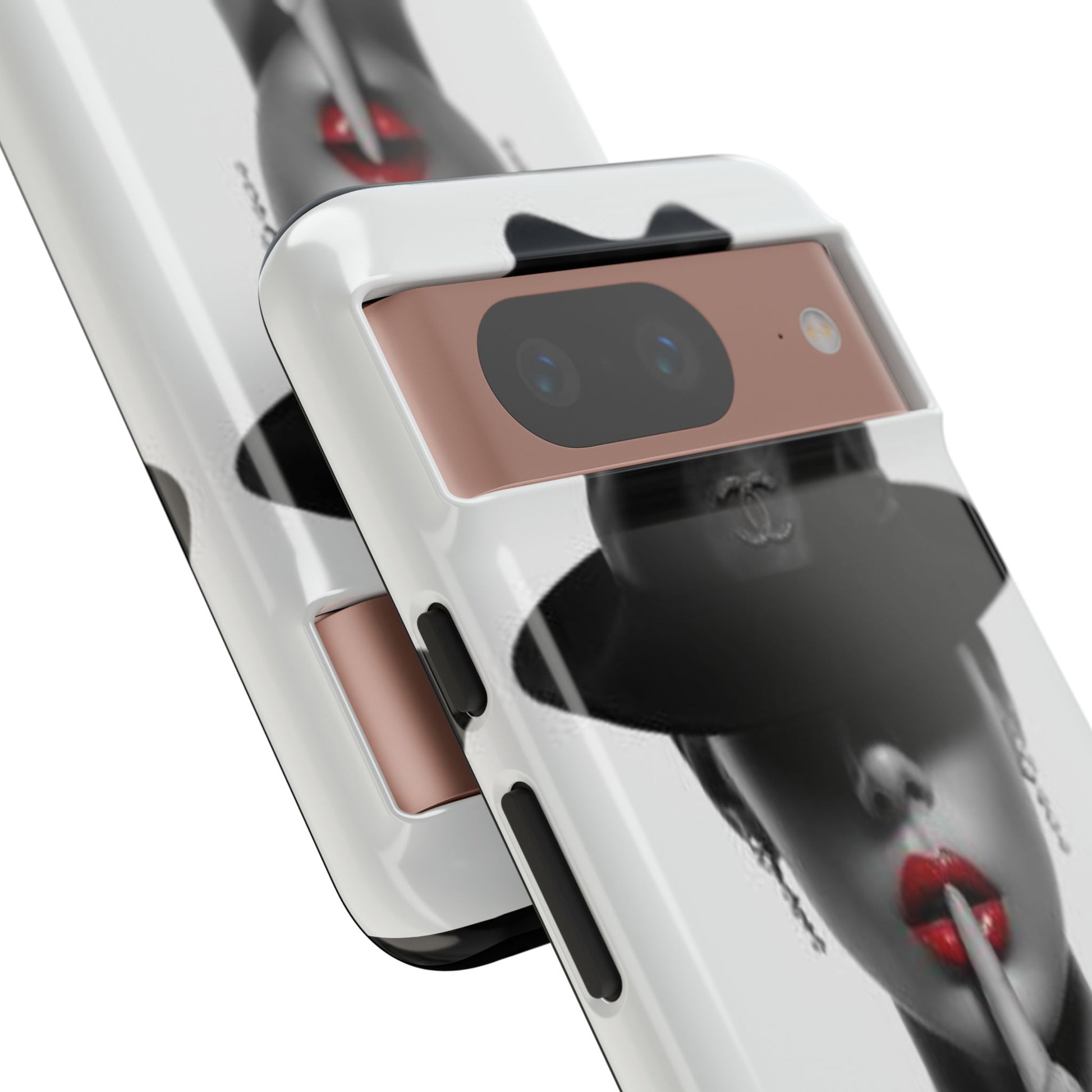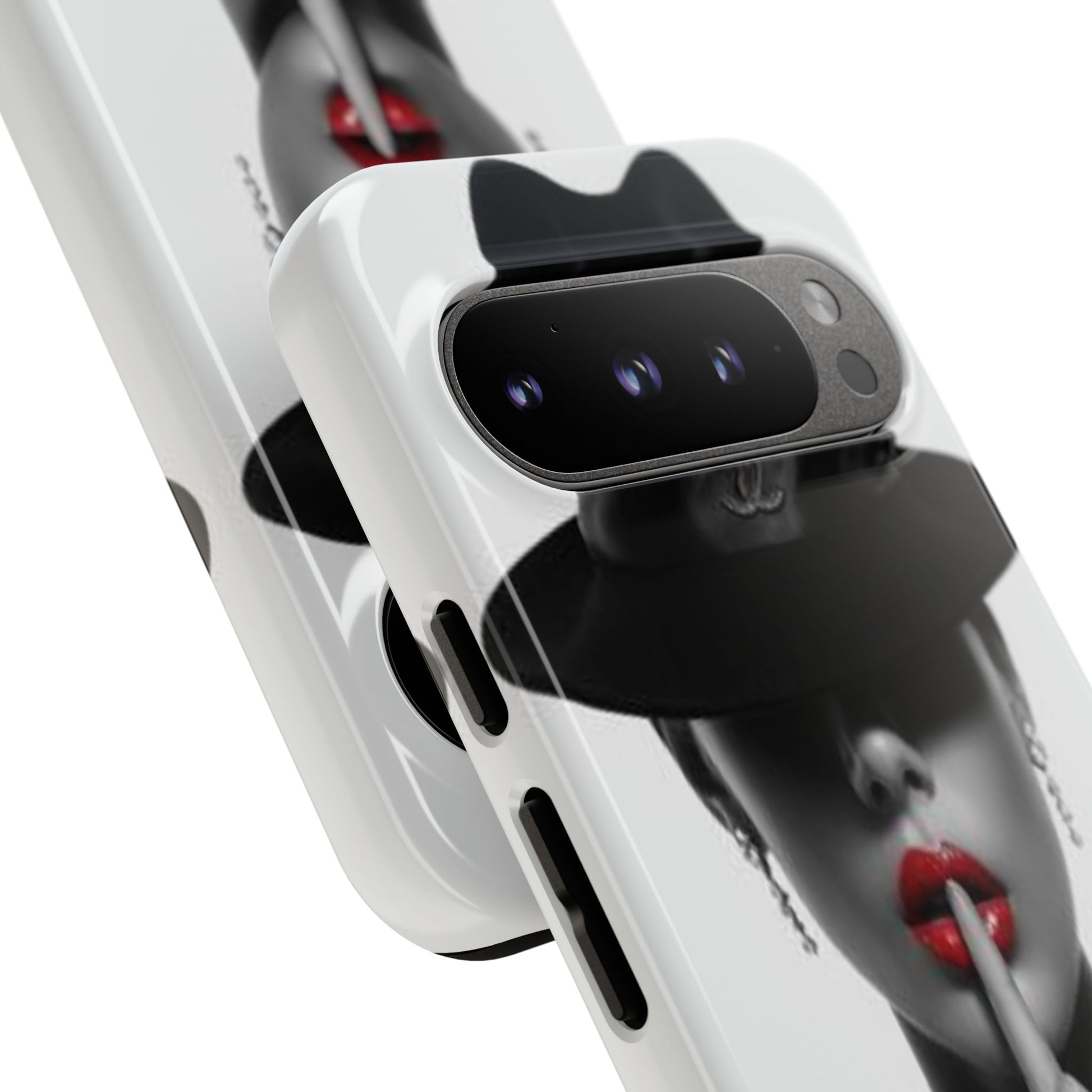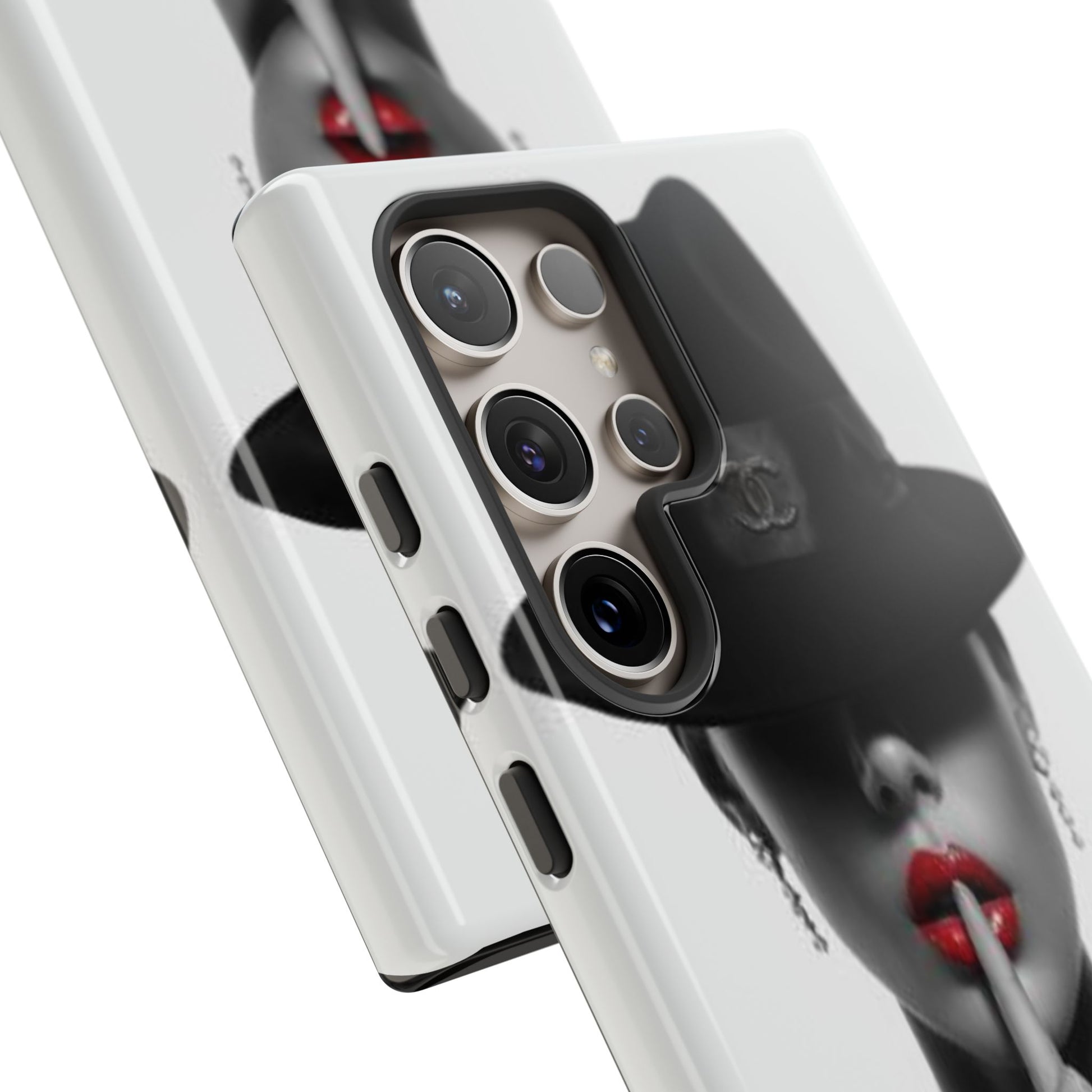 A sleek, dual-layer protective phone case with a striking monochrome portrait and bold red accent. The high-density 3D wrap print captures fine detail across the full shell, while the soft TPU silicone liner cushions against drops and shocks. Weather-resistant inks and certified materials keep the artwork looking sharp outdoors, and the slim profile keeps ports open and wireless charging available. This case brings subtle glamour and everyday protection to your device — a confident, stylish shield for daily routines and coffee-shop moments.