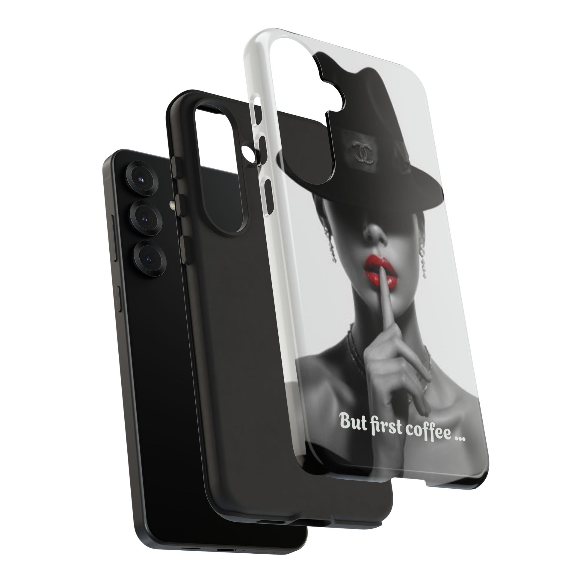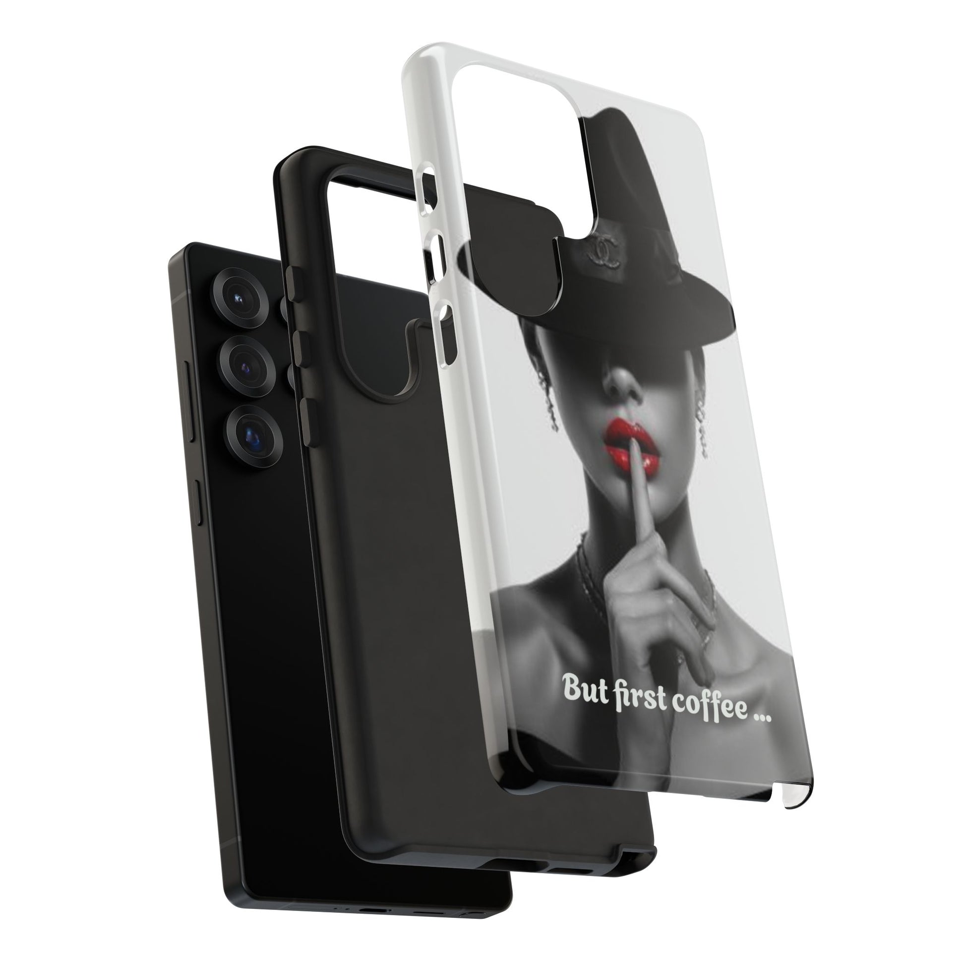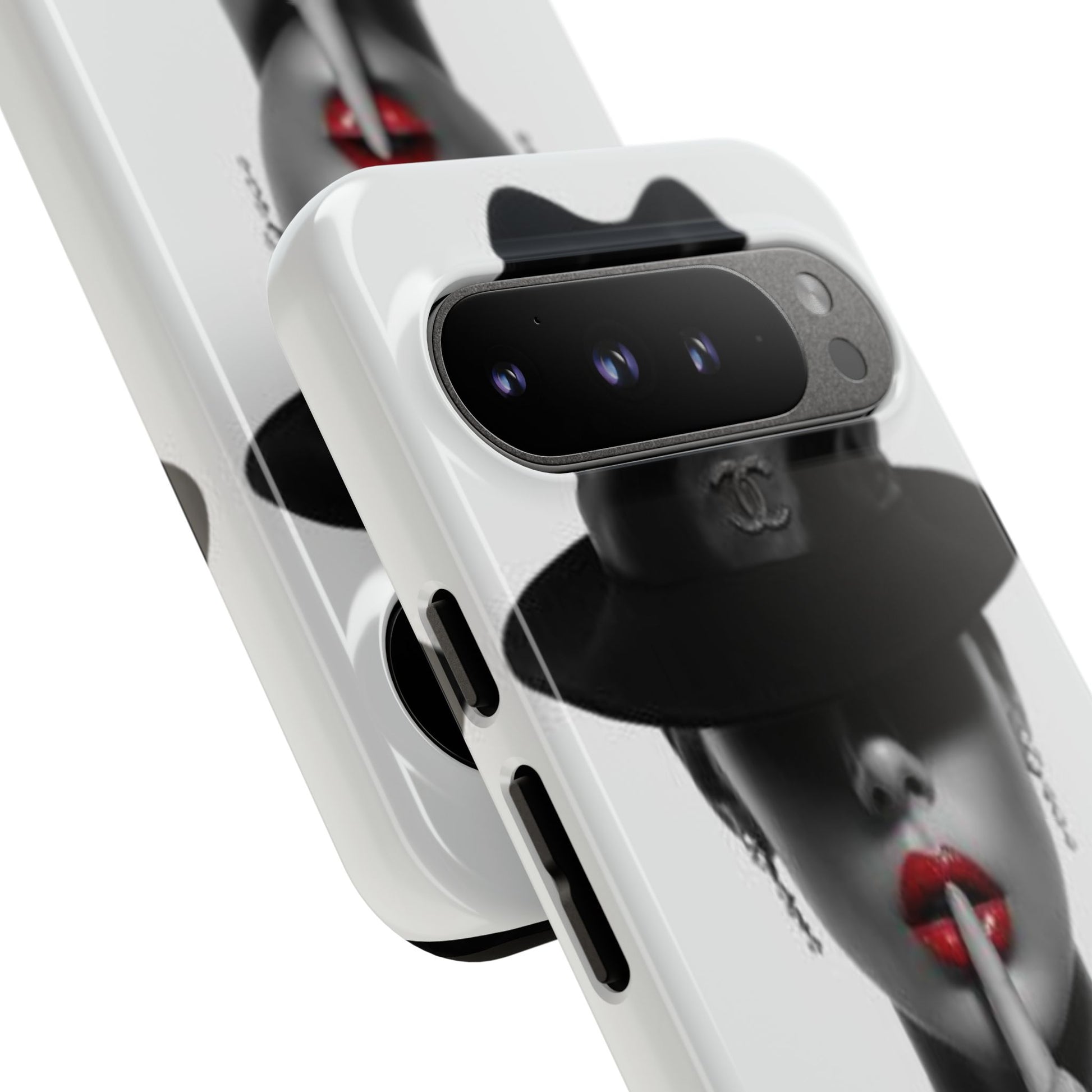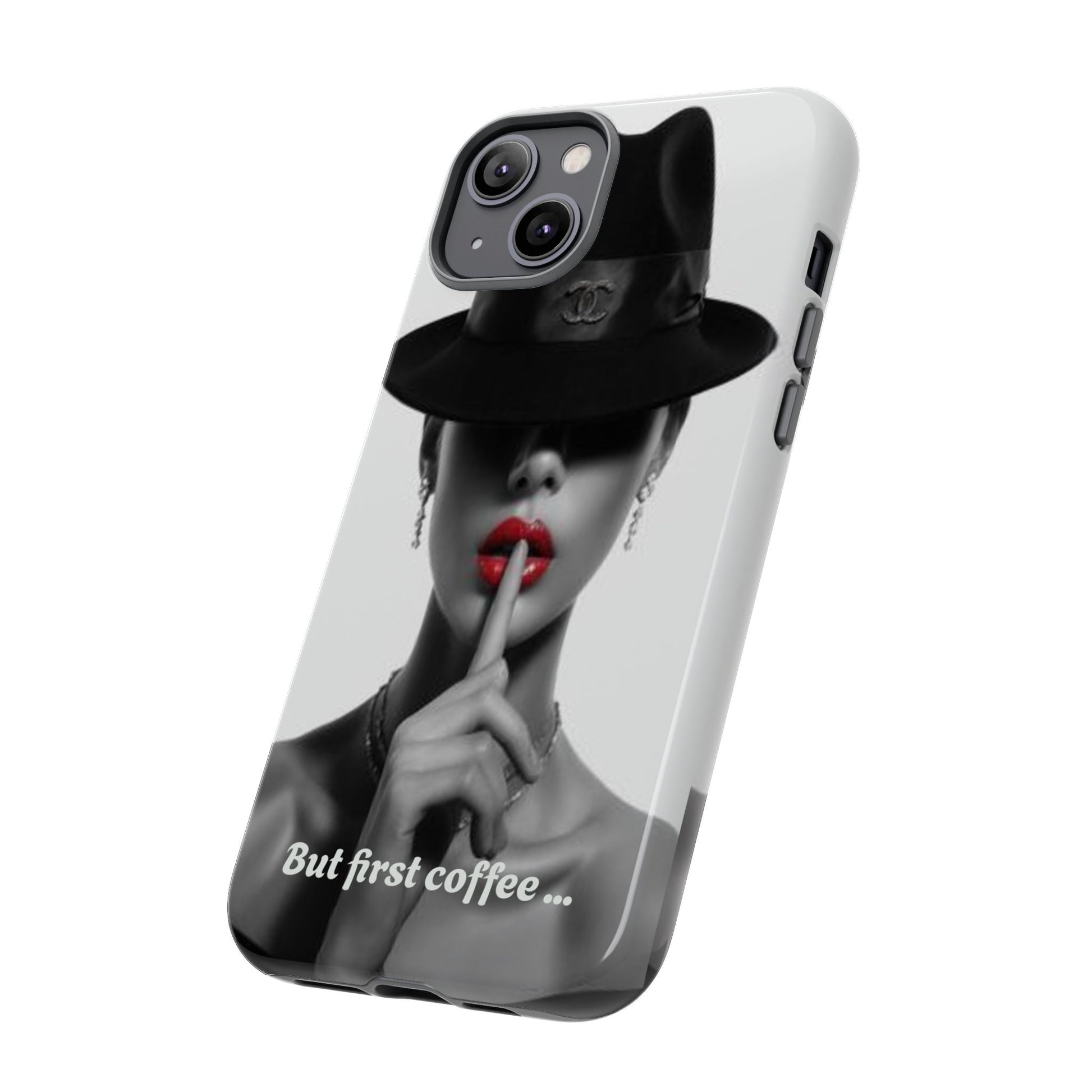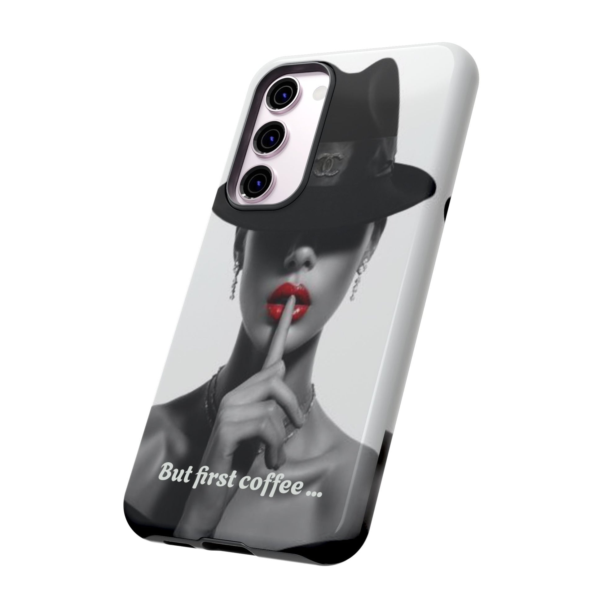 A sleek, dual-layer protective phone case with a striking monochrome portrait and bold red accent. The high-density 3D wrap print captures fine detail across the full shell, while the soft TPU silicone liner cushions against drops and shocks. Weather-resistant inks and certified materials keep the artwork looking sharp outdoors, and the slim profile keeps ports open and wireless charging available. This case brings subtle glamour and everyday protection to your device — a confident, stylish shield for daily routines and coffee-shop moments.