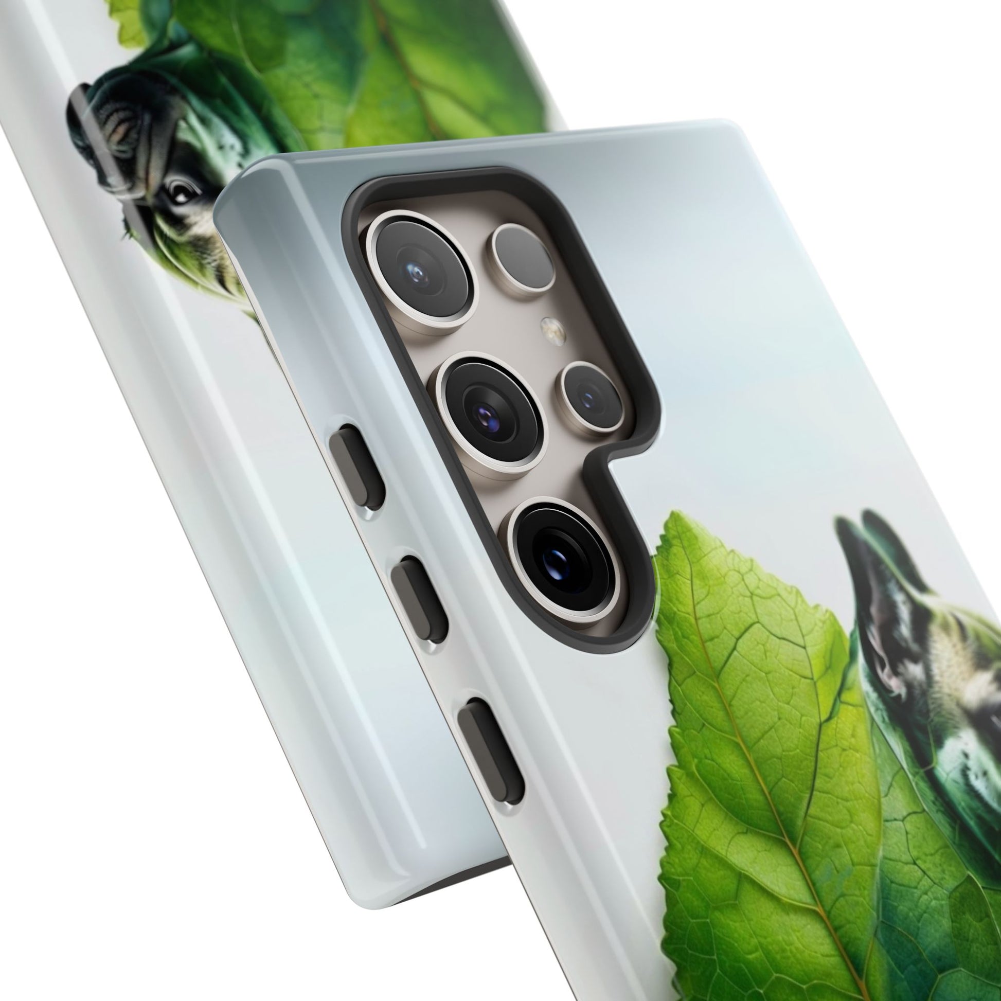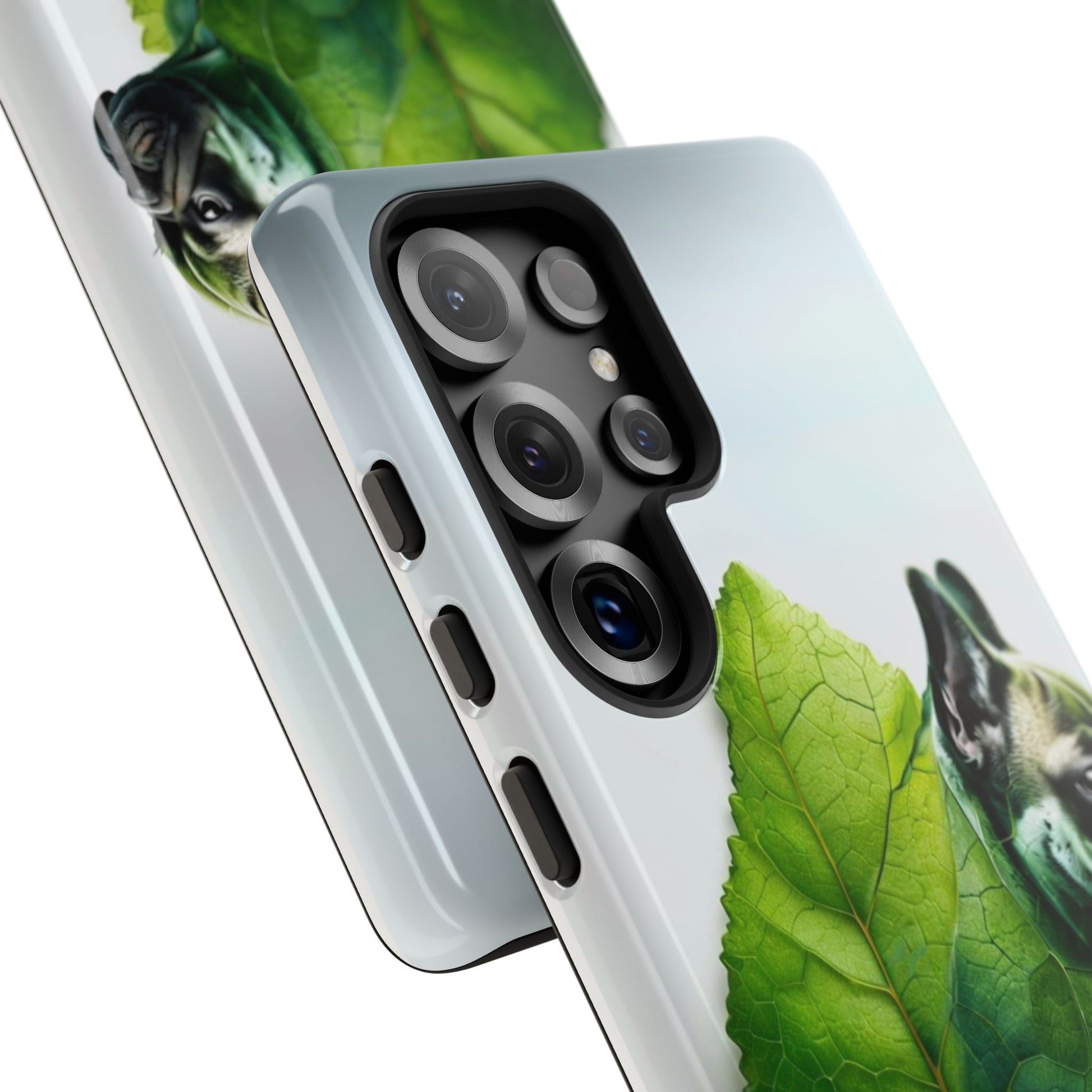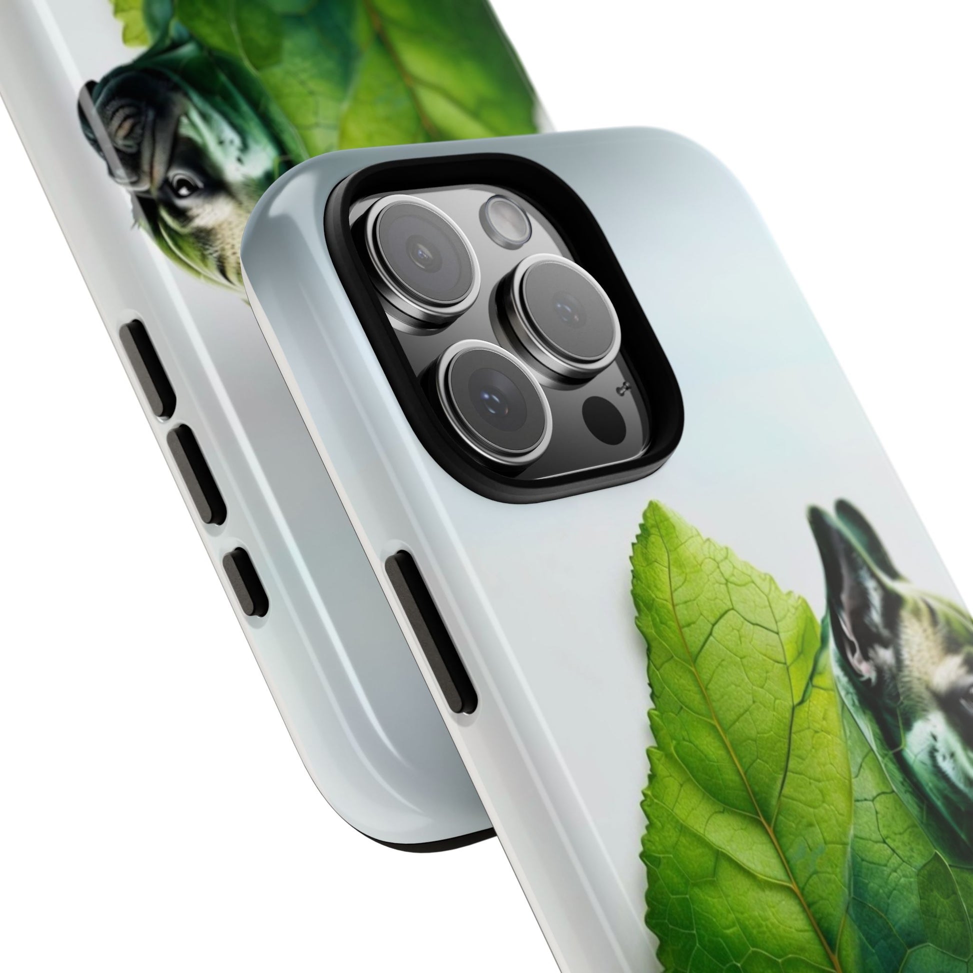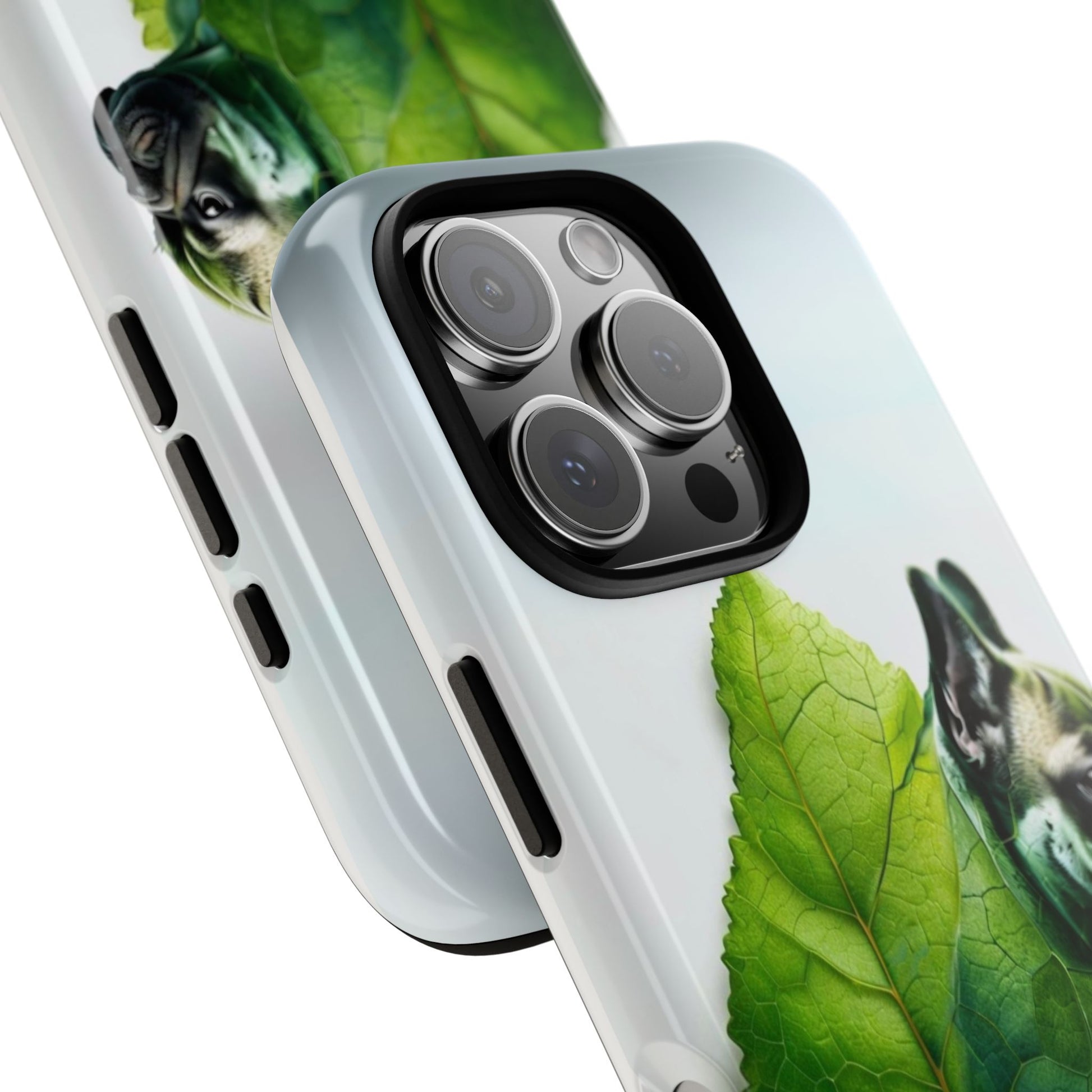 A phone cover where canine charm meets lush, leafy elegance. This cover features a silhouette of a dog infused with delicate green veining. Pawsitively stylish.
