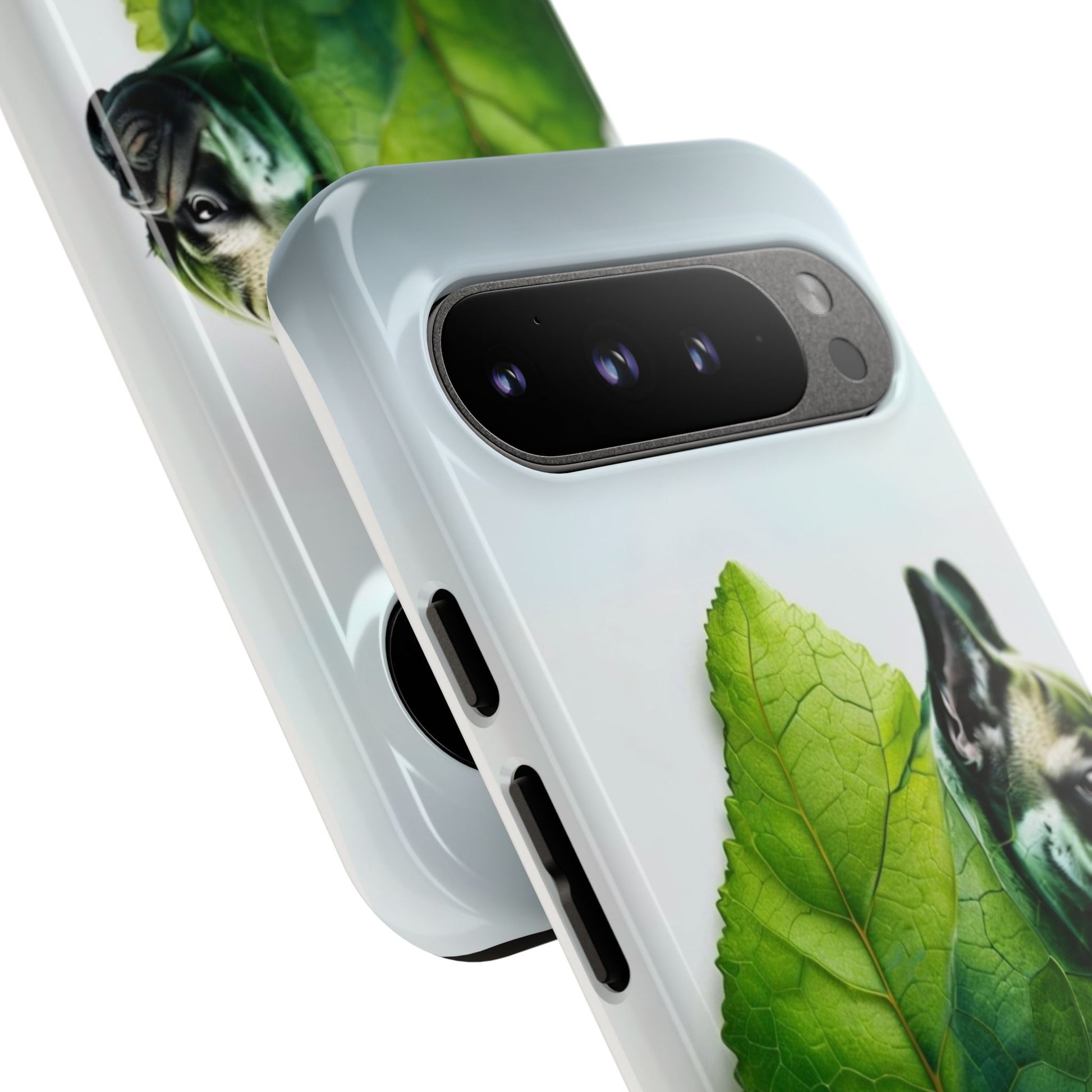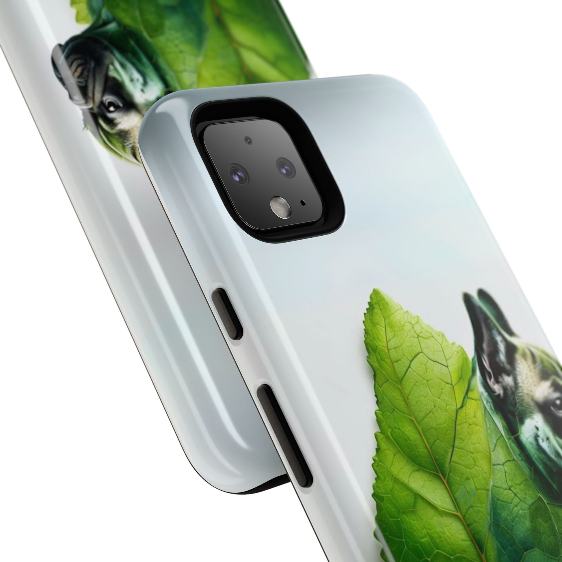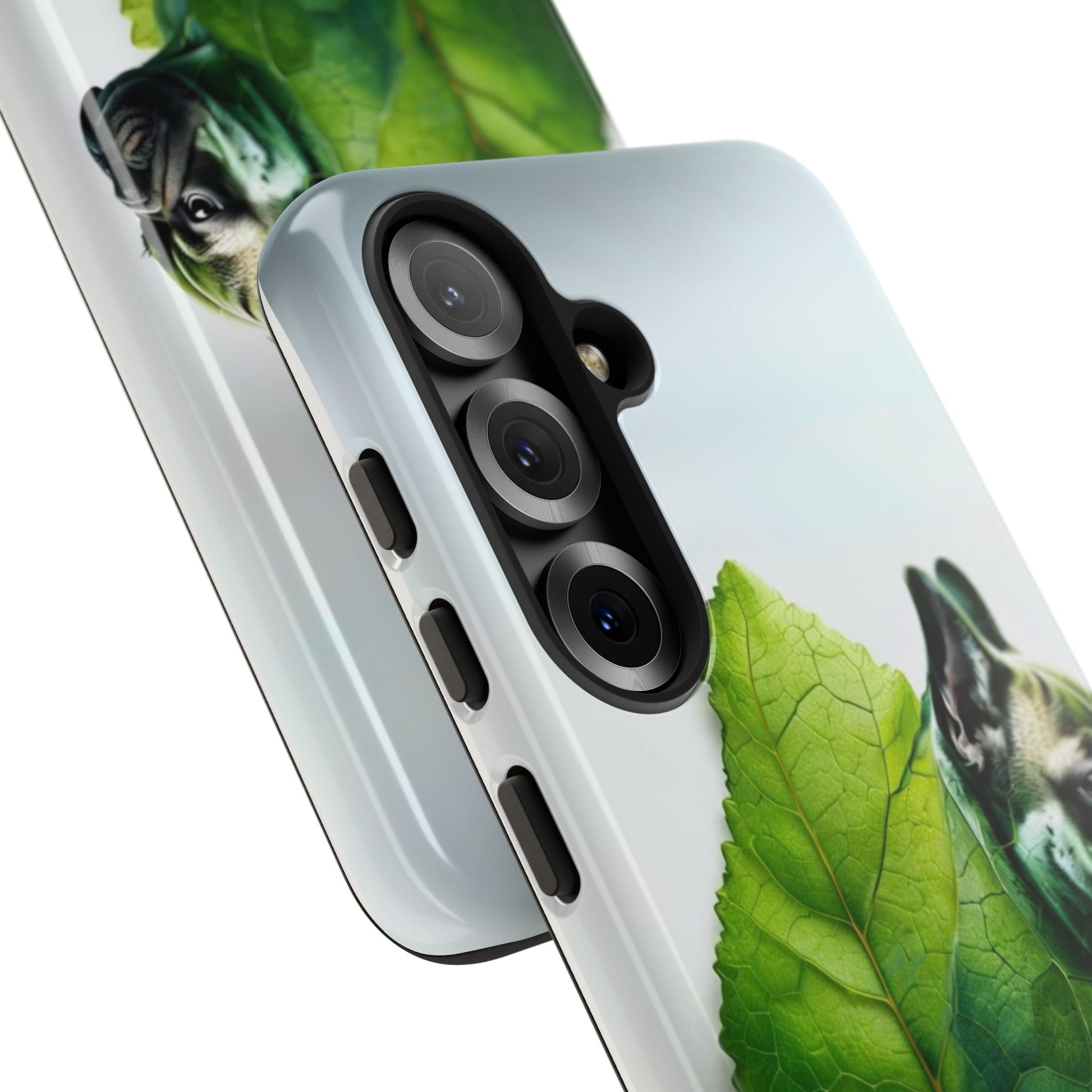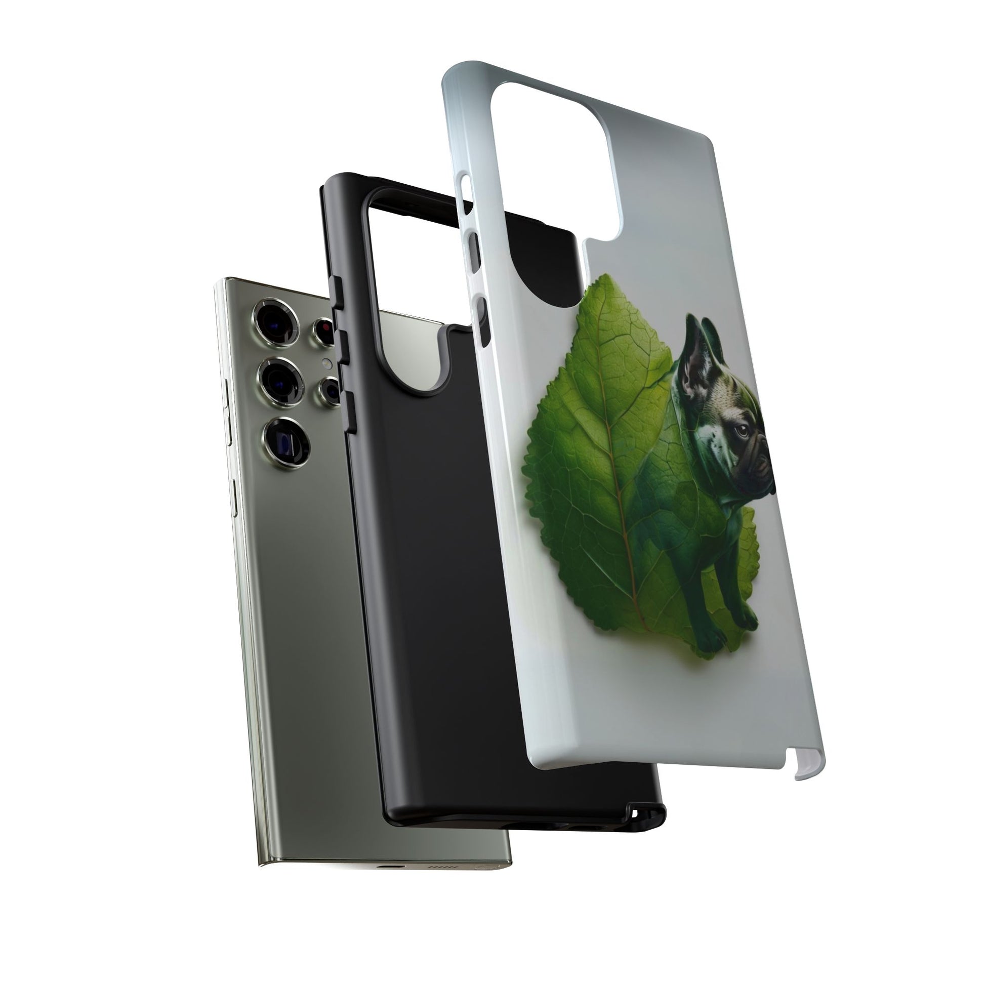 A phone cover where canine charm meets lush, leafy elegance. This cover features a silhouette of a dog infused with delicate green veining. Pawsitively stylish.