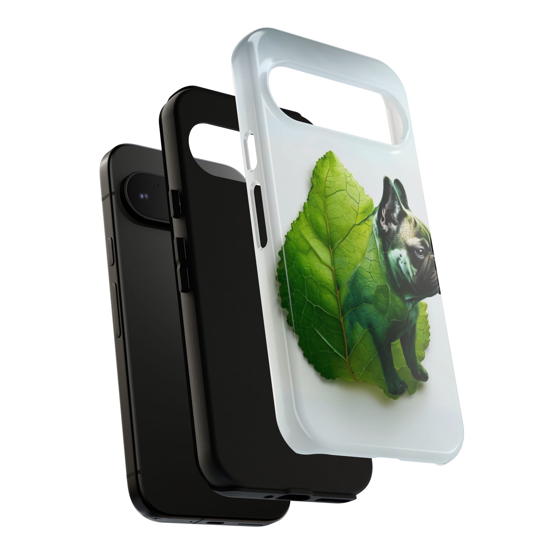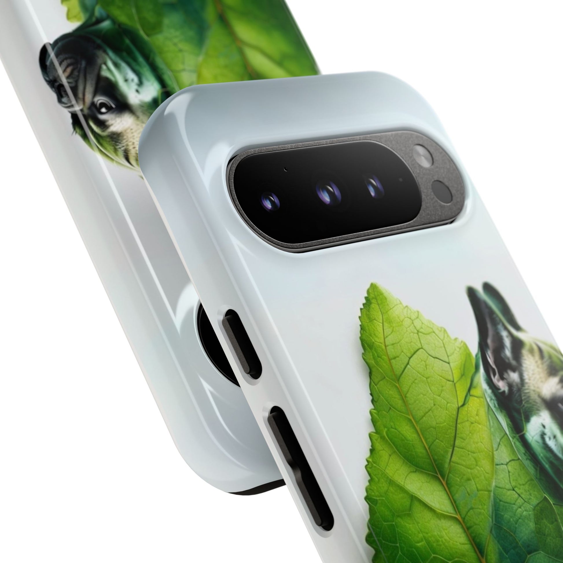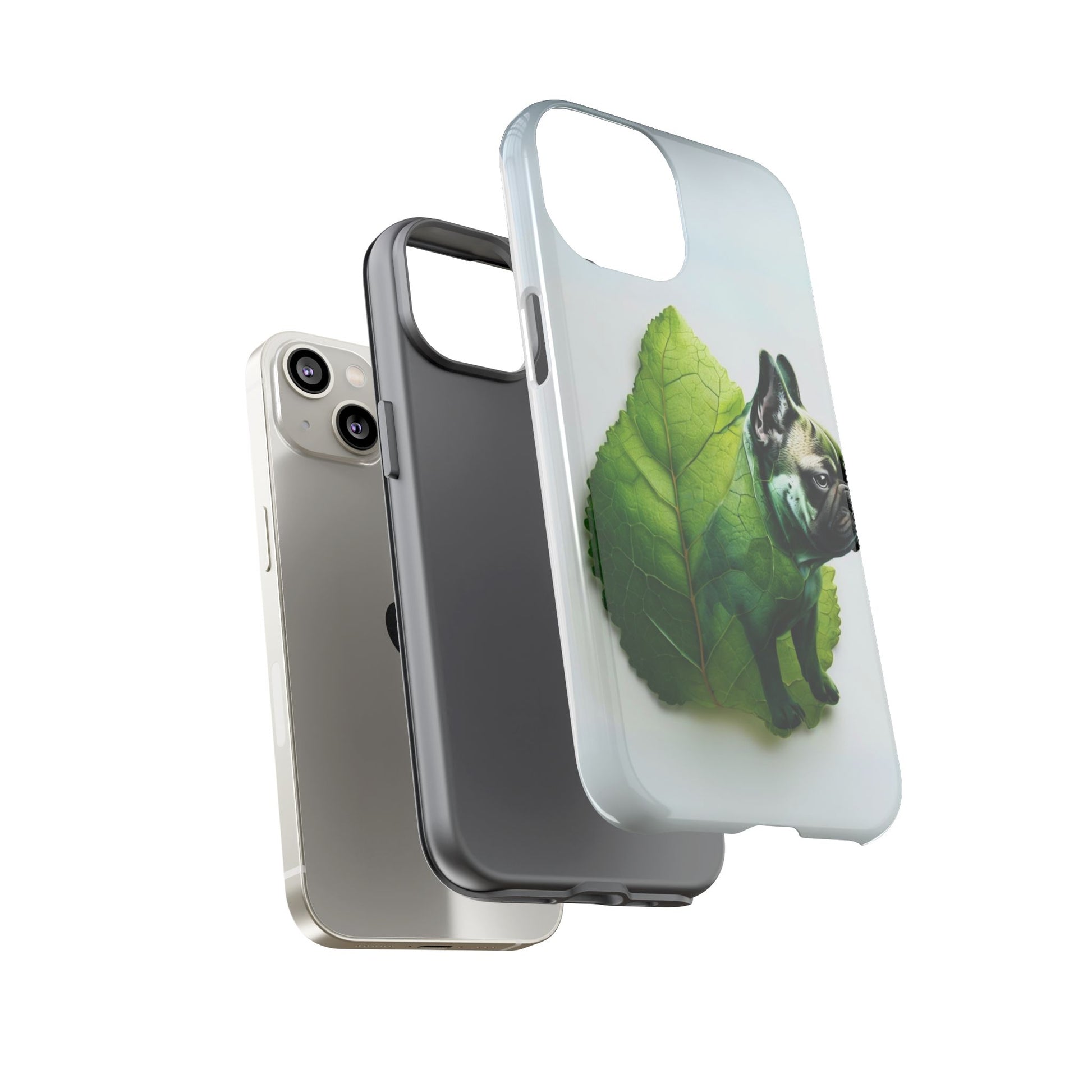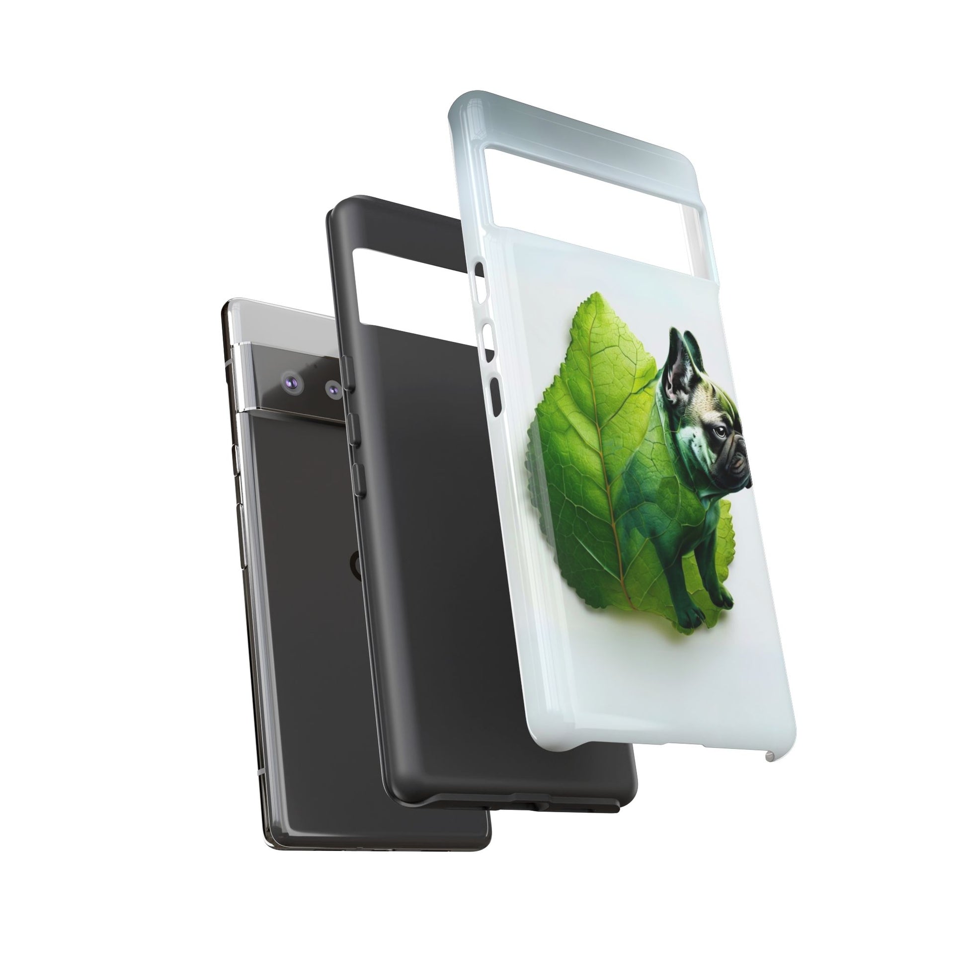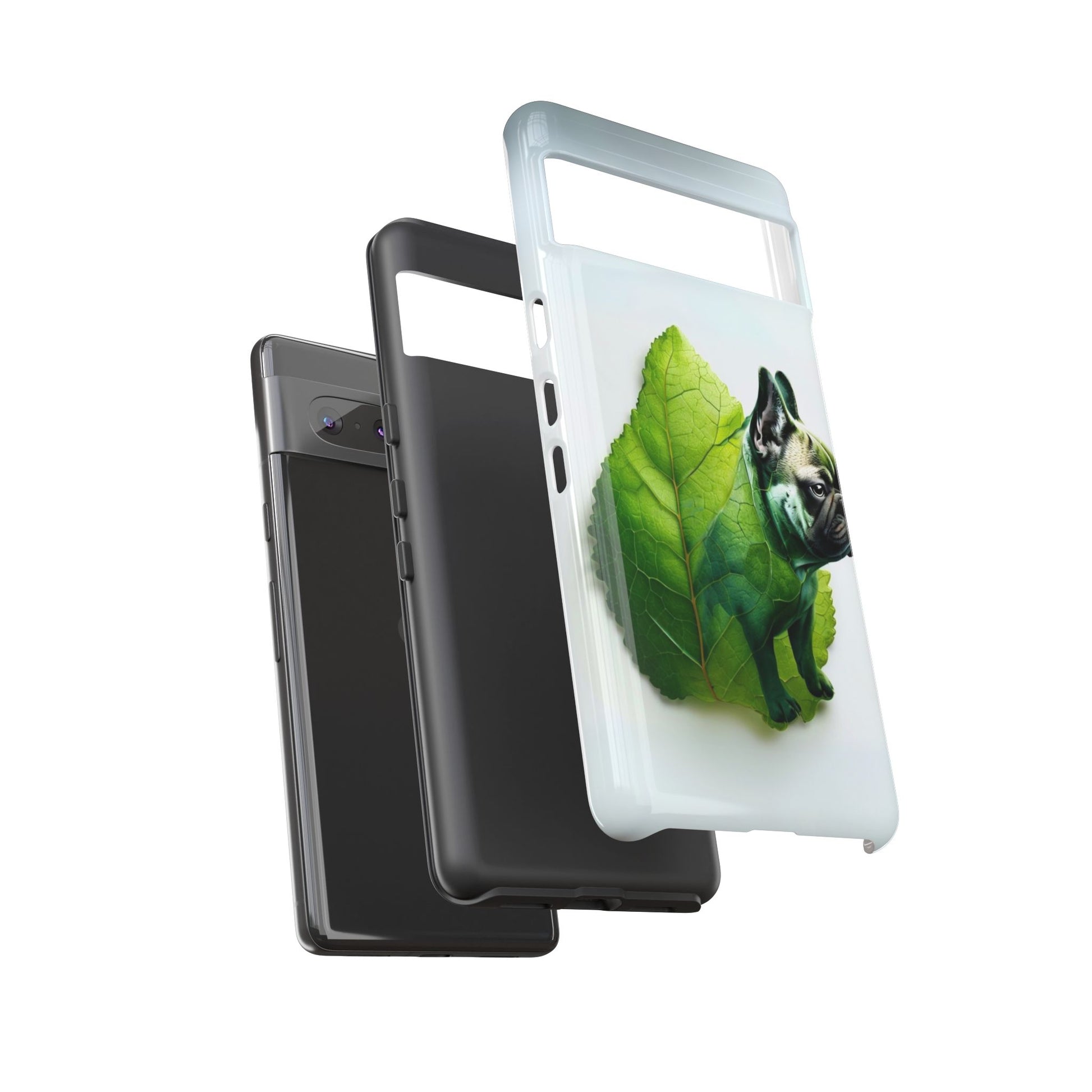 A phone cover where canine charm meets lush, leafy elegance. This cover features a silhouette of a dog infused with delicate green veining. Pawsitively stylish.