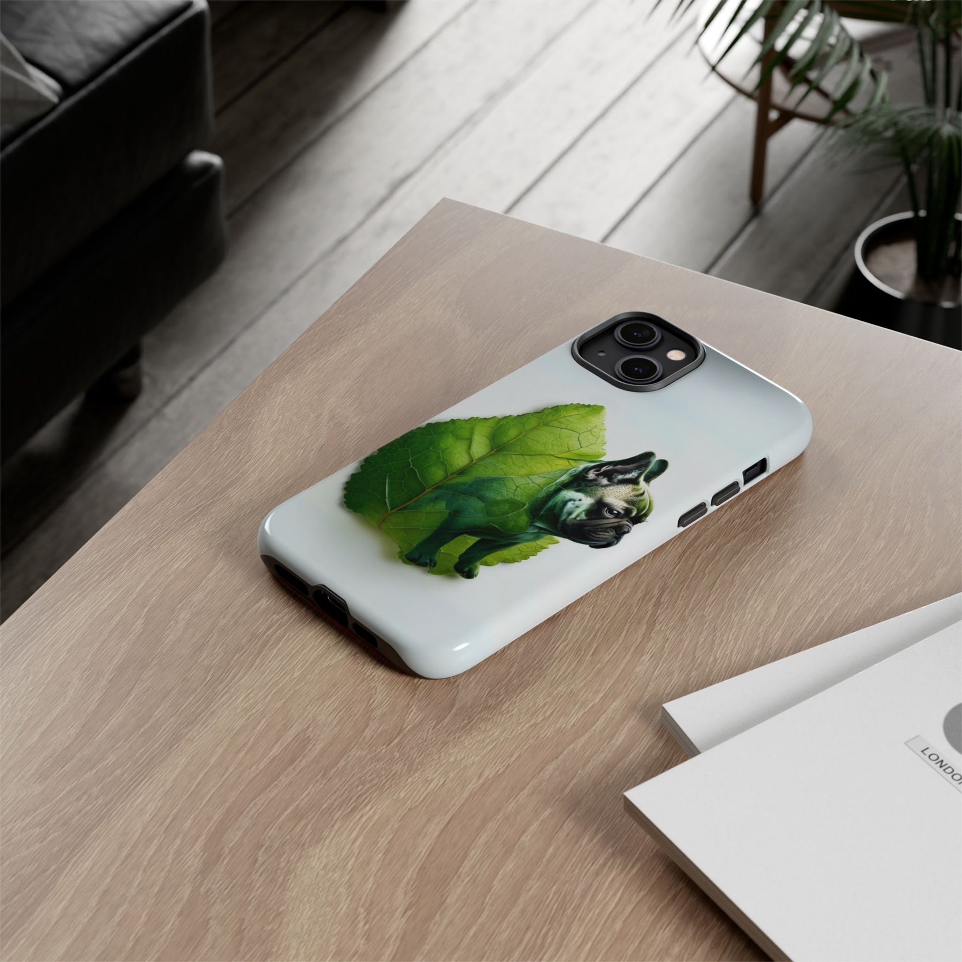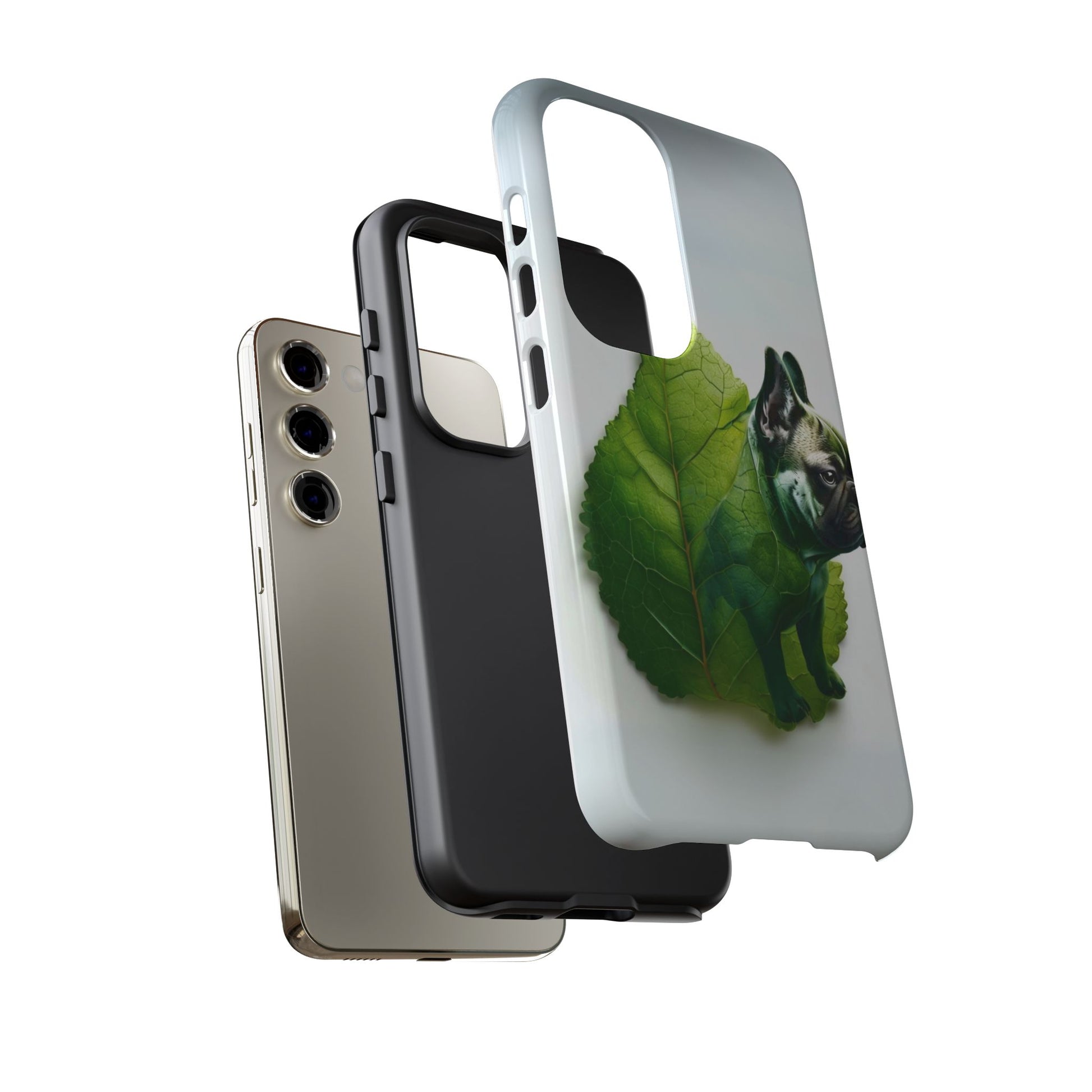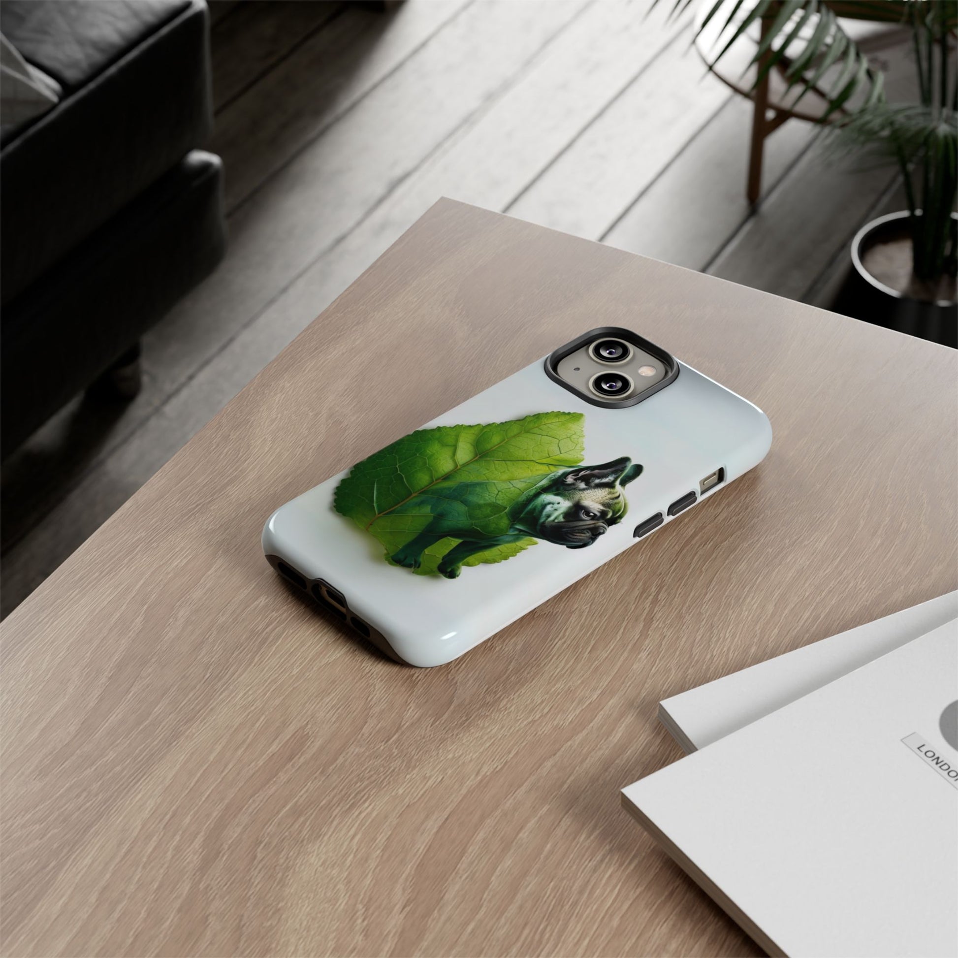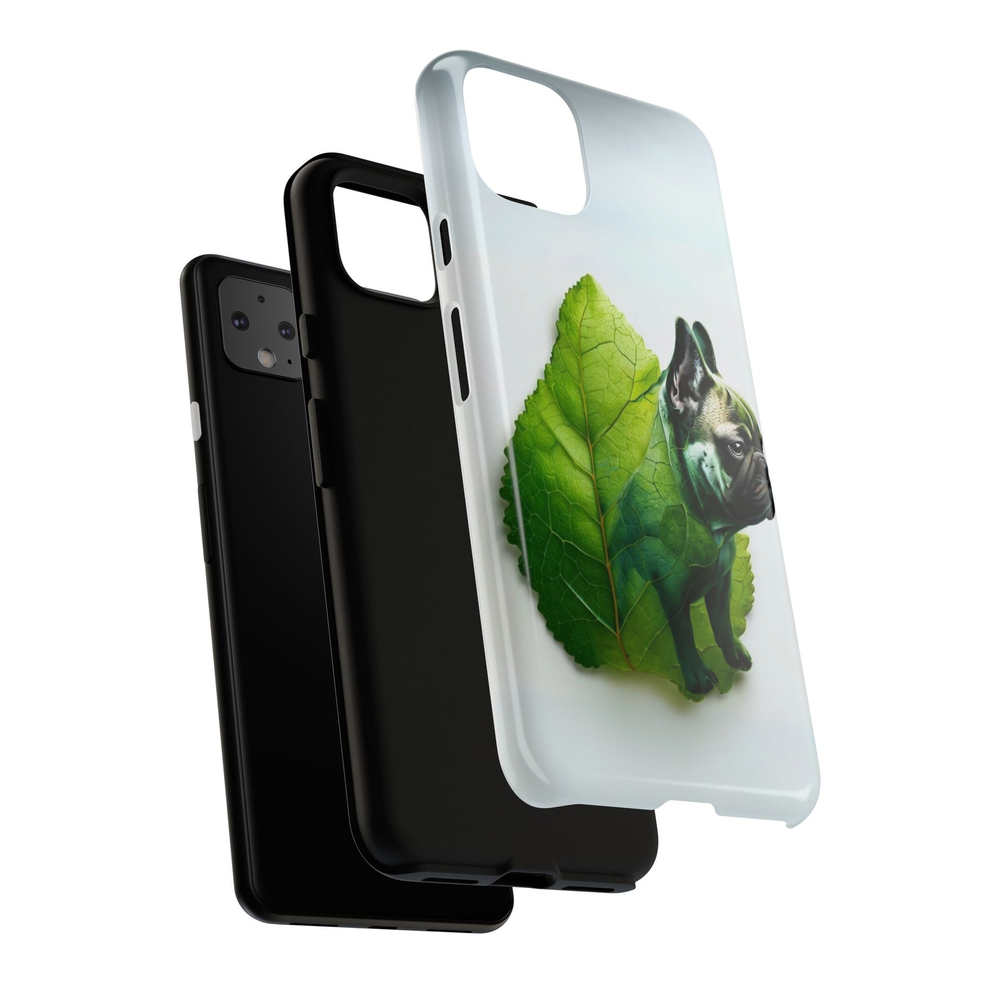 A phone cover where canine charm meets lush, leafy elegance. This cover features a silhouette of a dog infused with delicate green veining. Pawsitively stylish.