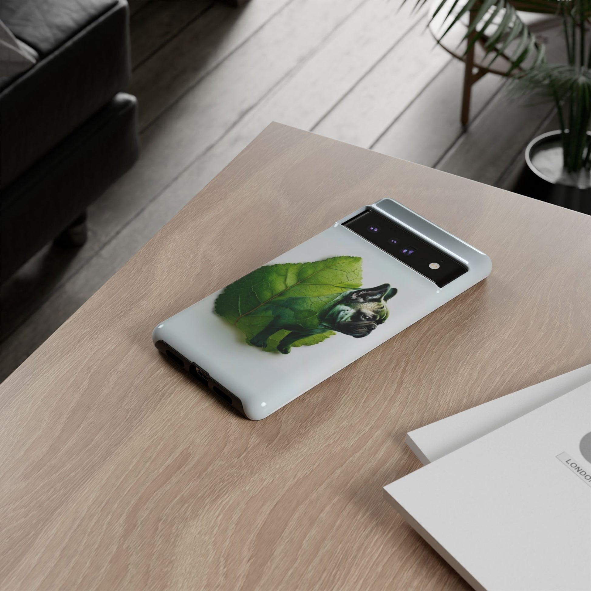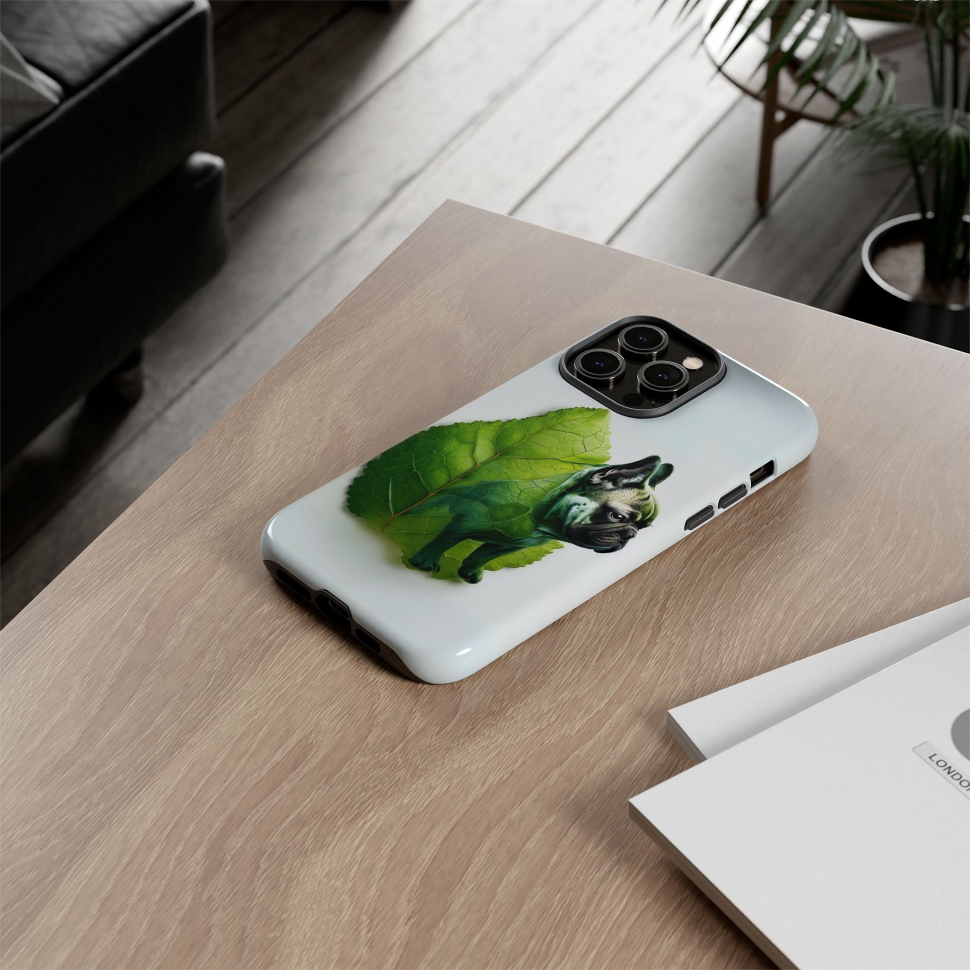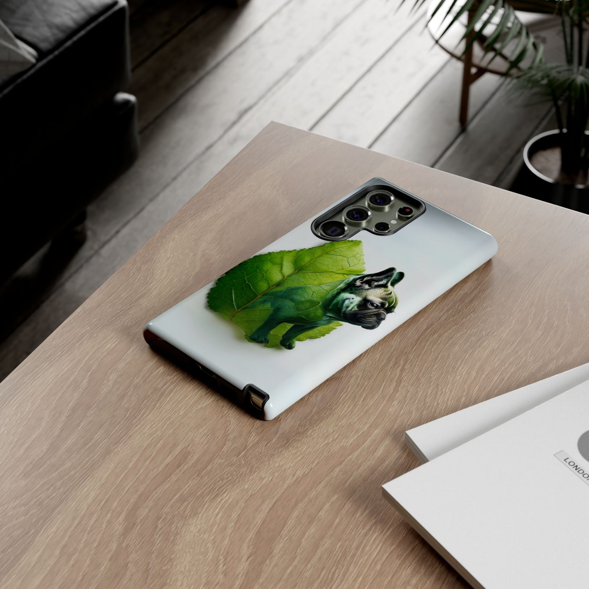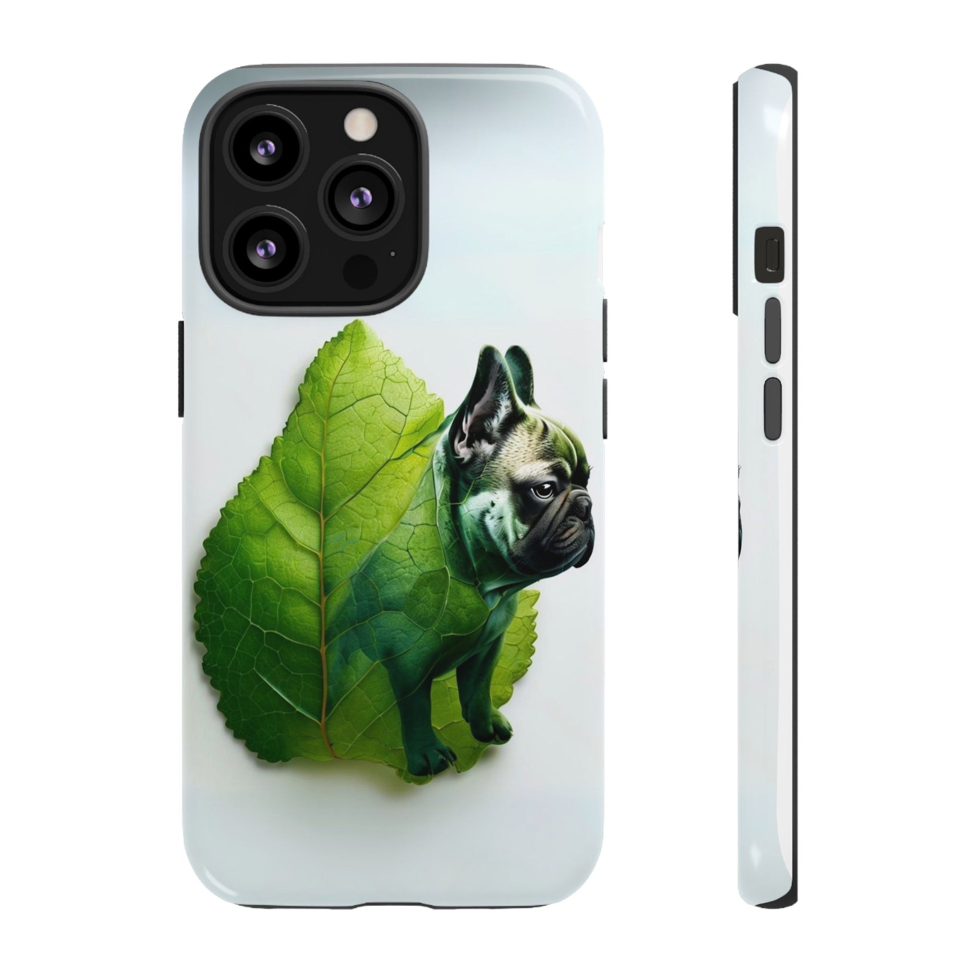 A phone cover where canine charm meets lush, leafy elegance. This cover features a silhouette of a dog infused with delicate green veining. Pawsitively stylish.