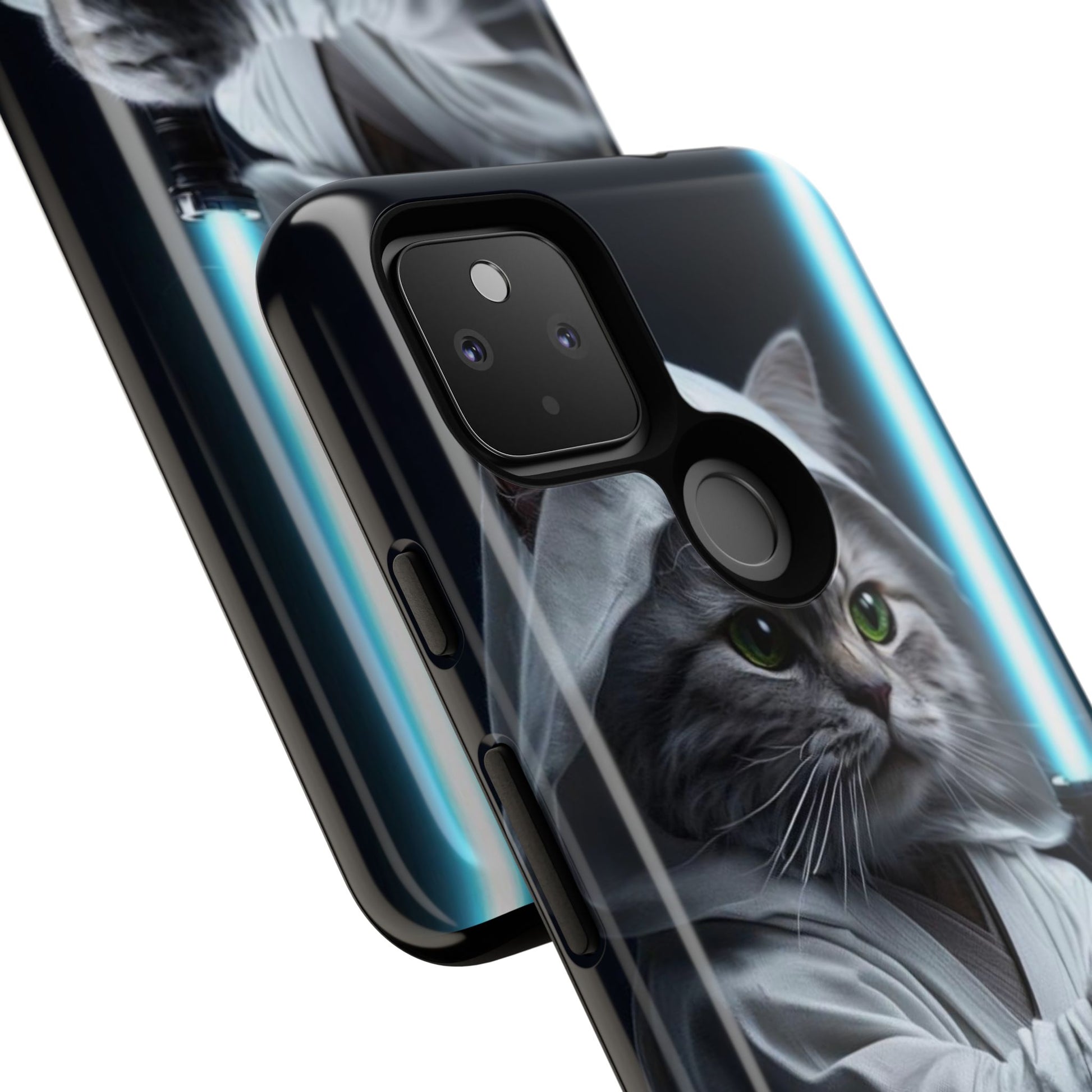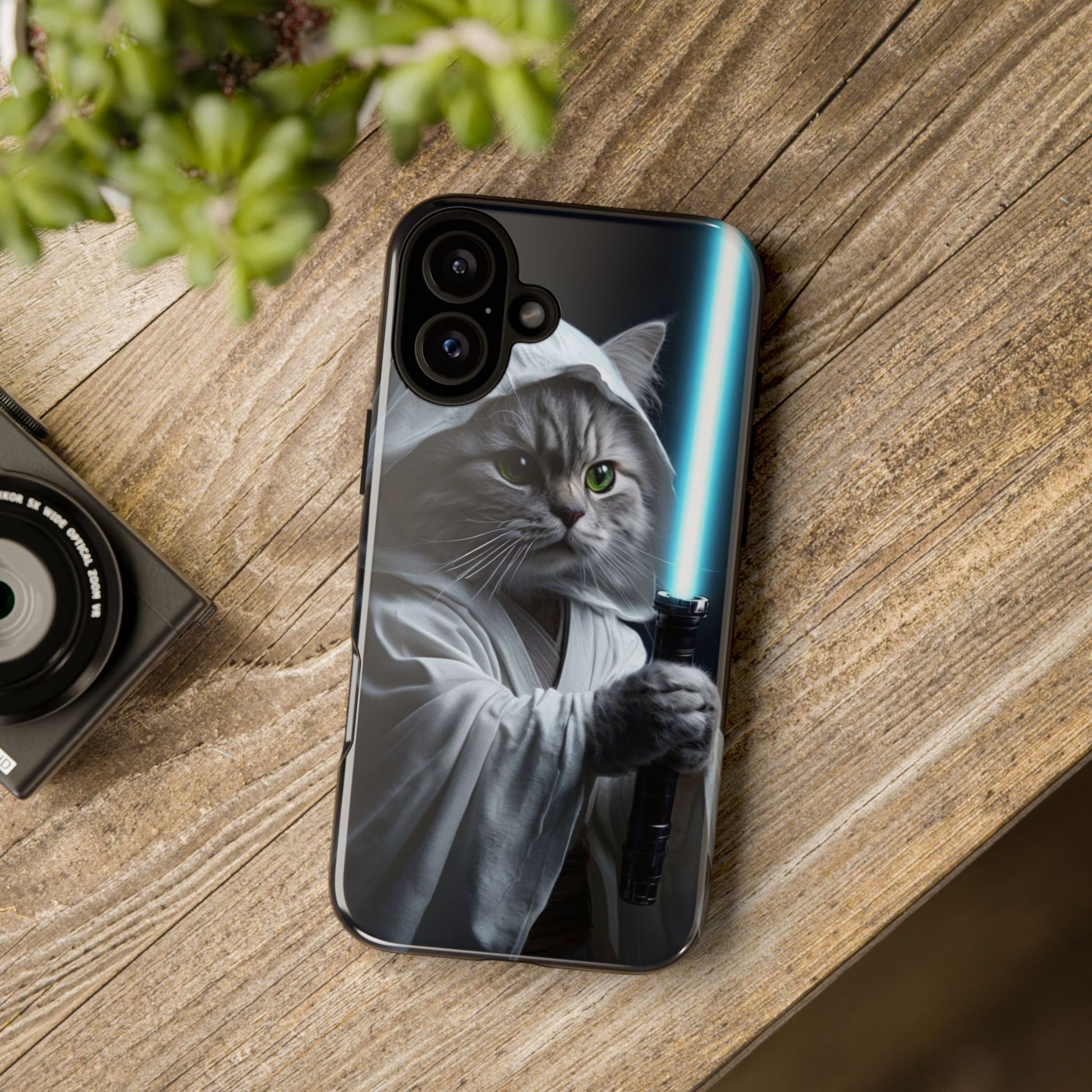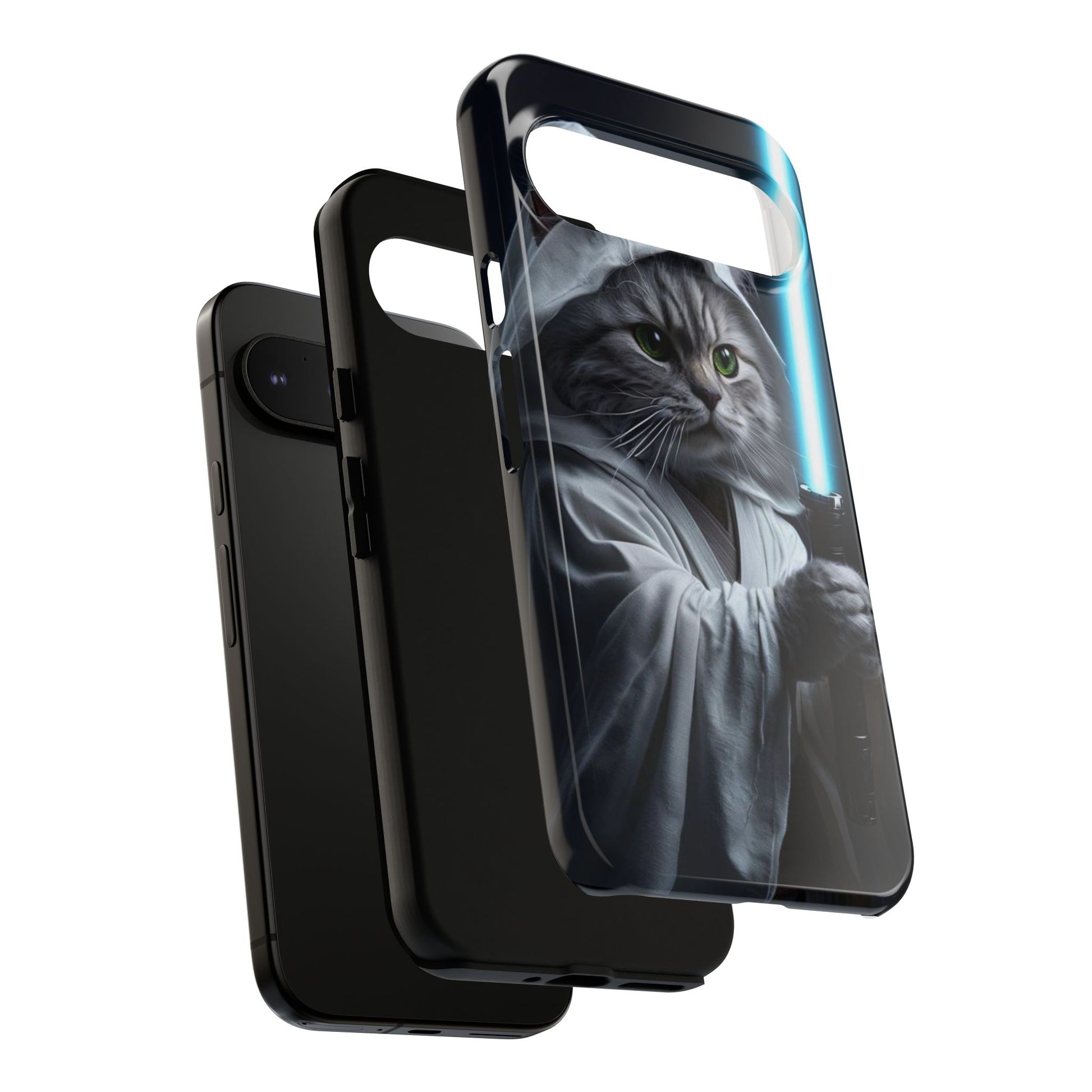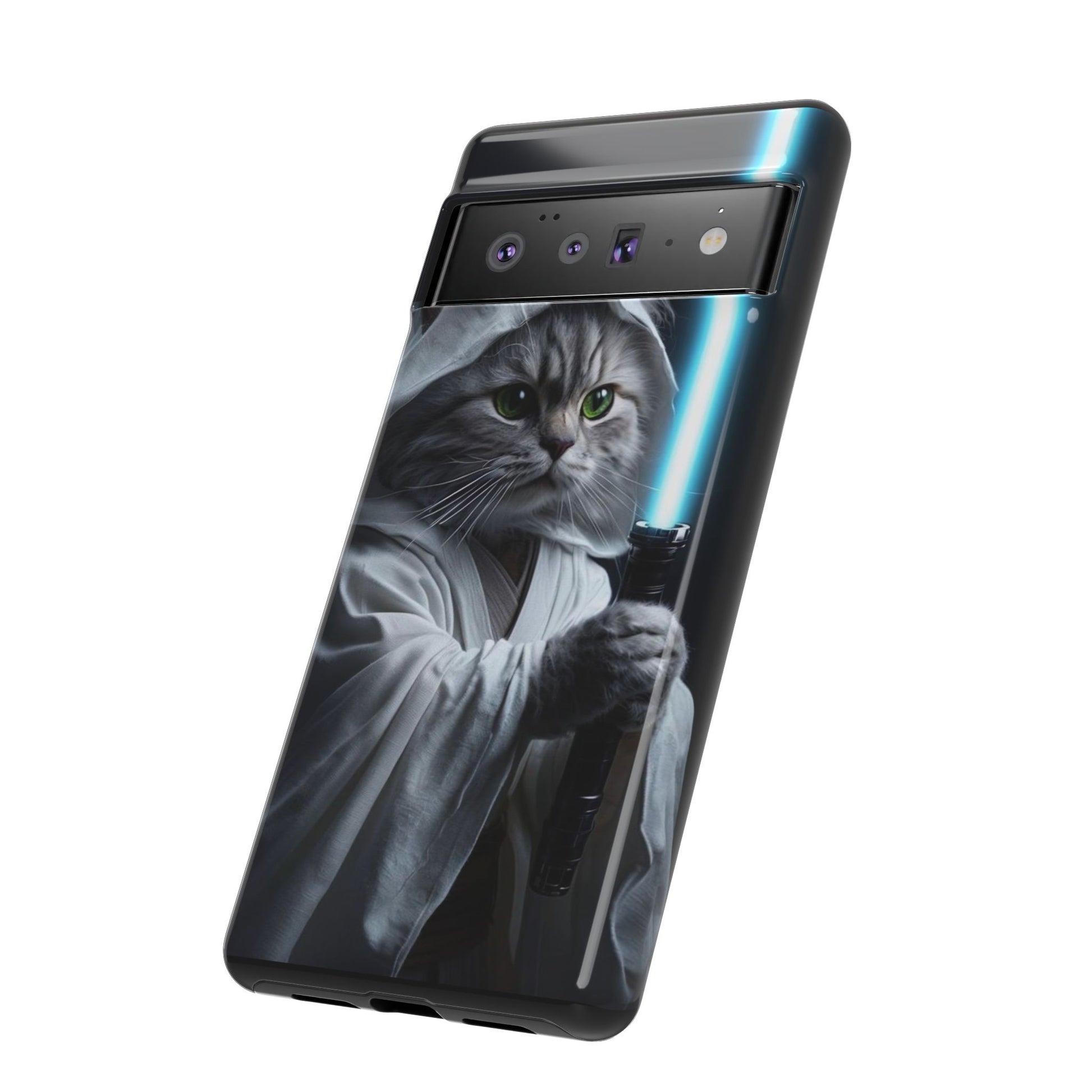 Protect your phone with a blend of humor and style using this unique phone case. Featuring a playful design of a cat dressed as a Jedi with a lightsaber, this phone case adds a touch of whimsy to your everyday accessories. It’s not just visually appealing; its durable construction ensures your device is safe from accidental drops and impacts. This phone case is perfect for cat lovers, sci-fi fans, or anyone looking to showcase their personality through their gadgets. Ideal for birthdays, holidays, or just a gift for yourself, this case brings fun to functionality.