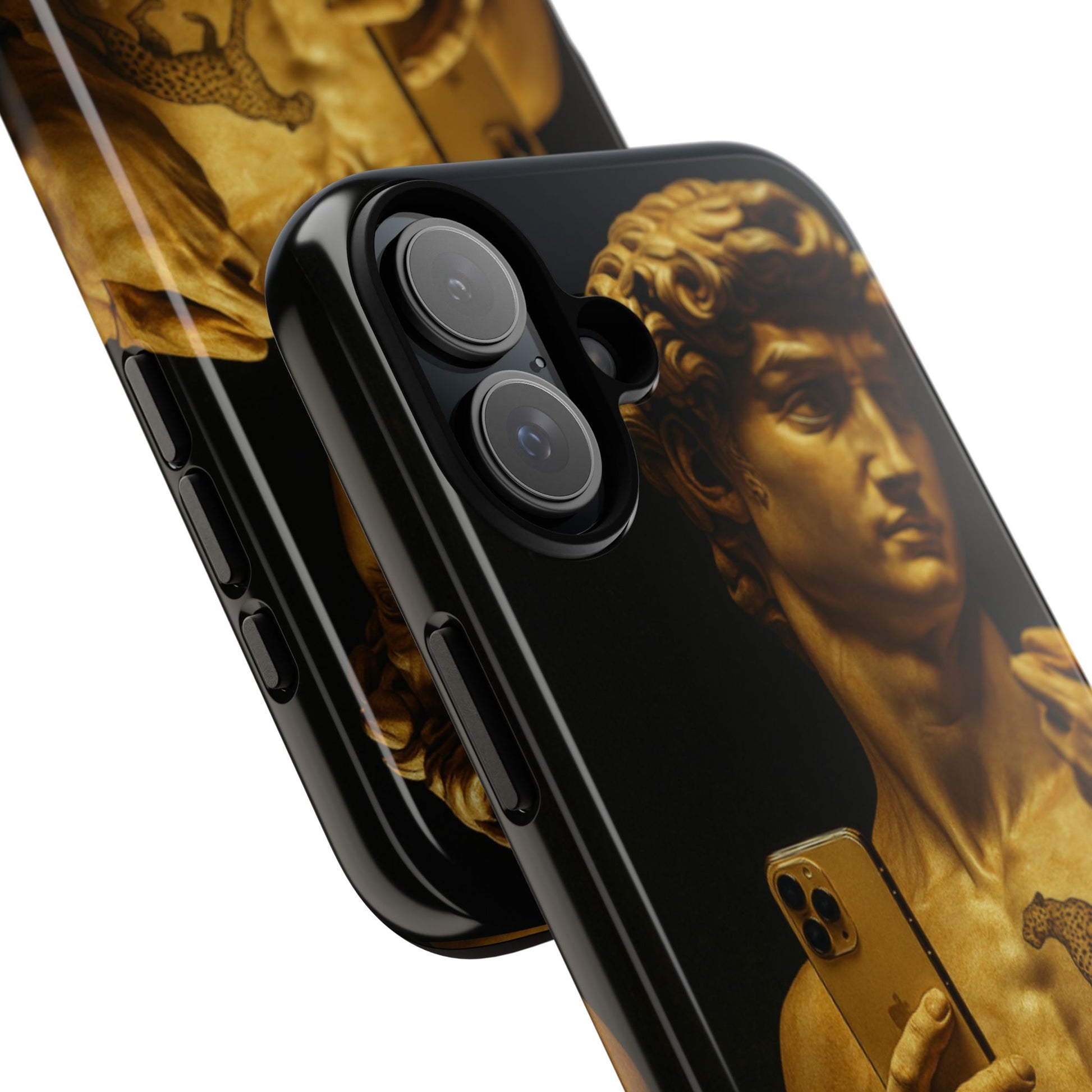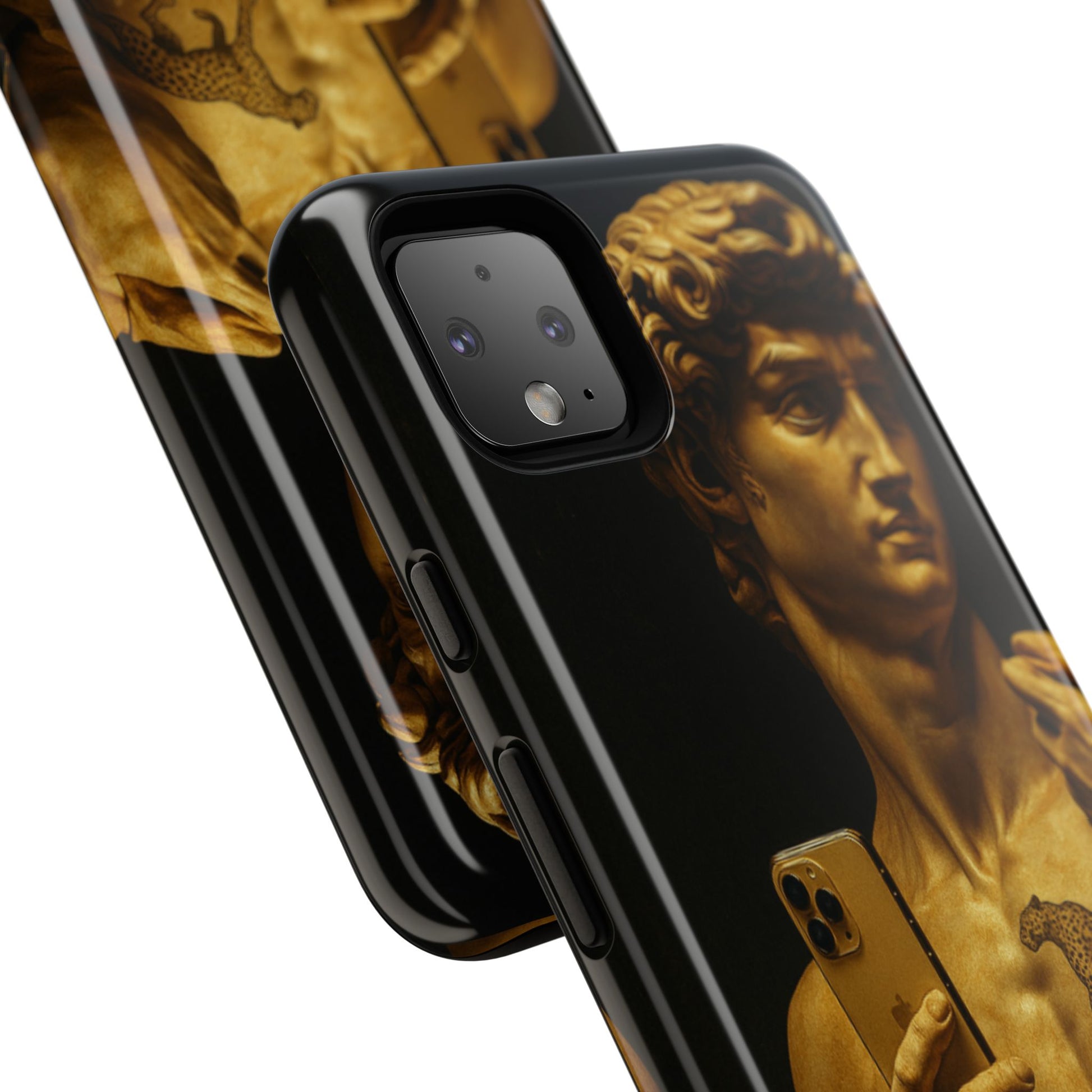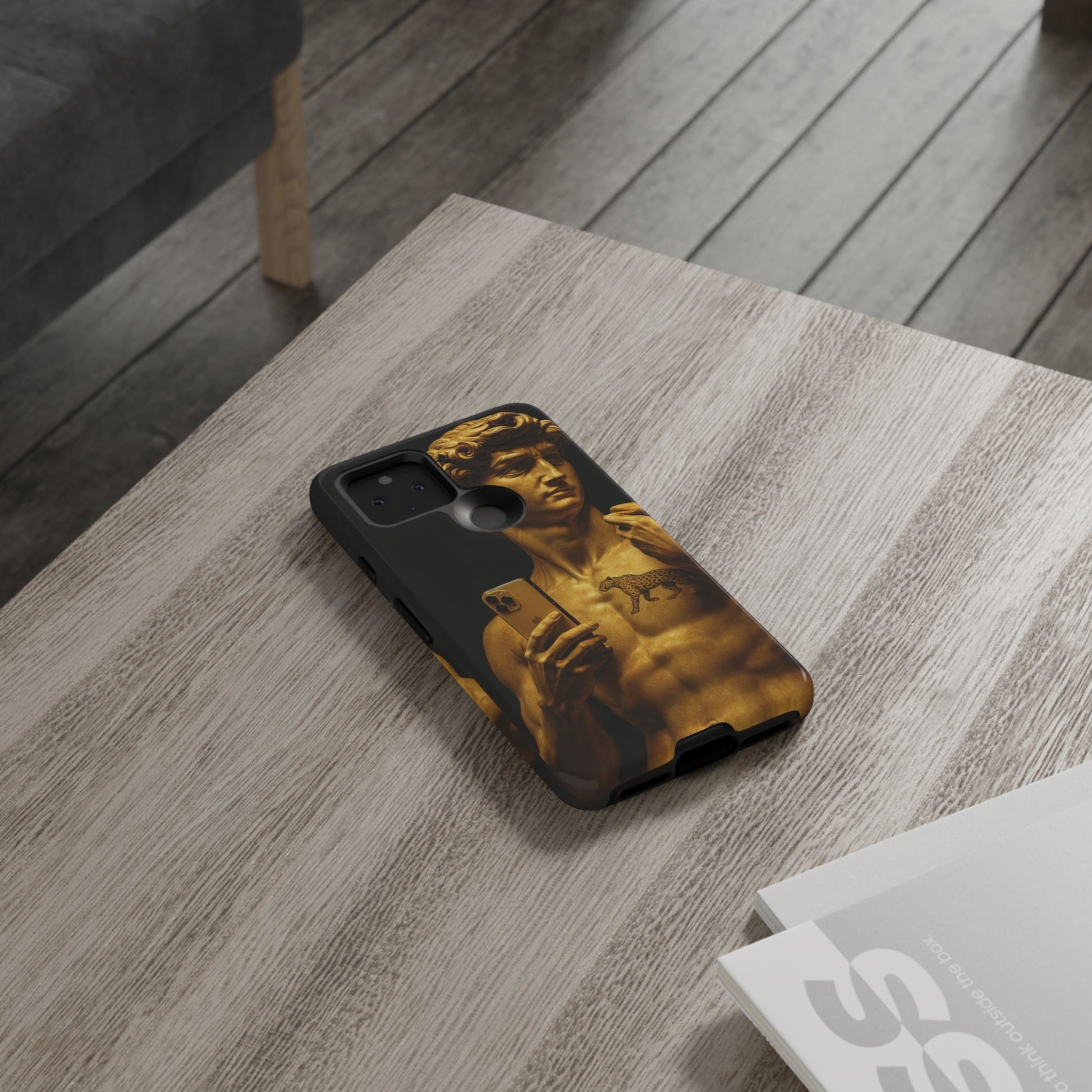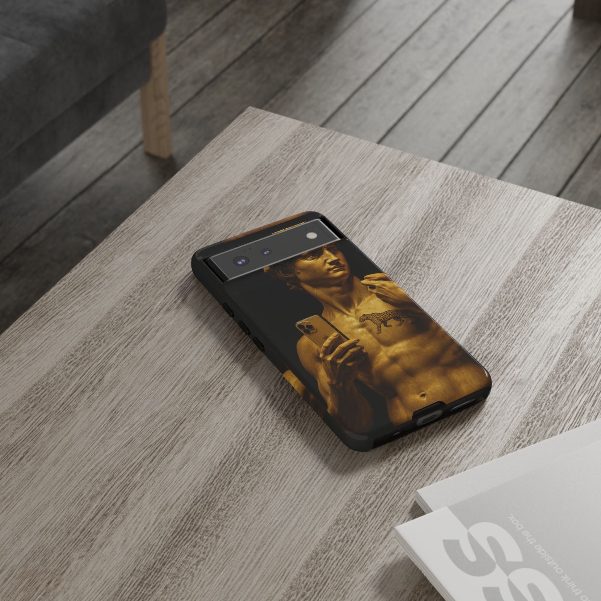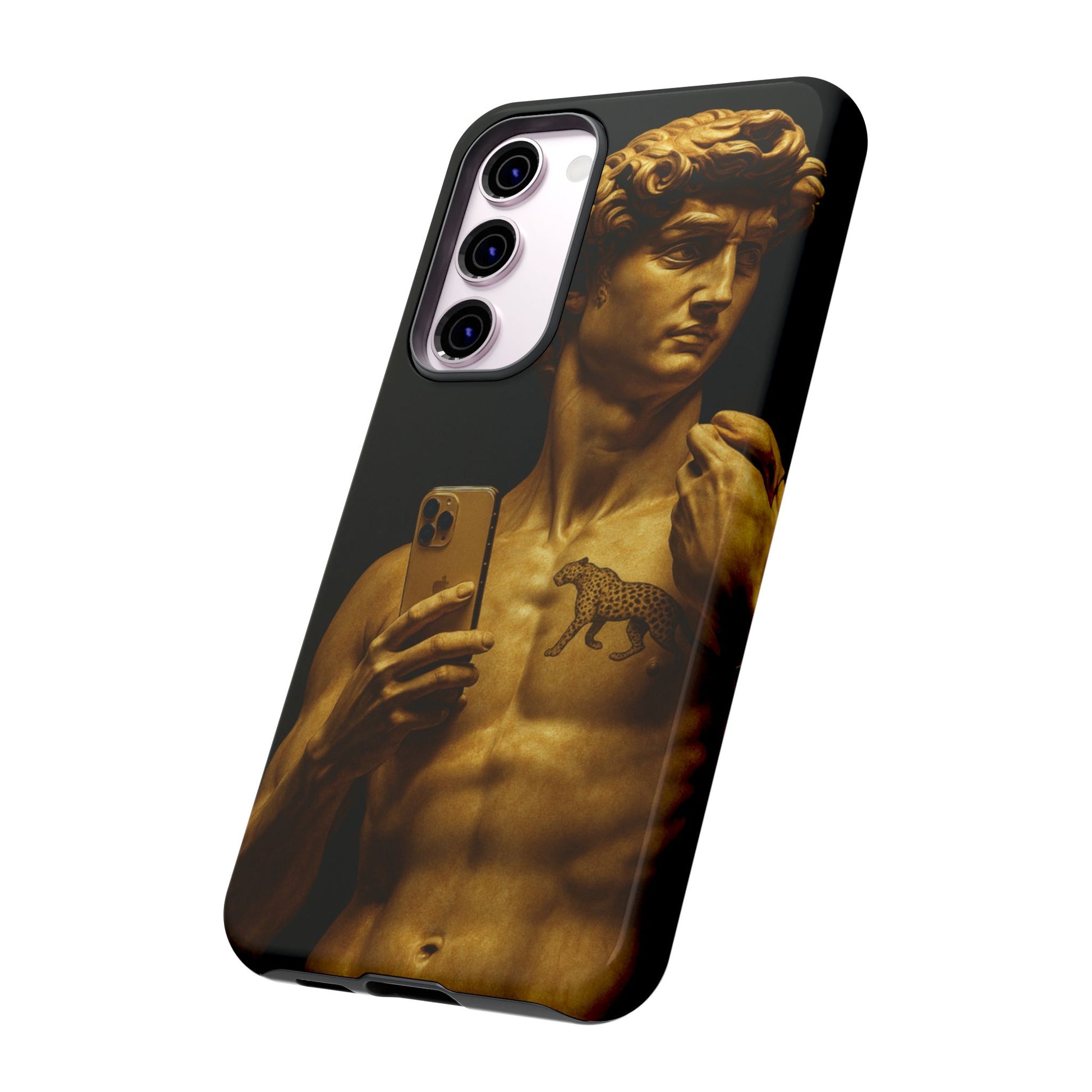 A striking reinterpretation of Michelangelo's "David", preserving the classical power while layering in bold, contemporary detail like a Smart phone and Prada-Esque cheetah tattoo.
