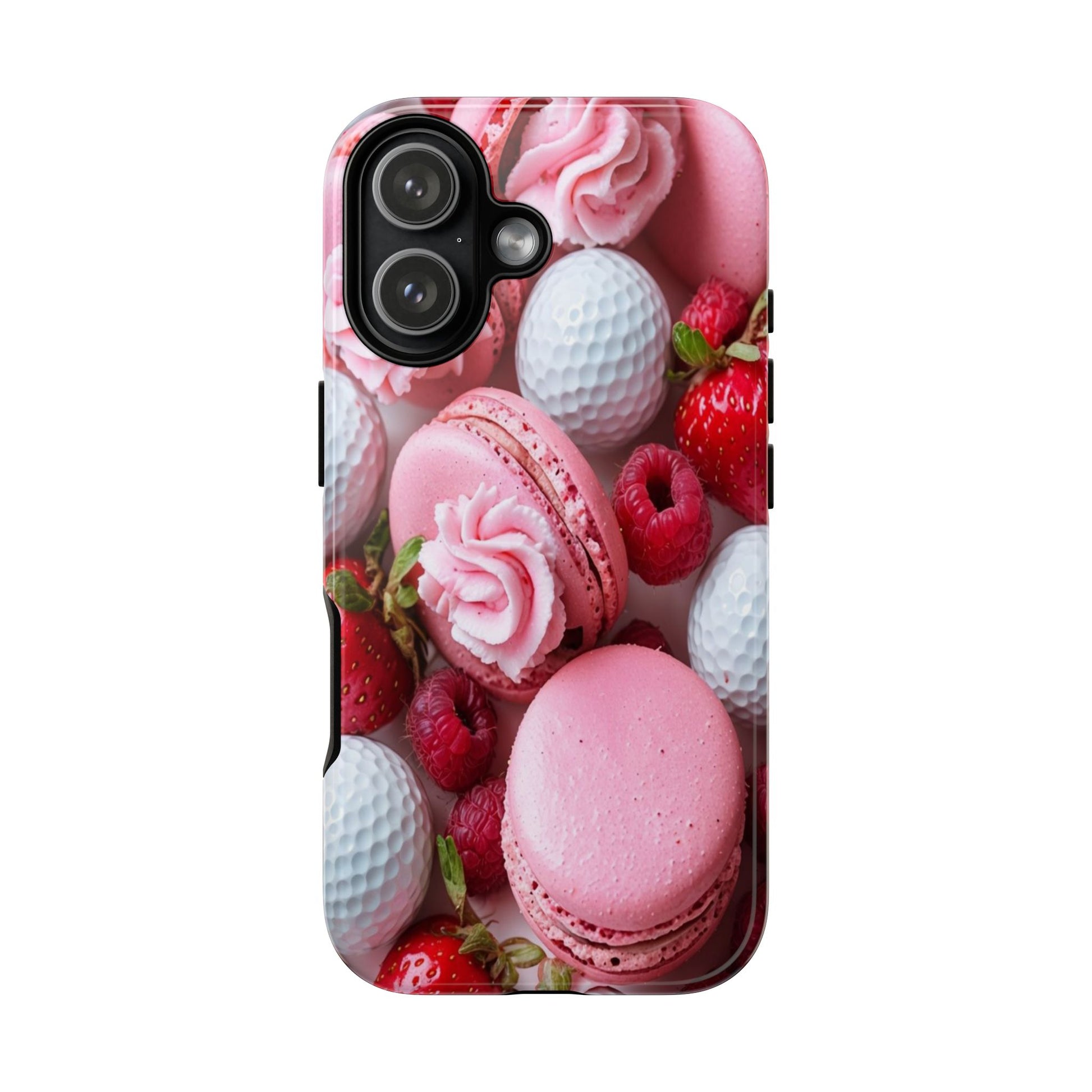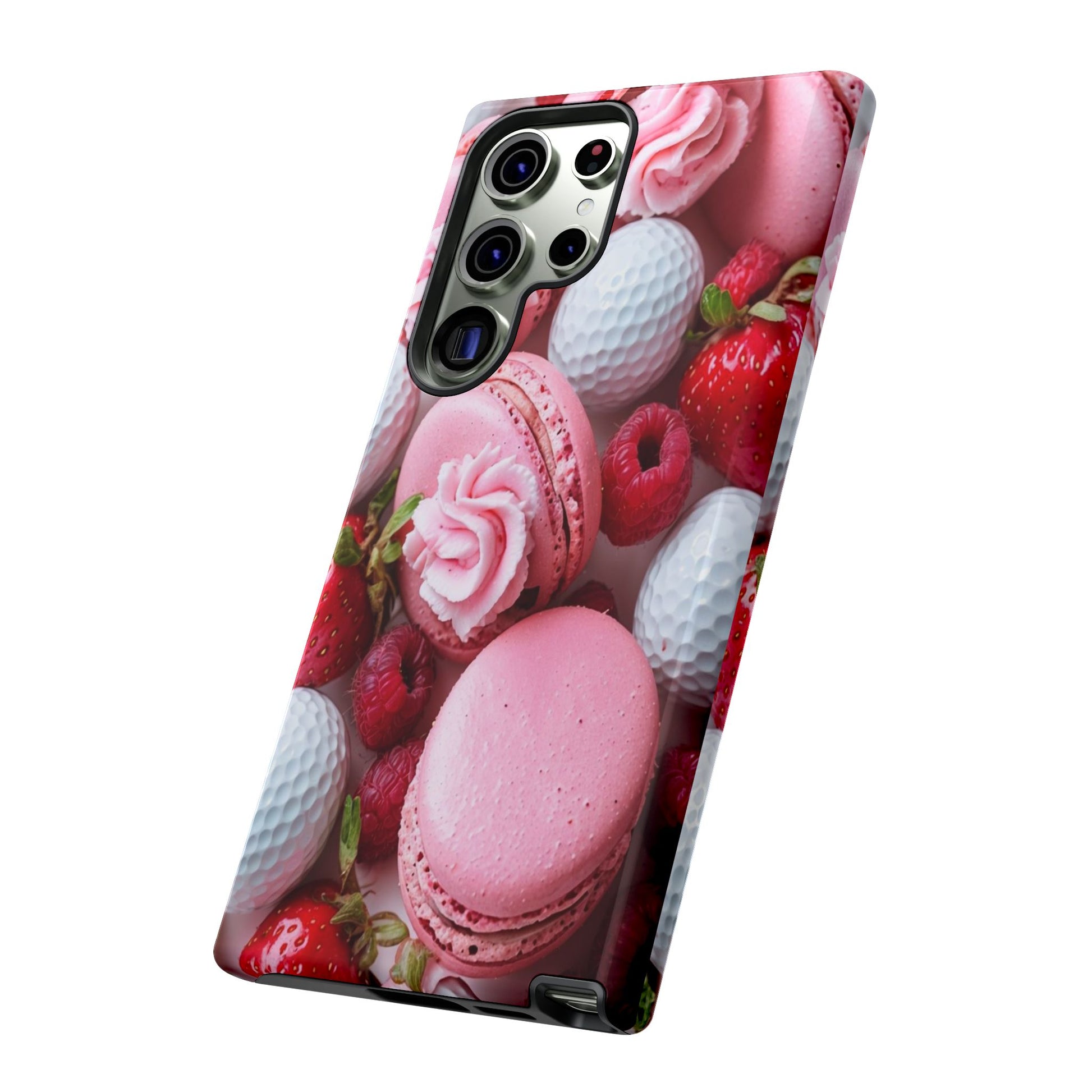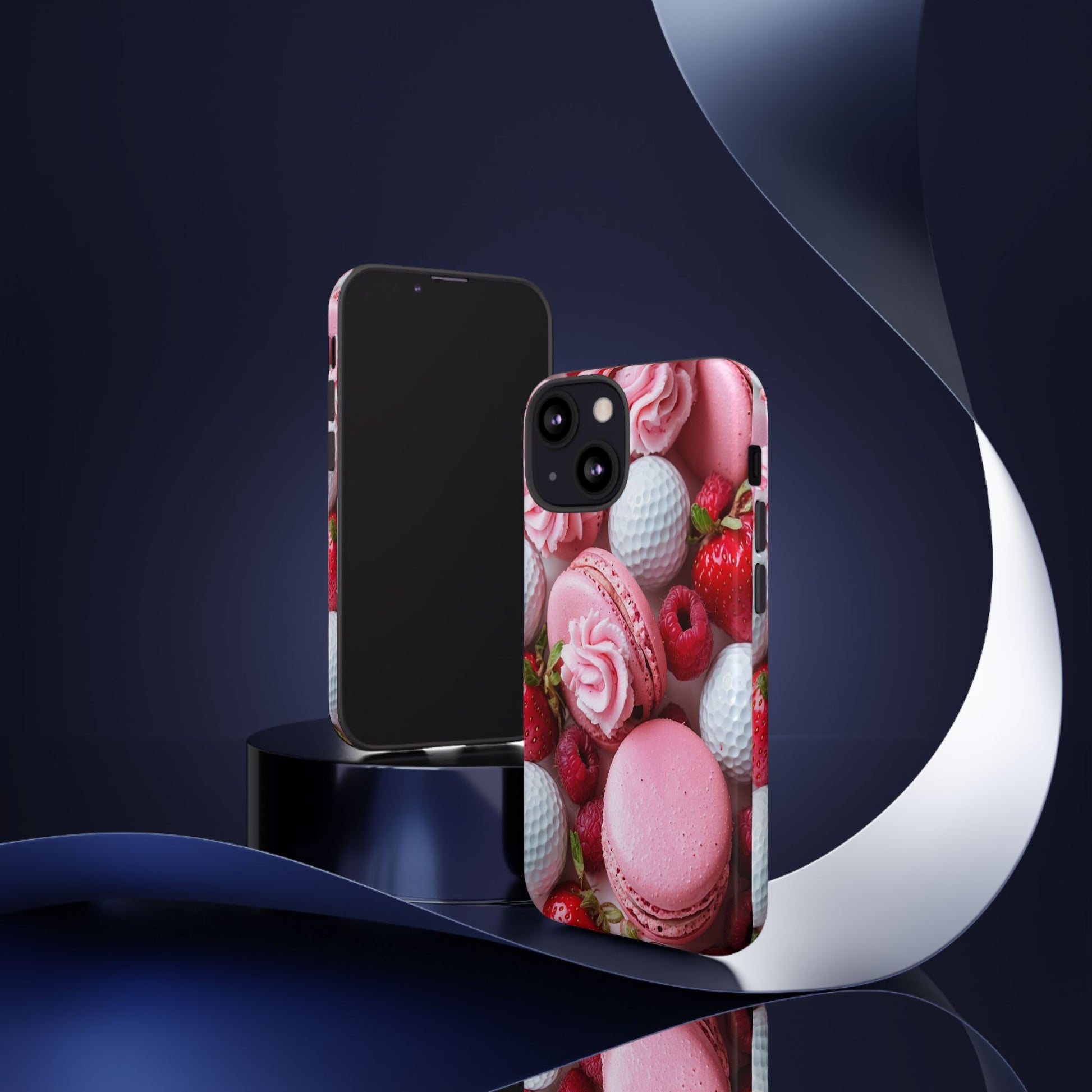 Introducing a vibrant phone case that not only protects your device but also adds a splash of joy to your daily life. Featuring a delightful design of pink macarons, strawberries, and golf balls, this phone case embodies a playful and cheerful atmosphere, perfect for anyone who loves to stand out while keeping their phone safe. Ideal for food lovers, golf enthusiasts, or anyone with a sweet tooth, this case makes a thoughtful gift for birthdays, holidays, or just because. Its aesthetic is perfect for spring and summer celebrations, lending a light-hearted vibe that matches the season's energy.