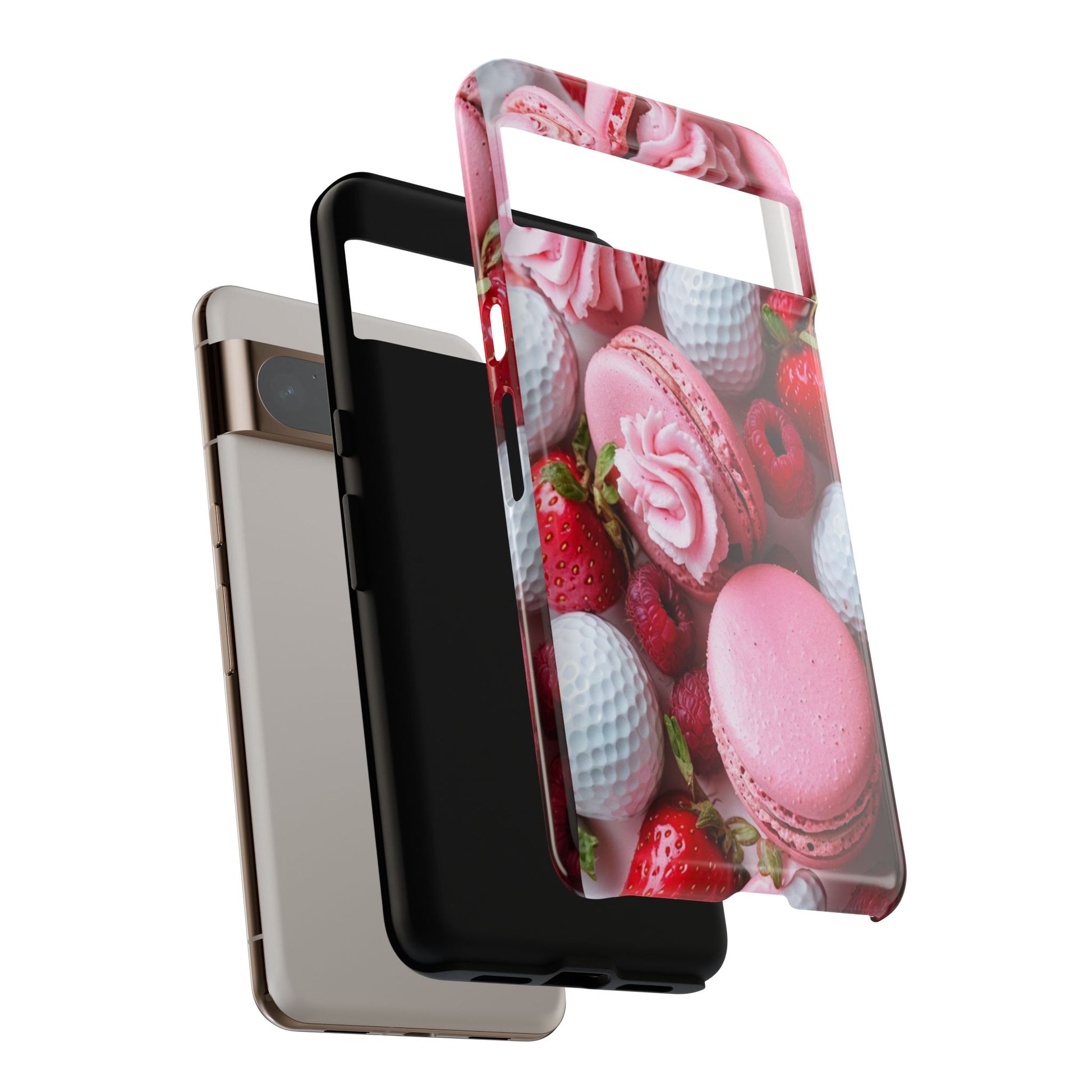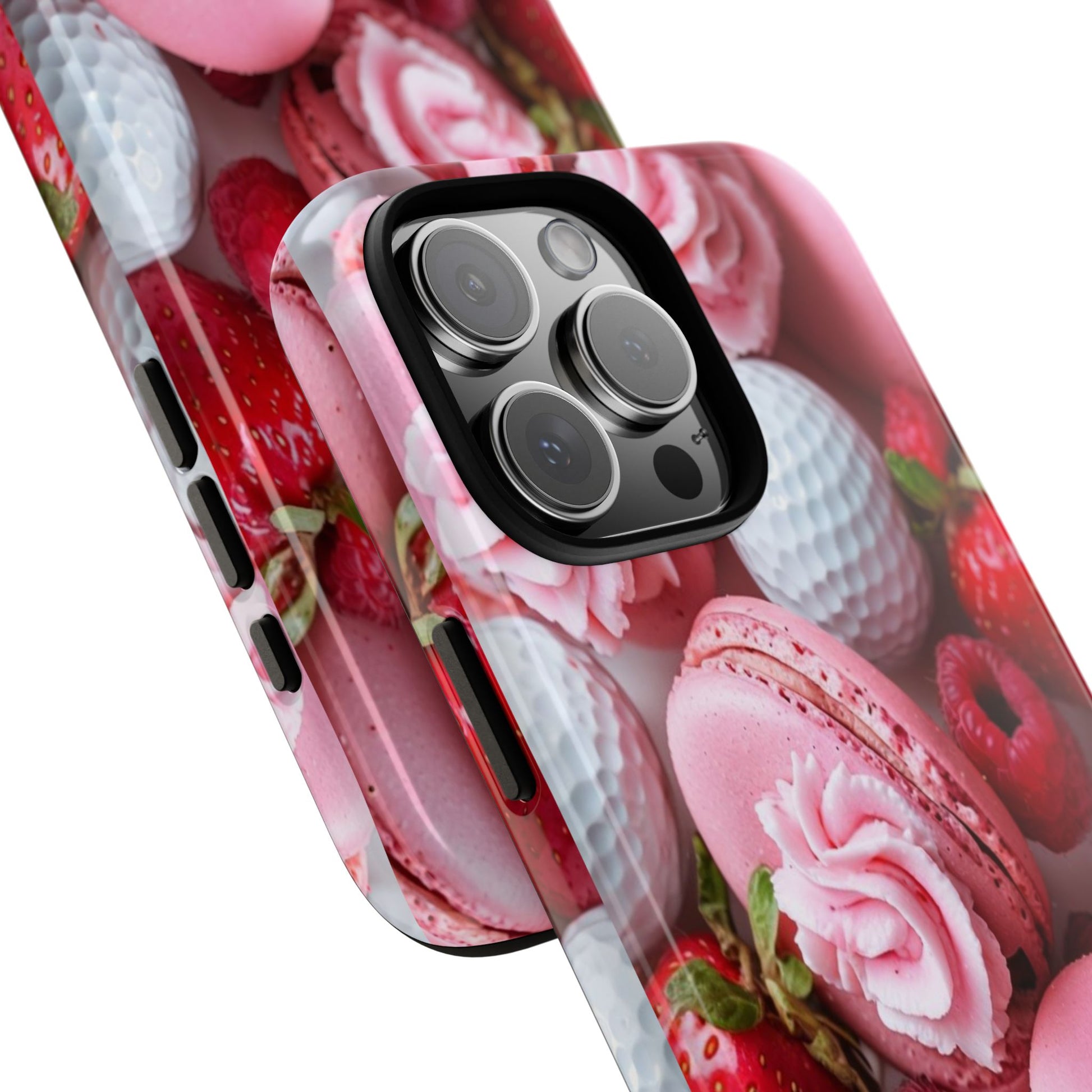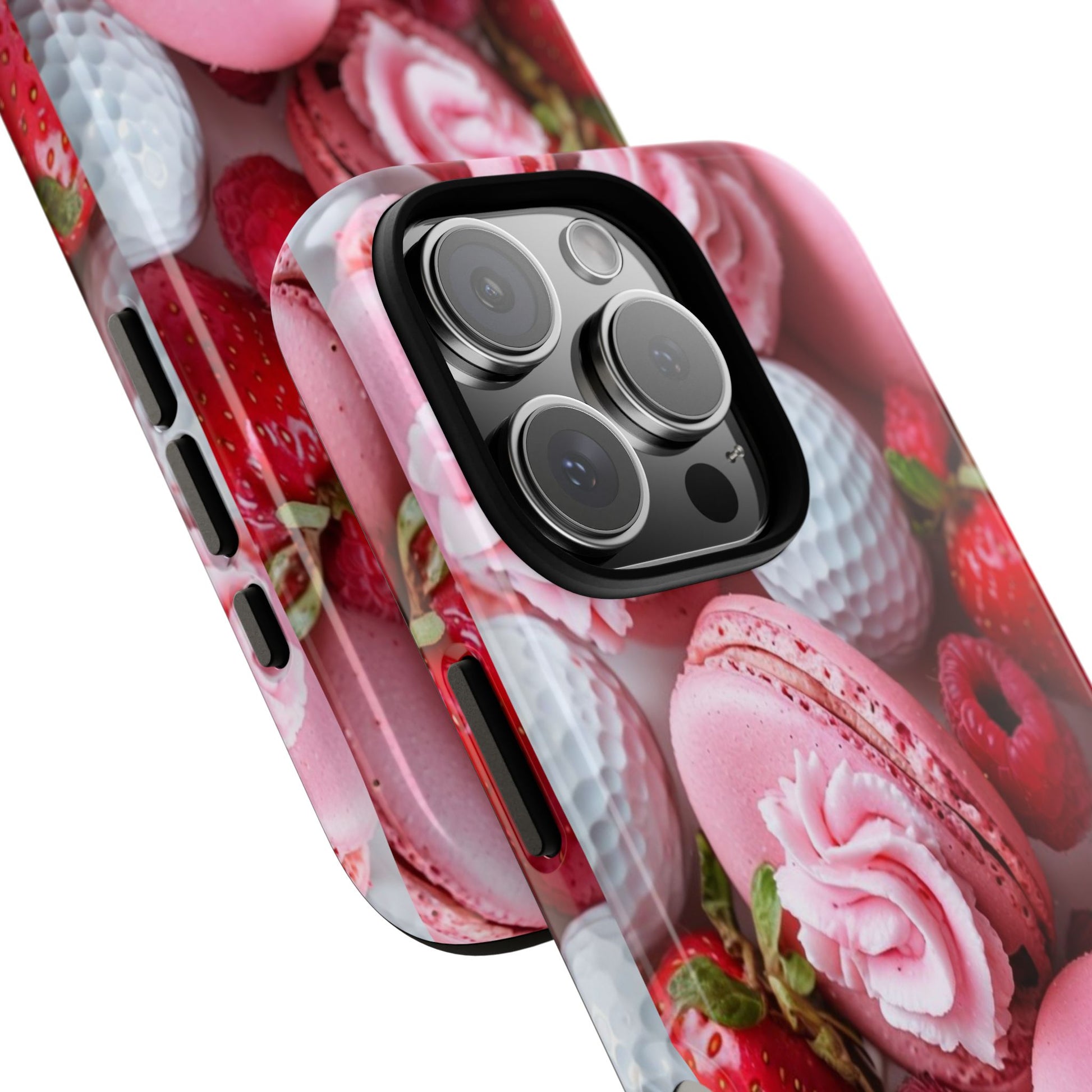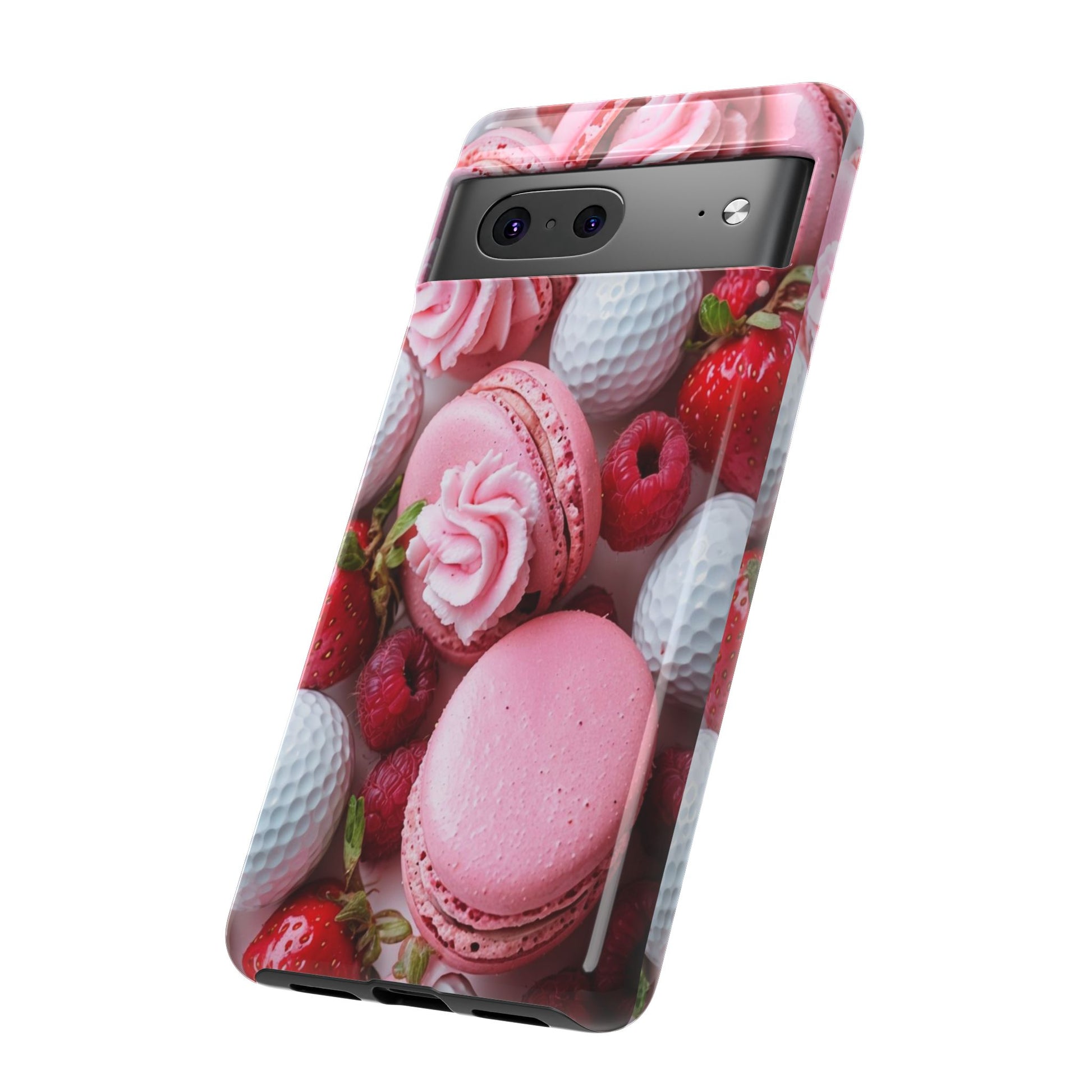 Introducing a vibrant phone case that not only protects your device but also adds a splash of joy to your daily life. Featuring a delightful design of pink macarons, strawberries, and golf balls, this phone case embodies a playful and cheerful atmosphere, perfect for anyone who loves to stand out while keeping their phone safe. Ideal for food lovers, golf enthusiasts, or anyone with a sweet tooth, this case makes a thoughtful gift for birthdays, holidays, or just because. Its aesthetic is perfect for spring and summer celebrations, lending a light-hearted vibe that matches the season's energy.