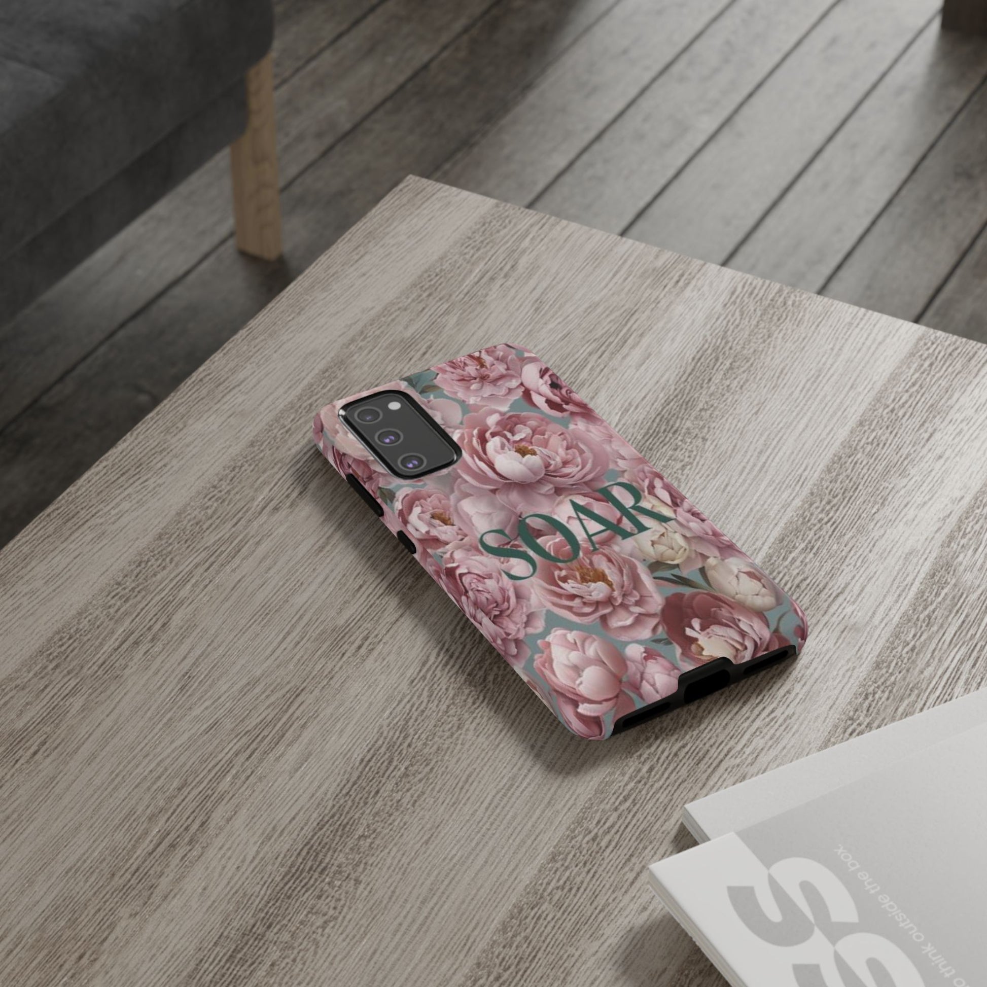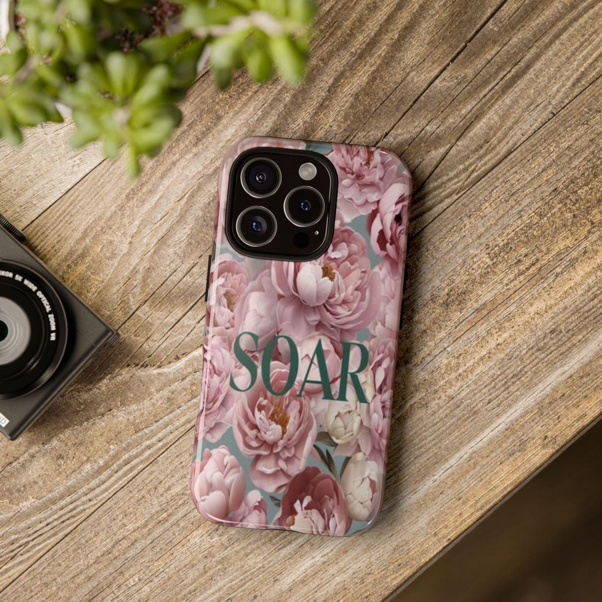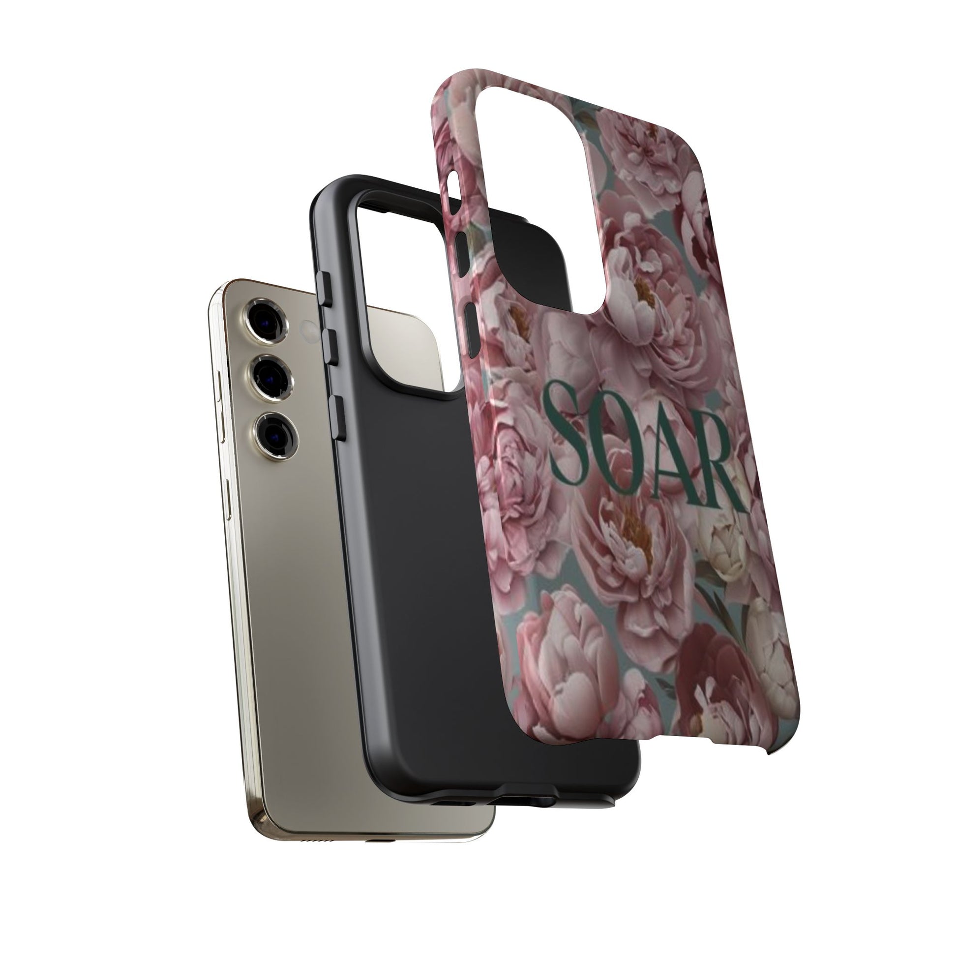 A slim, protective phone case wrapped in a painterly bloom of dusty-pink peonies and soft green foliage. The word “SOAR” sits in an elegant, serif font at the center — a quiet daily nudge toward confidence and calm. The dual-layer construction pairs a glossy or matte outer shell with a premium TPU silicone liner, so the case feels smooth in hand while cushioning against shocks and drops. The full-wrap, high-density print preserves every petal and subtle color shift, and UV protection helps keep the artwork from fading. It’s a refined everyday shield that blends floral romance with practical durability, made for people who carry both beauty and function in their pockets.