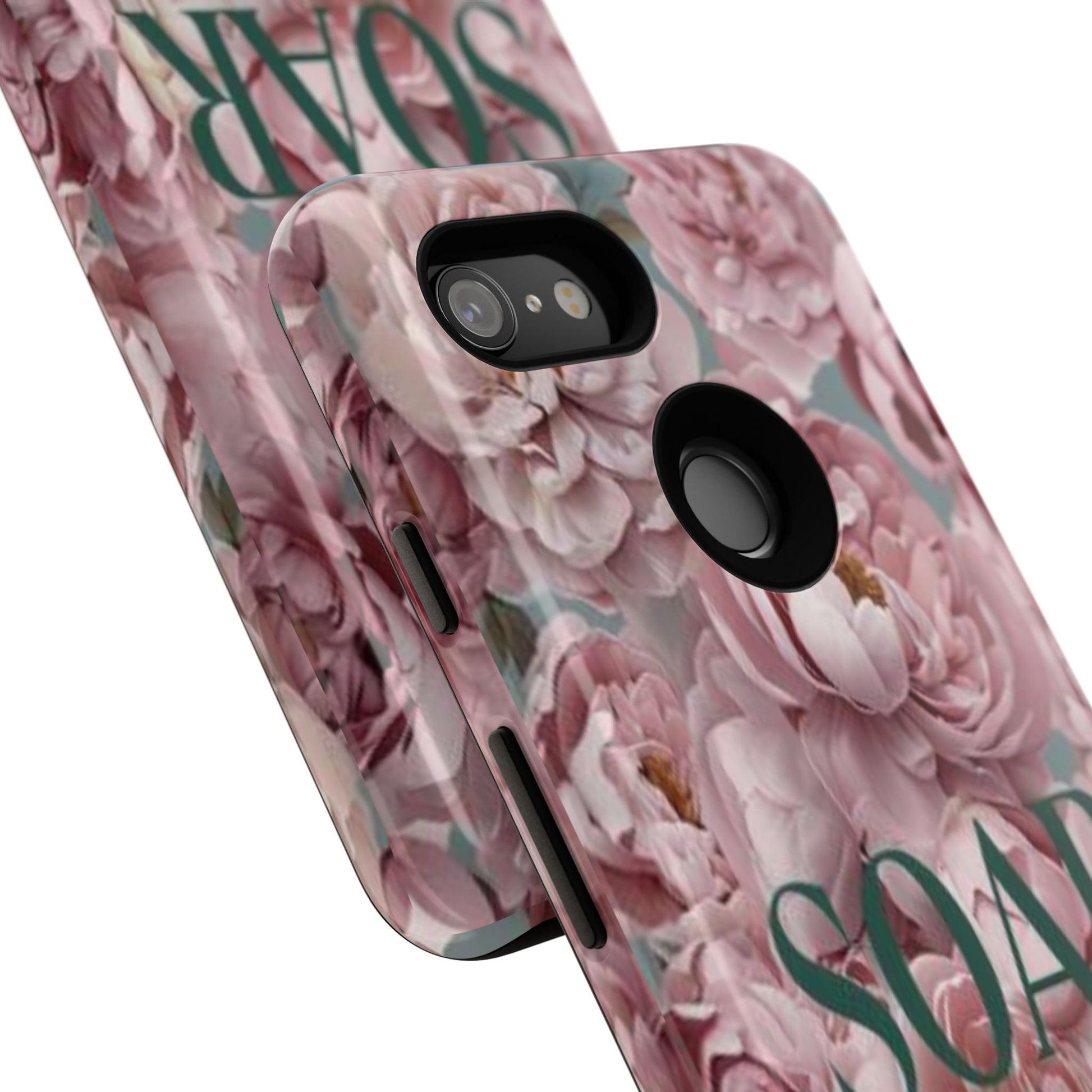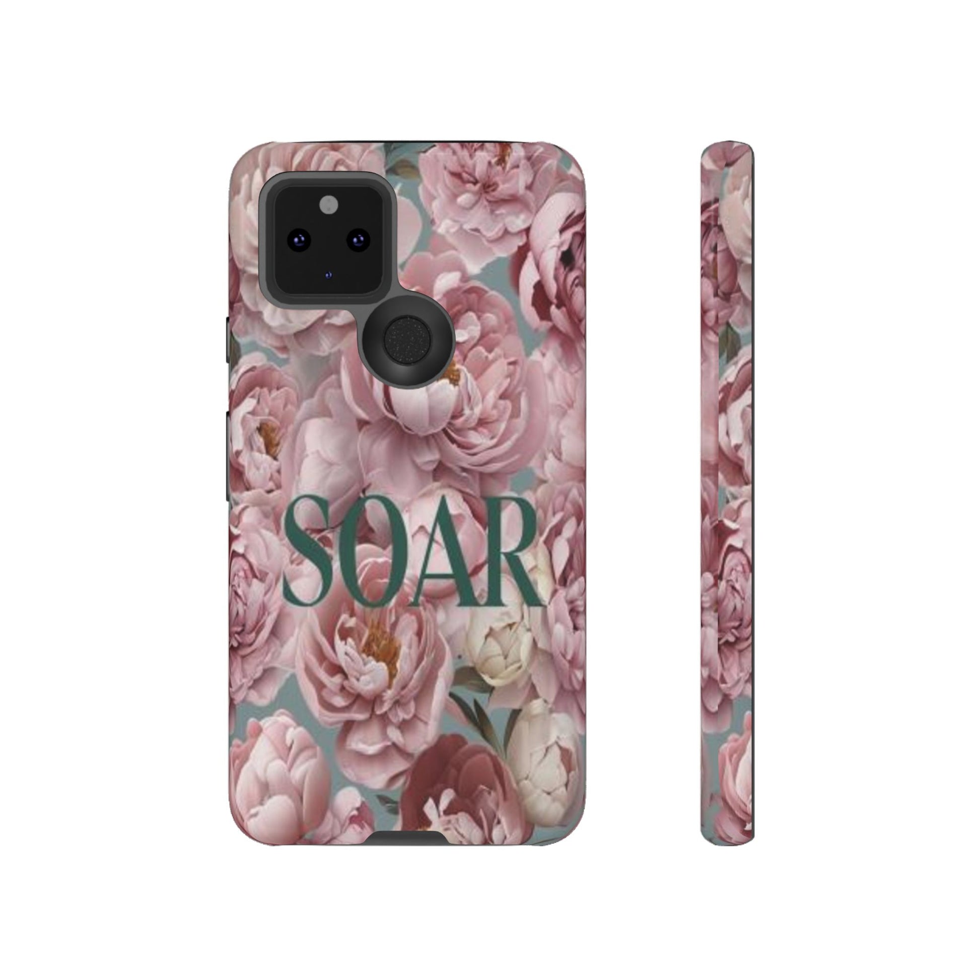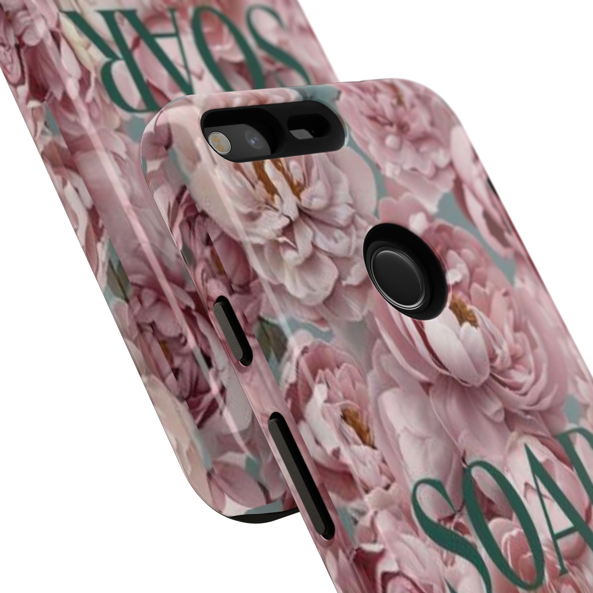 A slim, protective phone case wrapped in a painterly bloom of dusty-pink peonies and soft green foliage. The word “SOAR” sits in an elegant, serif font at the center — a quiet daily nudge toward confidence and calm. The dual-layer construction pairs a glossy or matte outer shell with a premium TPU silicone liner, so the case feels smooth in hand while cushioning against shocks and drops. The full-wrap, high-density print preserves every petal and subtle color shift, and UV protection helps keep the artwork from fading. It’s a refined everyday shield that blends floral romance with practical durability, made for people who carry both beauty and function in their pockets.