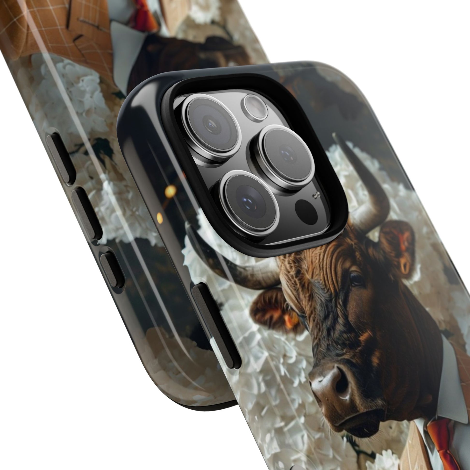 Amidst a flourishing garden of hydrangeas, a bull stands tall, adorned in a tailored suit and crisp tie. Sophistication and the wild blur.