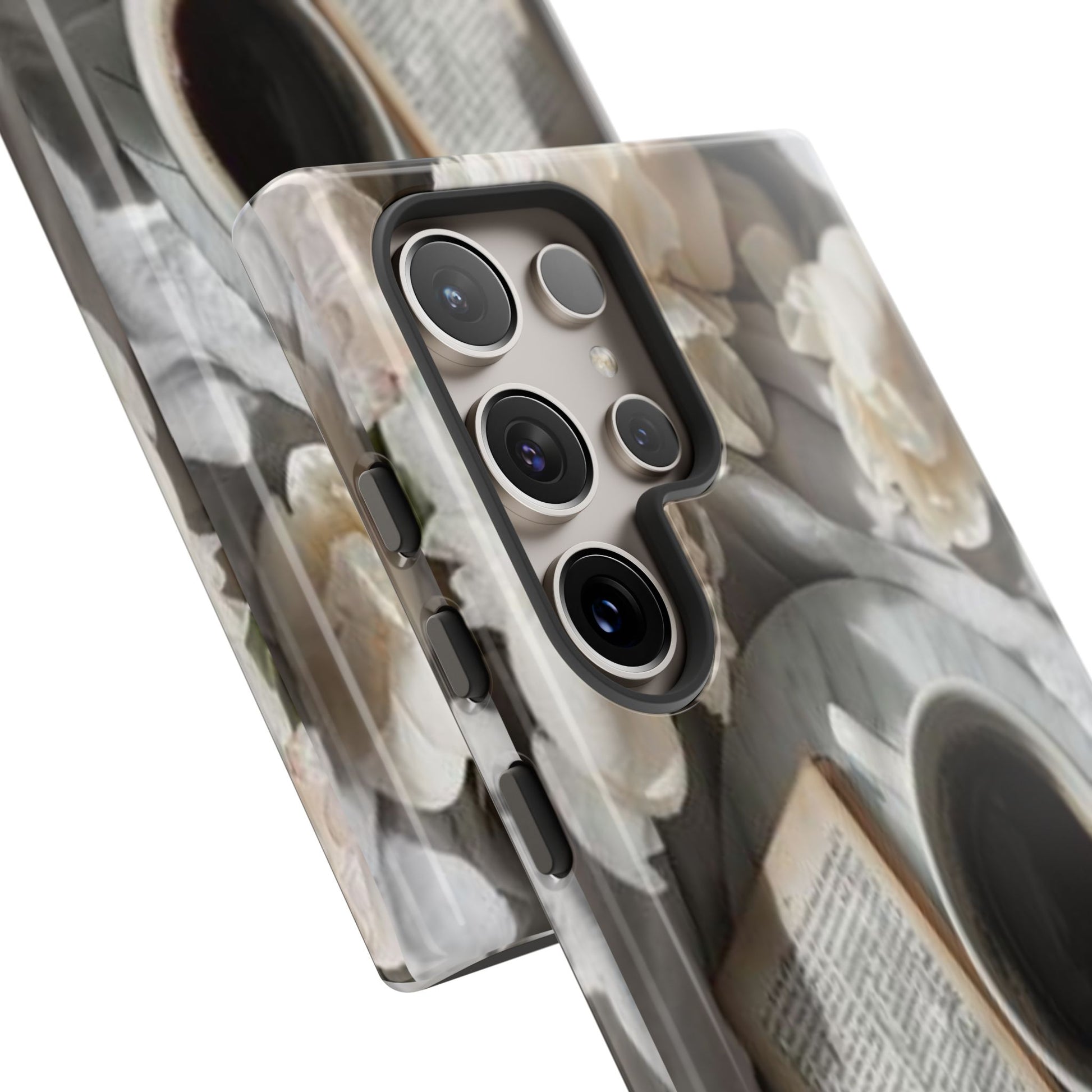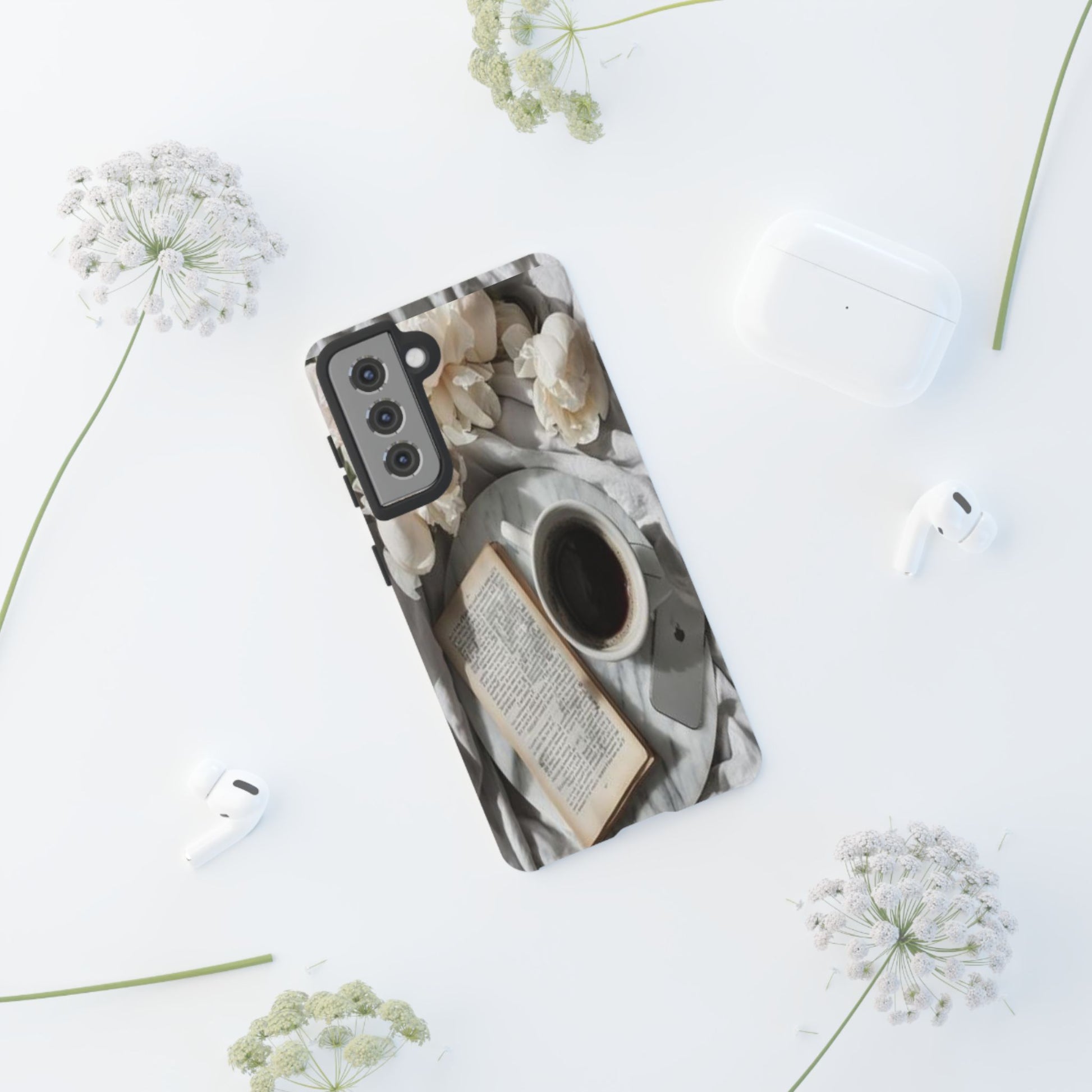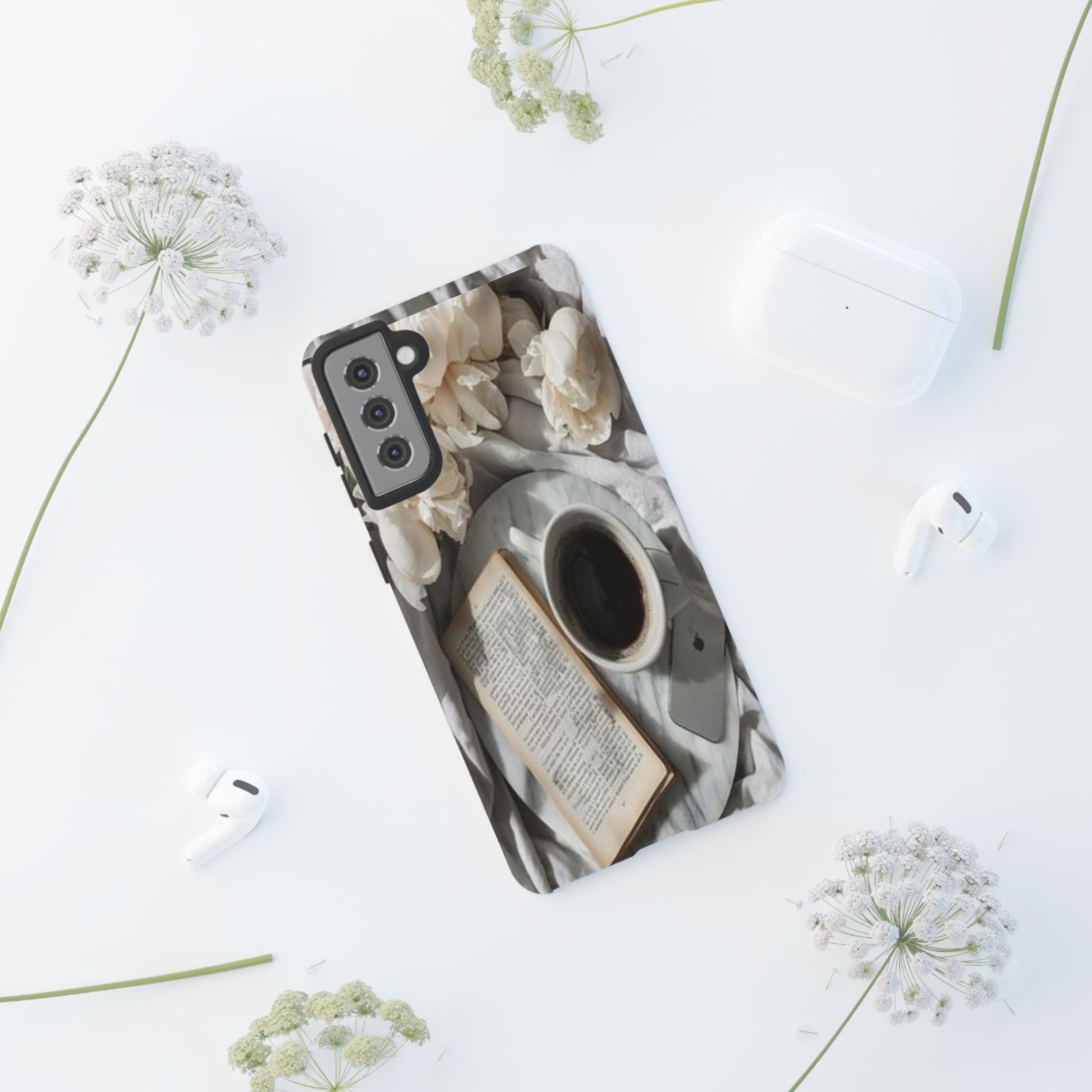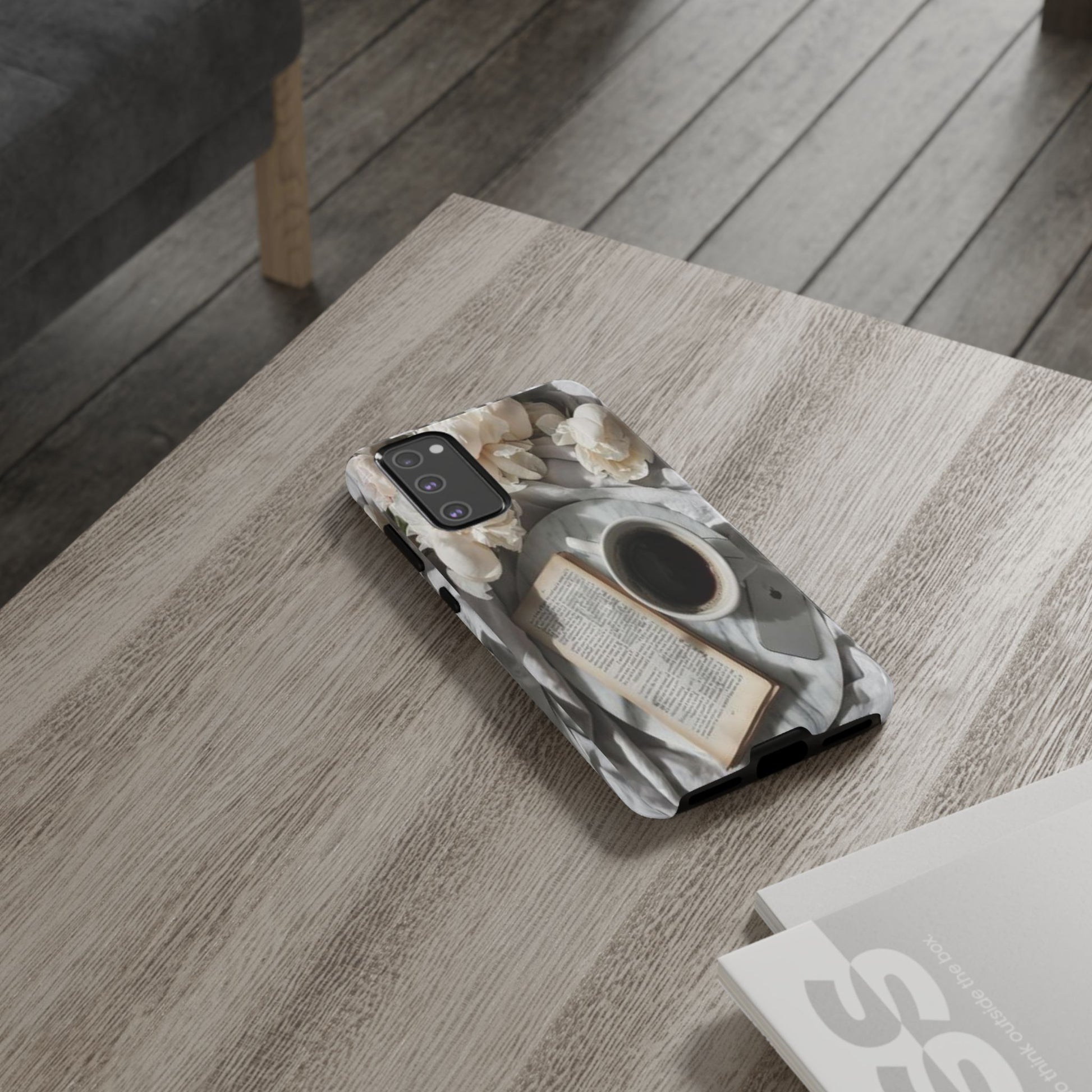 A slim, protective phone case wrapped in a soft, vintage-influenced print: a steaming cup of coffee, an open book, and pale blooms arranged on crinkled linen. The image is transferred edge-to-edge with rich ink density for a tactile, continuous look. Under the print, a dual-layer construction — a hard polycarbonate shell and a shock-absorbing TPU silicone liner — guards against drops and everyday bumps while keeping ports accessible. The finish options let you choose a glossy sheen or a muted matte. Lightweight and compatible with wireless charging, this case feels like a warm morning ritual in your hand whenever you reach for your phone.