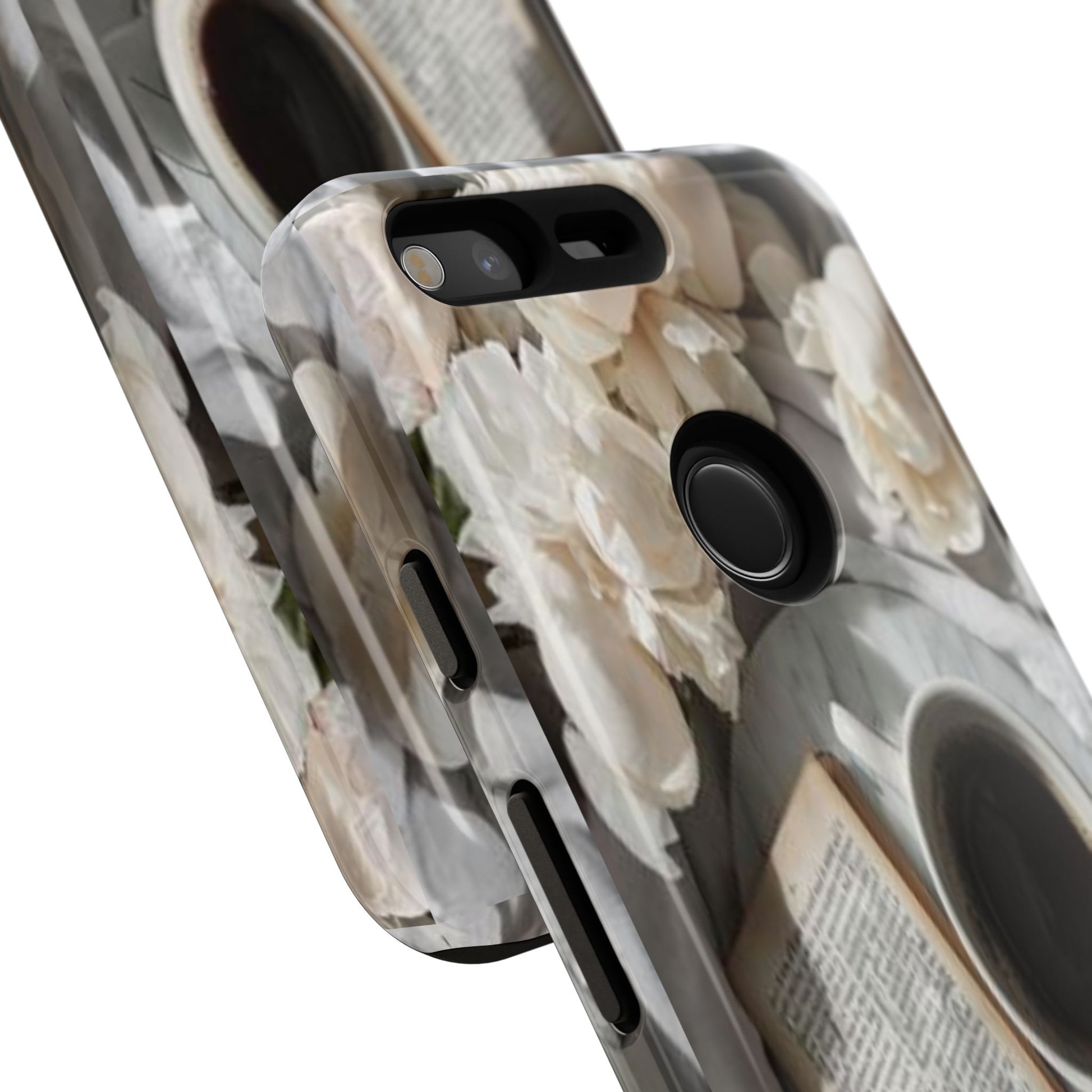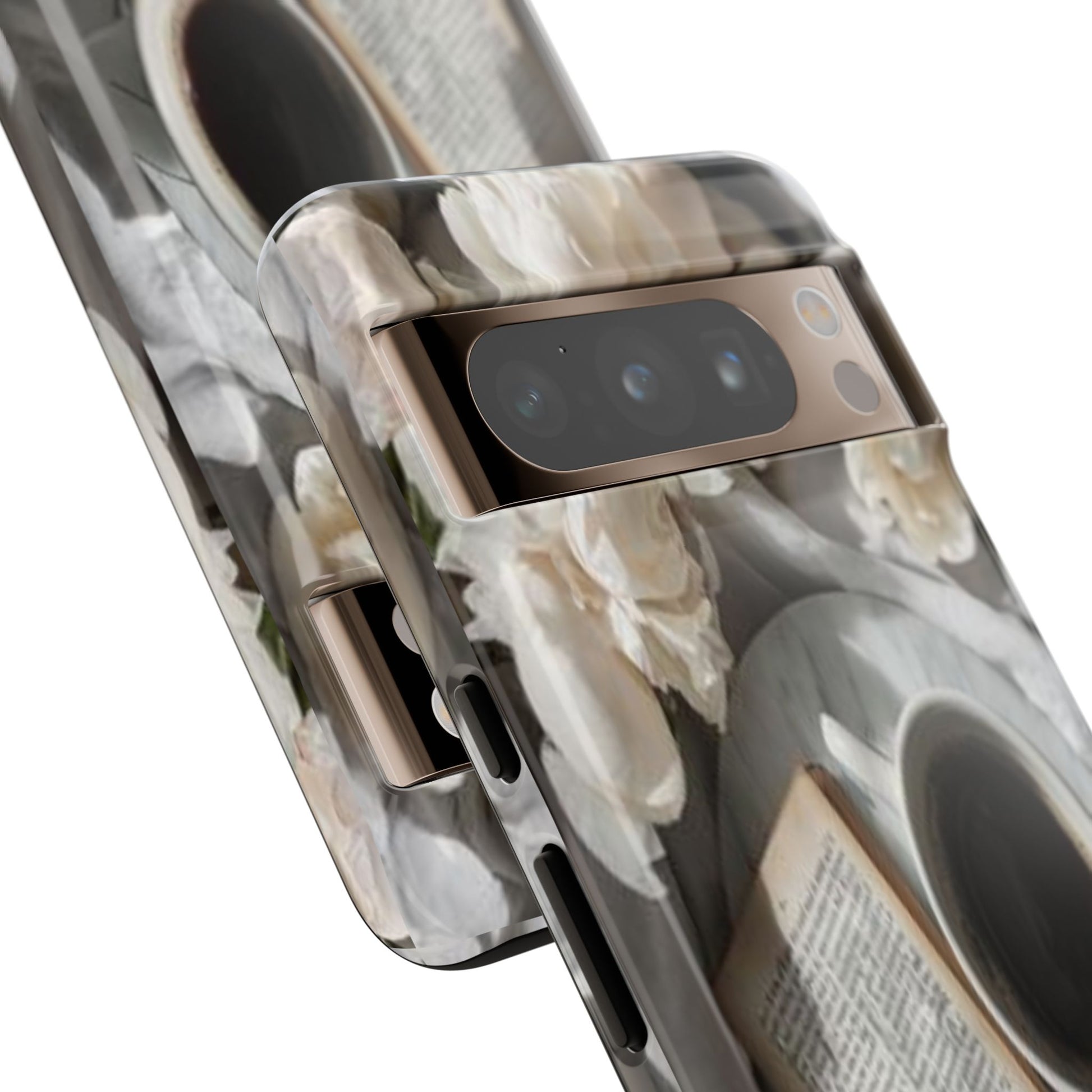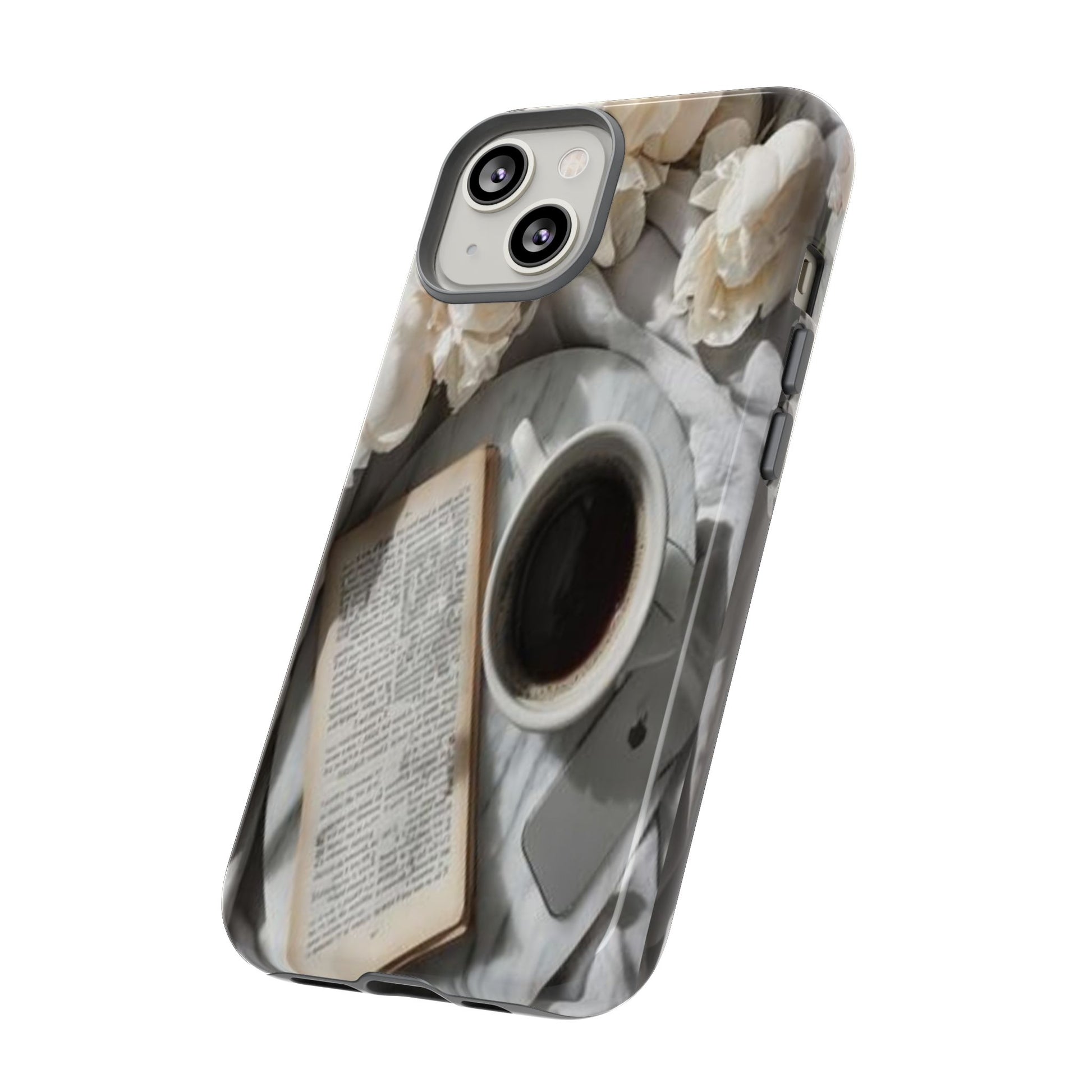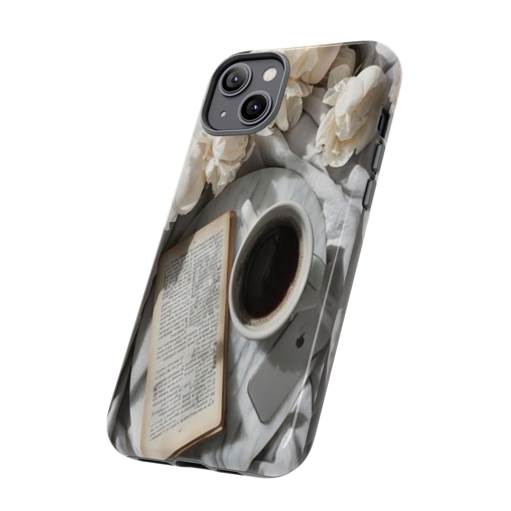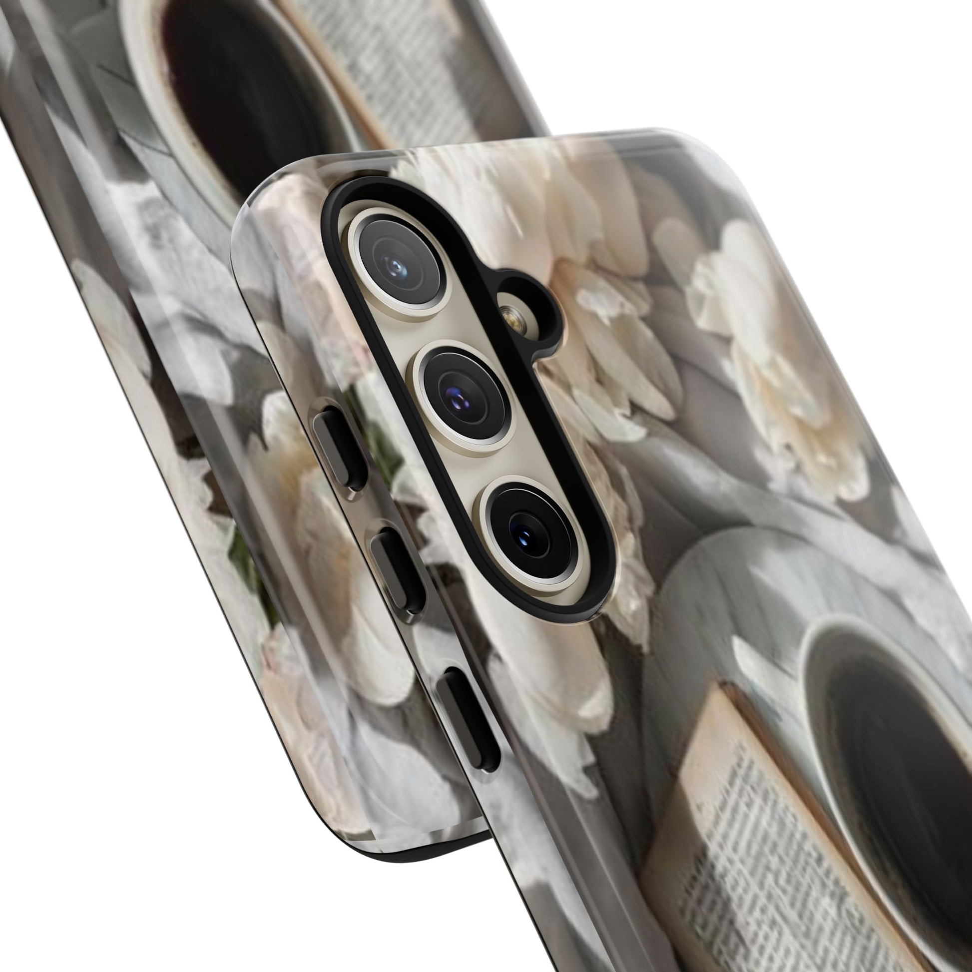 A slim, protective phone case wrapped in a soft, vintage-influenced print: a steaming cup of coffee, an open book, and pale blooms arranged on crinkled linen. The image is transferred edge-to-edge with rich ink density for a tactile, continuous look. Under the print, a dual-layer construction — a hard polycarbonate shell and a shock-absorbing TPU silicone liner — guards against drops and everyday bumps while keeping ports accessible. The finish options let you choose a glossy sheen or a muted matte. Lightweight and compatible with wireless charging, this case feels like a warm morning ritual in your hand whenever you reach for your phone.