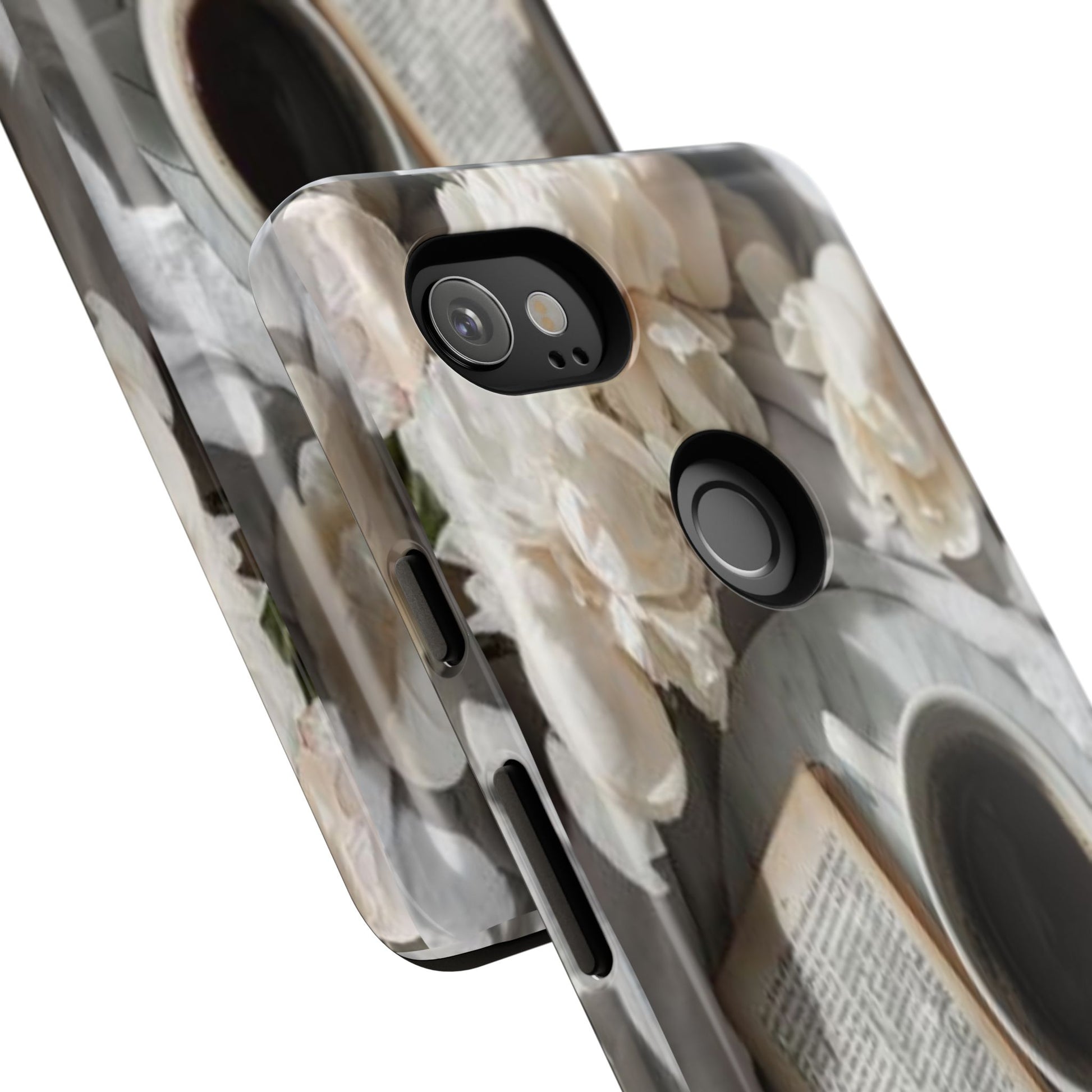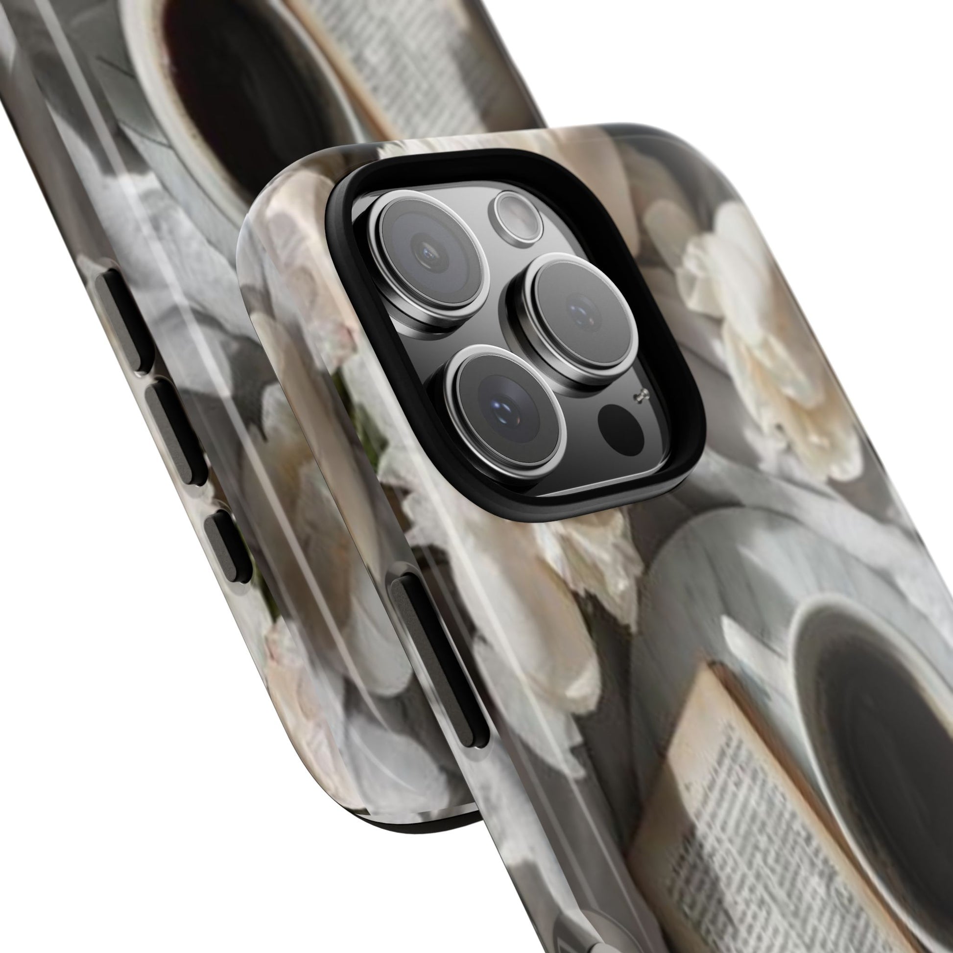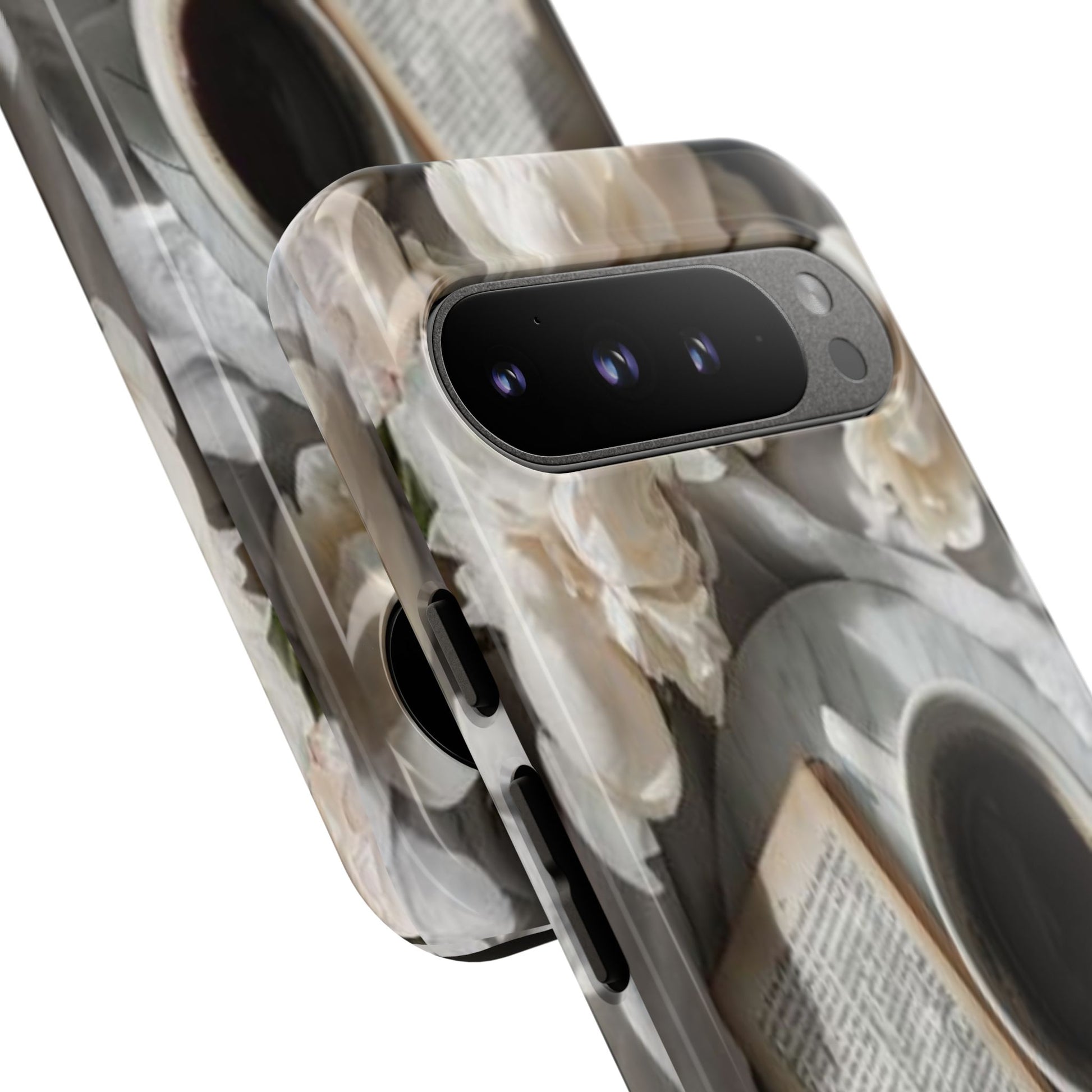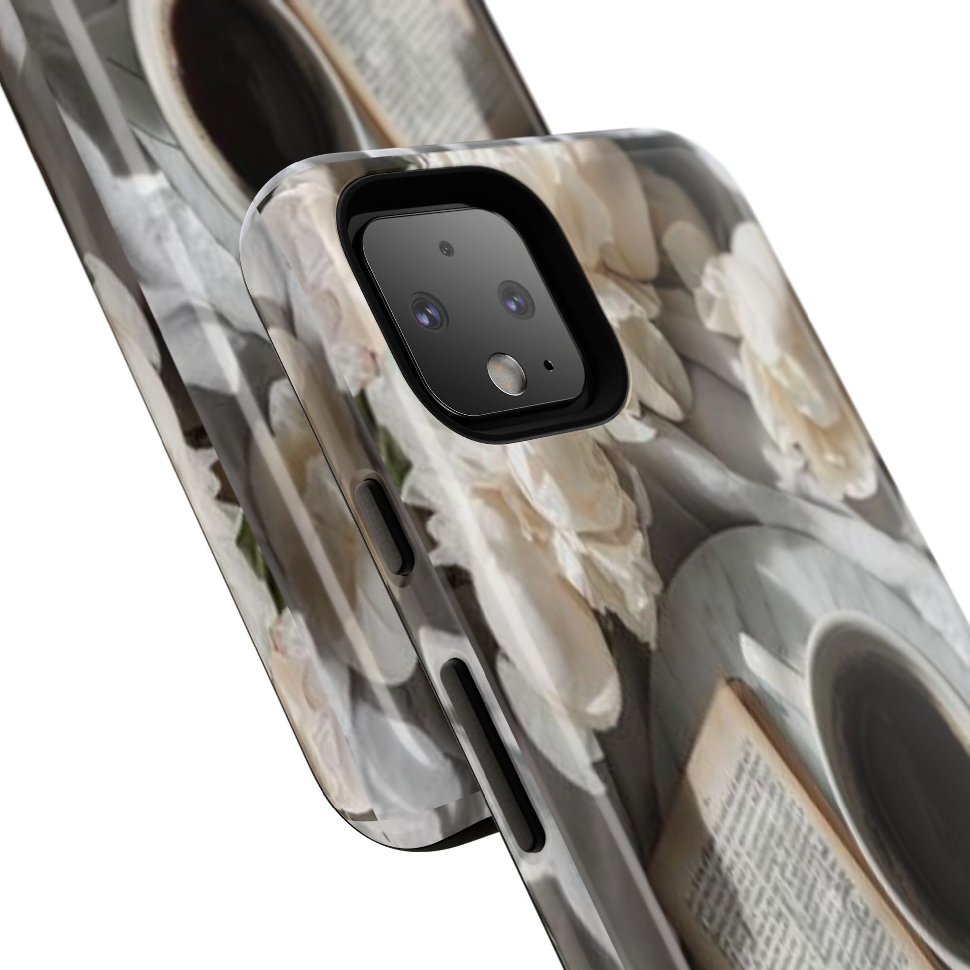 A slim, protective phone case wrapped in a soft, vintage-influenced print: a steaming cup of coffee, an open book, and pale blooms arranged on crinkled linen. The image is transferred edge-to-edge with rich ink density for a tactile, continuous look. Under the print, a dual-layer construction — a hard polycarbonate shell and a shock-absorbing TPU silicone liner — guards against drops and everyday bumps while keeping ports accessible. The finish options let you choose a glossy sheen or a muted matte. Lightweight and compatible with wireless charging, this case feels like a warm morning ritual in your hand whenever you reach for your phone.