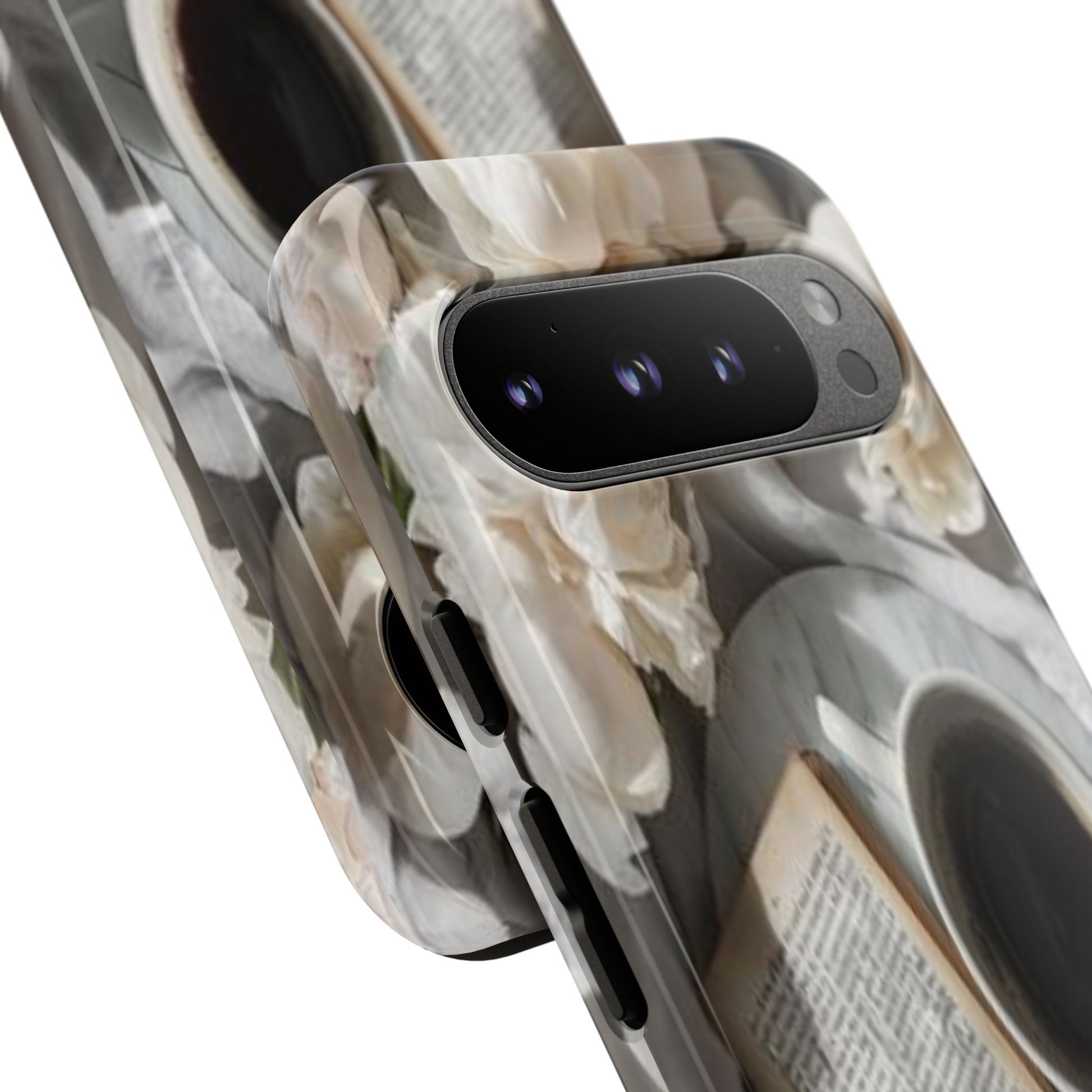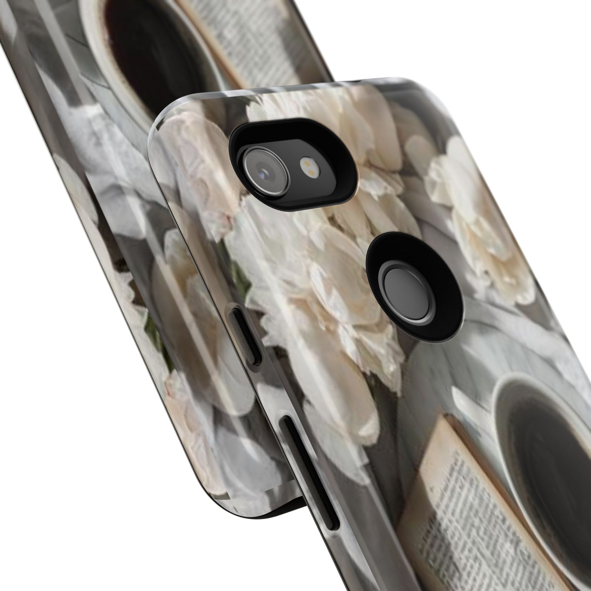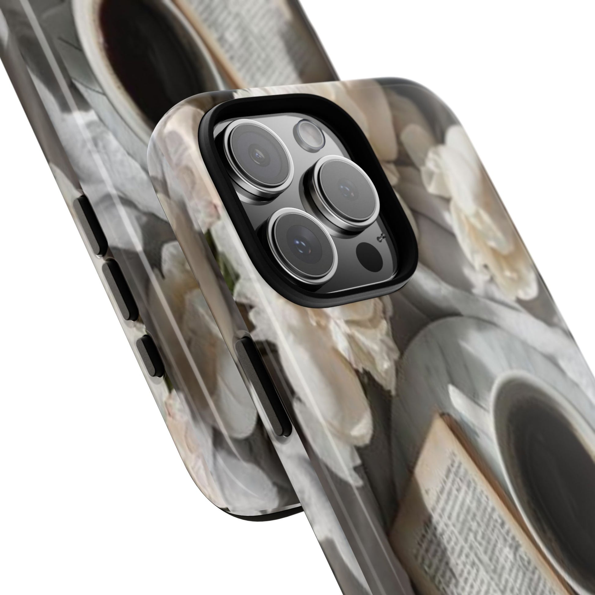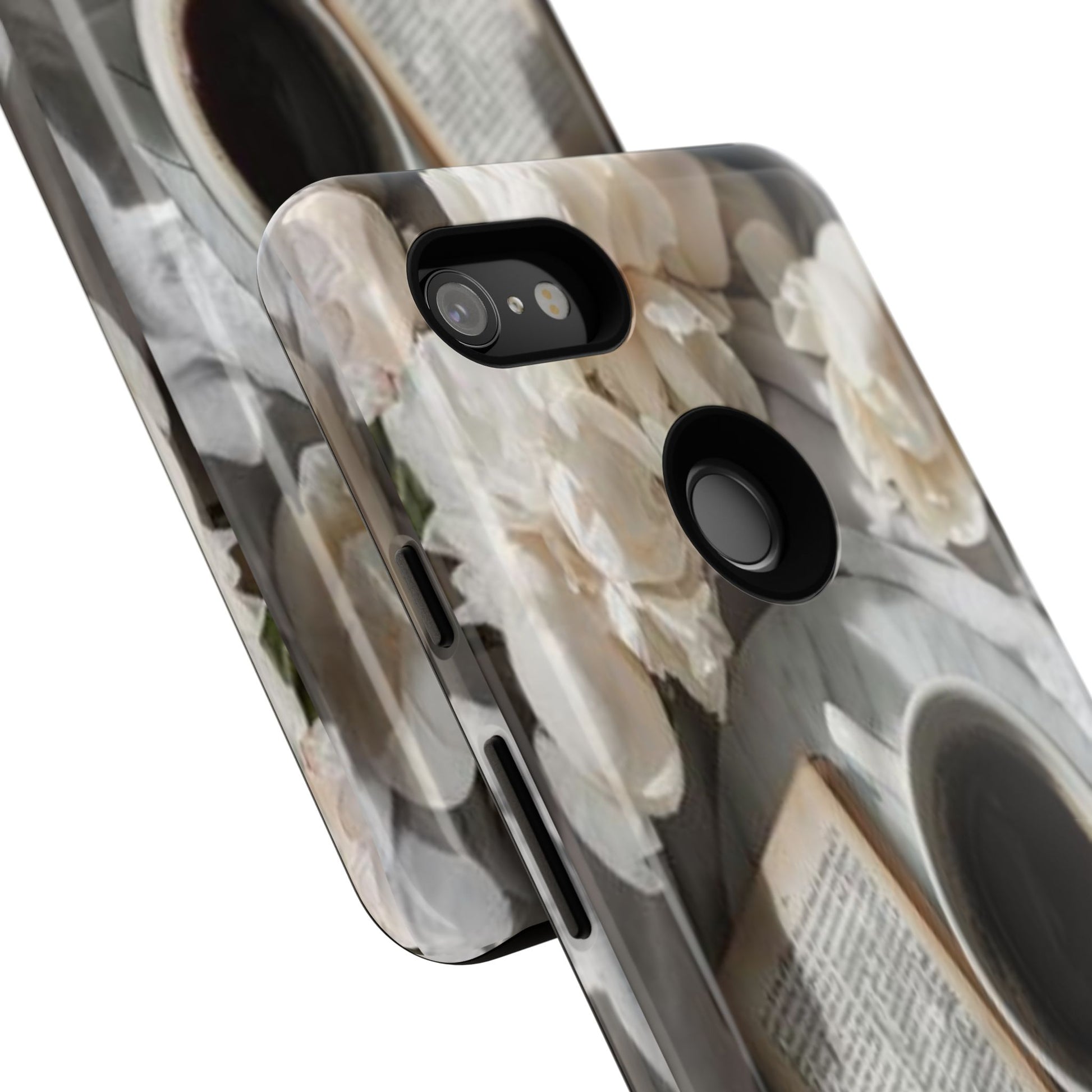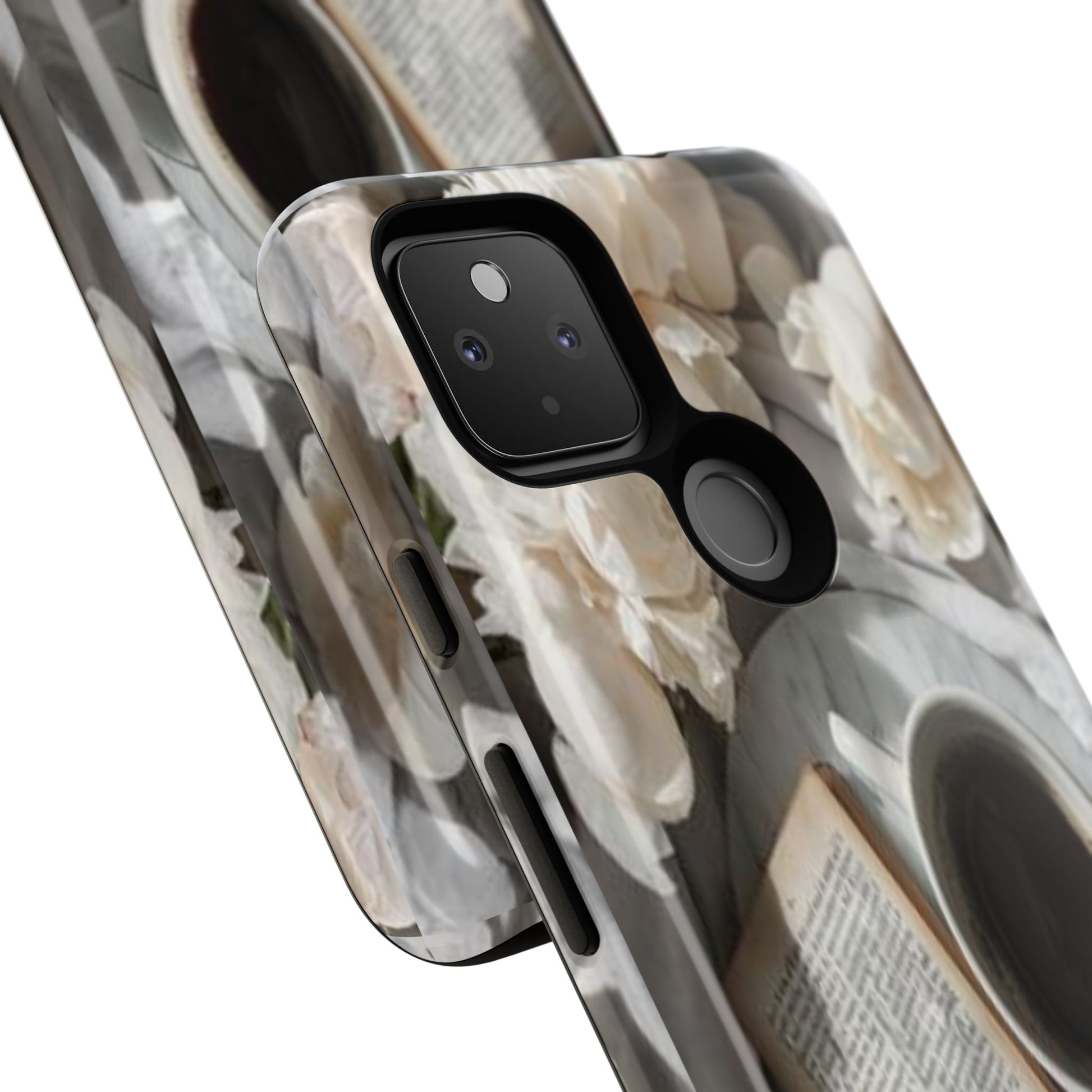 A slim, protective phone case wrapped in a soft, vintage-influenced print: a steaming cup of coffee, an open book, and pale blooms arranged on crinkled linen. The image is transferred edge-to-edge with rich ink density for a tactile, continuous look. Under the print, a dual-layer construction — a hard polycarbonate shell and a shock-absorbing TPU silicone liner — guards against drops and everyday bumps while keeping ports accessible. The finish options let you choose a glossy sheen or a muted matte. Lightweight and compatible with wireless charging, this case feels like a warm morning ritual in your hand whenever you reach for your phone.