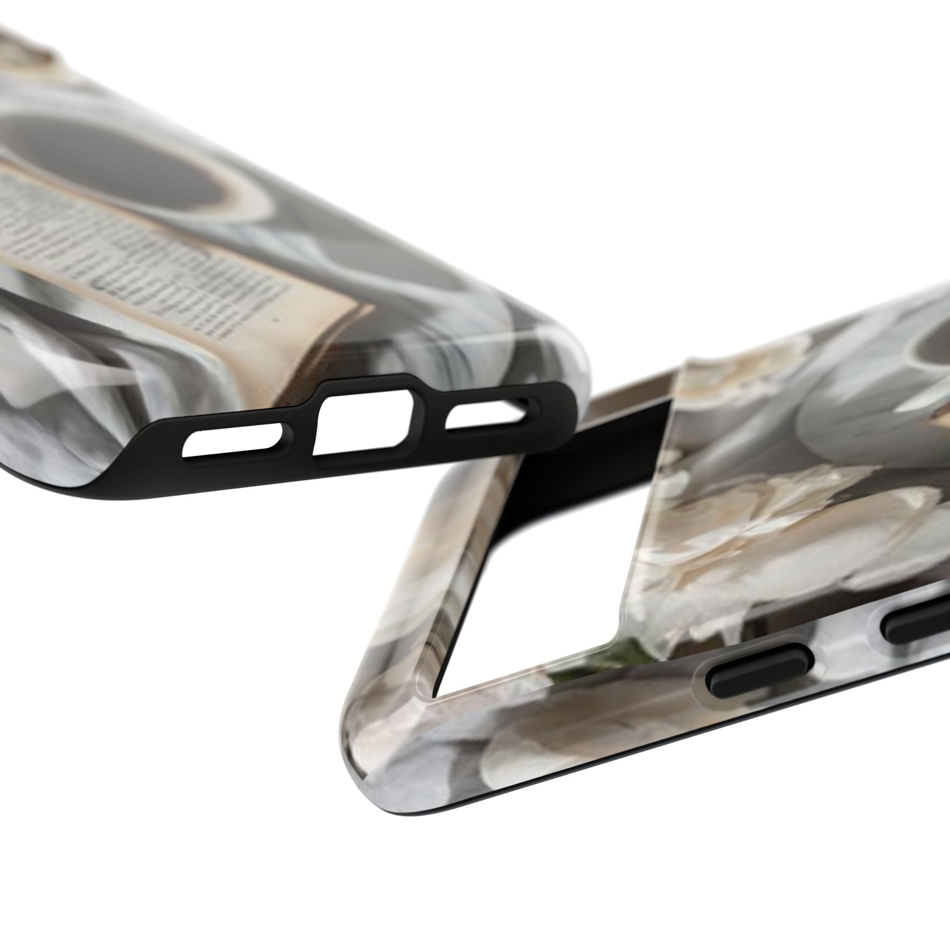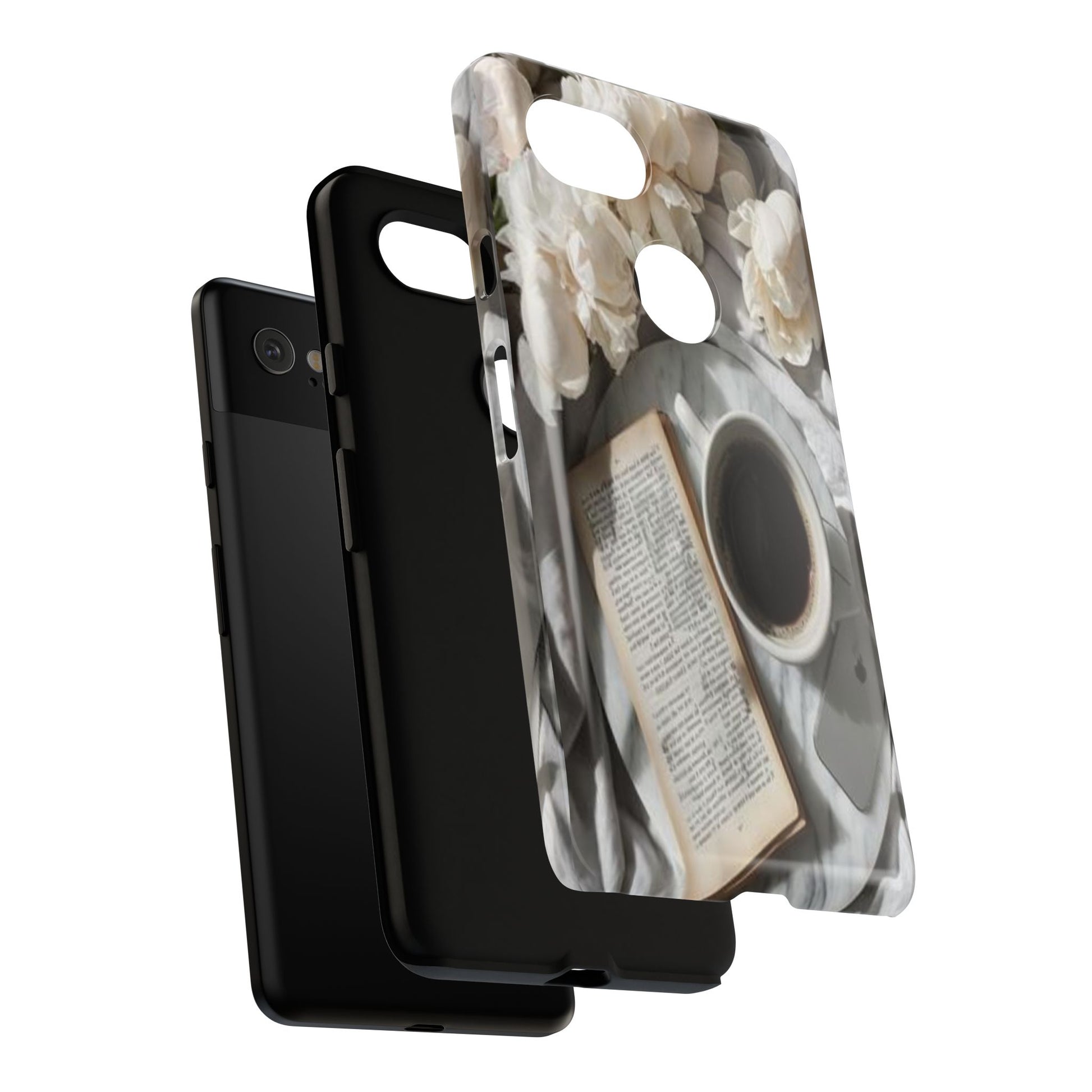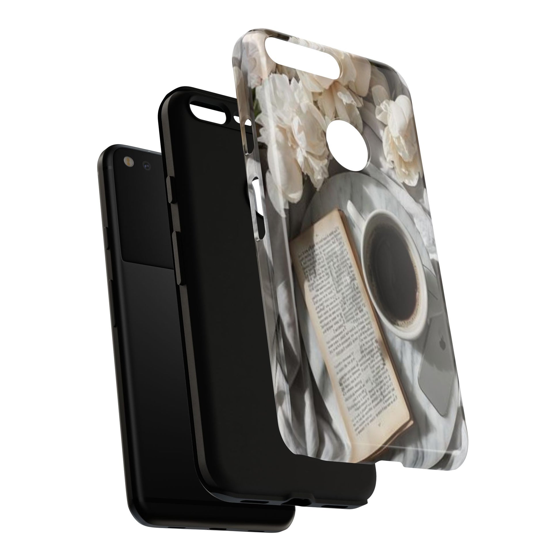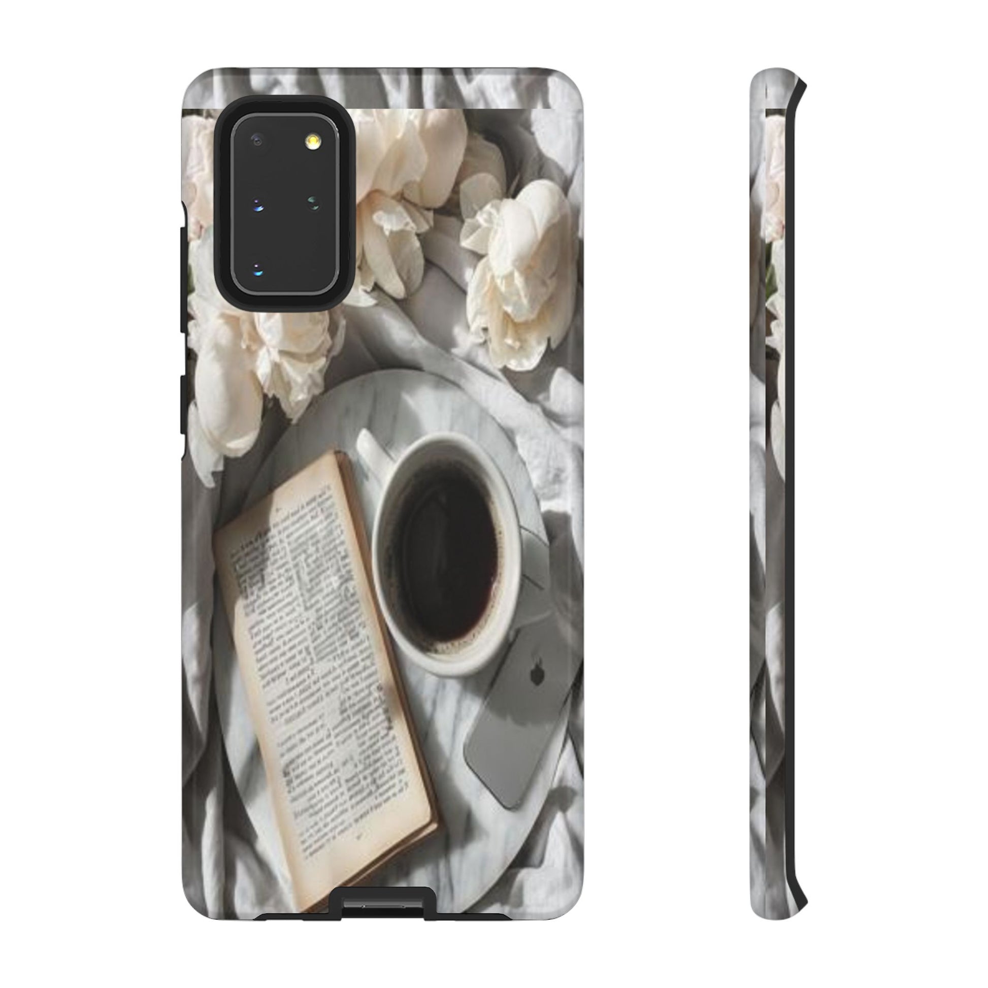 A slim, protective phone case wrapped in a soft, vintage-influenced print: a steaming cup of coffee, an open book, and pale blooms arranged on crinkled linen. The image is transferred edge-to-edge with rich ink density for a tactile, continuous look. Under the print, a dual-layer construction — a hard polycarbonate shell and a shock-absorbing TPU silicone liner — guards against drops and everyday bumps while keeping ports accessible. The finish options let you choose a glossy sheen or a muted matte. Lightweight and compatible with wireless charging, this case feels like a warm morning ritual in your hand whenever you reach for your phone.